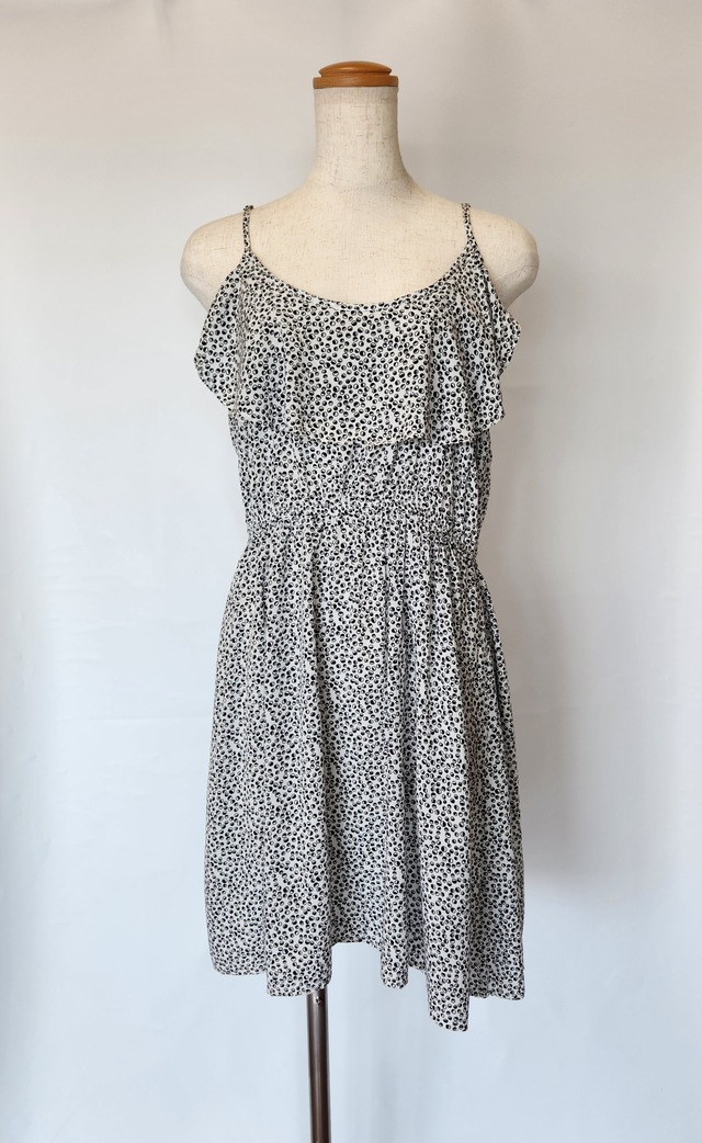 小さな白と黒の丸模様と胸元のフリルがかわいいワンピース。肩紐は長さ調節ができます。ウエストはゴムで伸縮します。ポケットはありません。 ☆素材 表地:ビスコース100% ☆コンディション A 汚れ等ありませんが、古着であることをご理解いただきご不明な点がございましたらお問い合わせください。 ☆ブランド COTTON ON ☆size M 総丈:約94cm(肩紐約10cm調節できます) 身幅:約40cm ウエスト: 約64cm ☆マネキン:9号 モデル身長161cm ※画像は実際の色合いとは異なって見える場合があります。 ※店舗に在庫がない場合がございます。実物をご来店にてご覧になられたい場合はお手数ですが、事前にご連絡をお願いいたします。