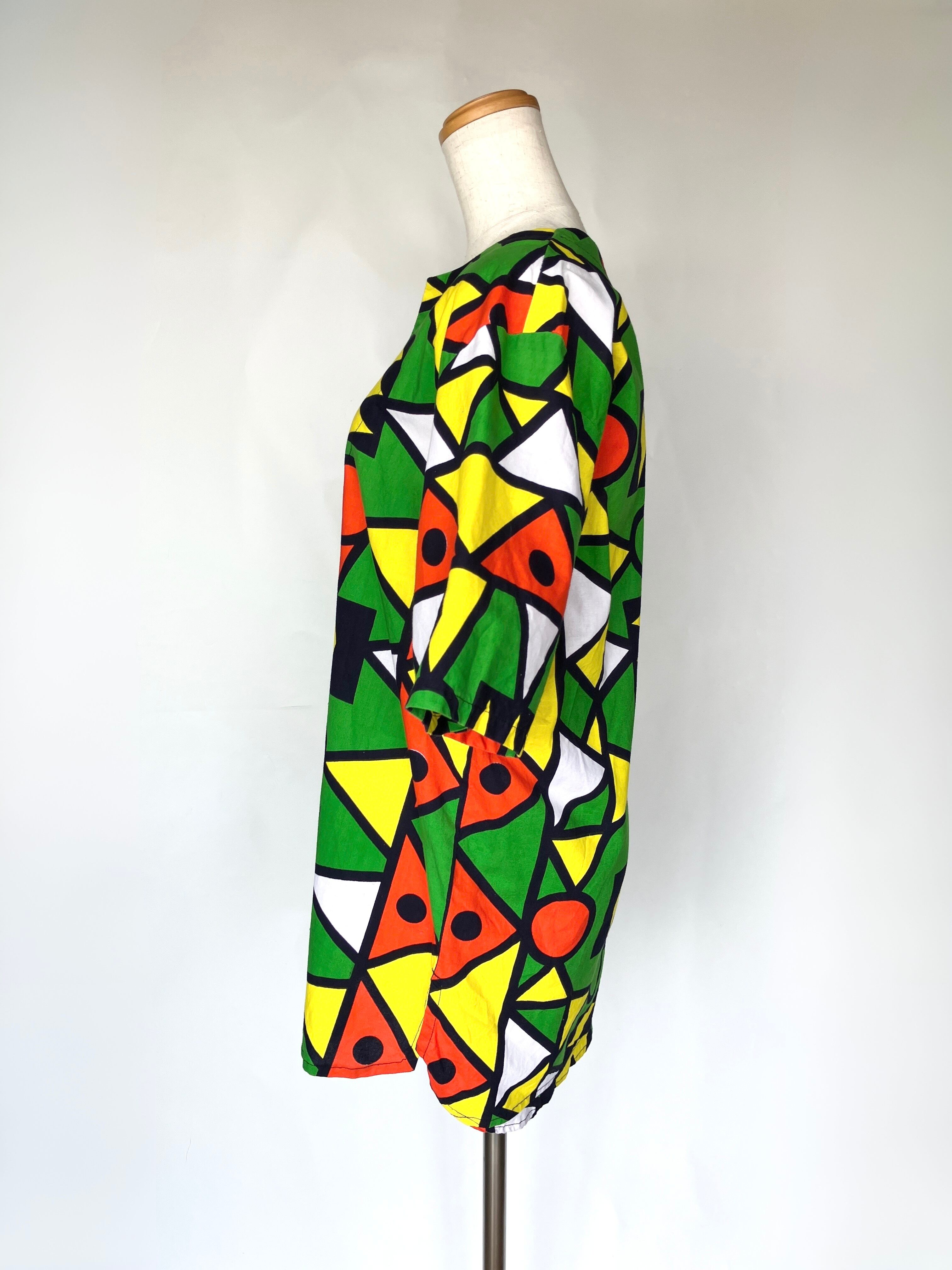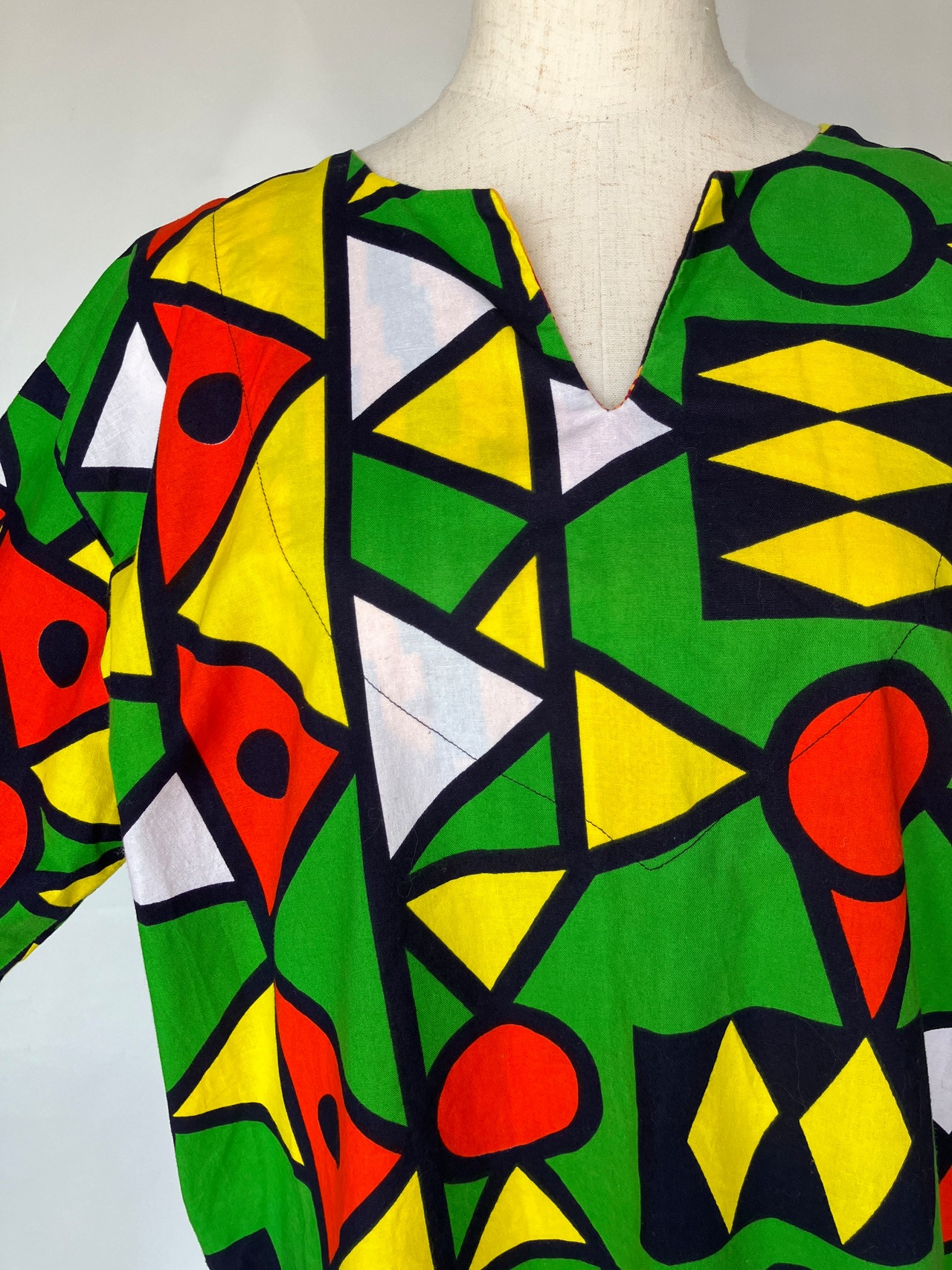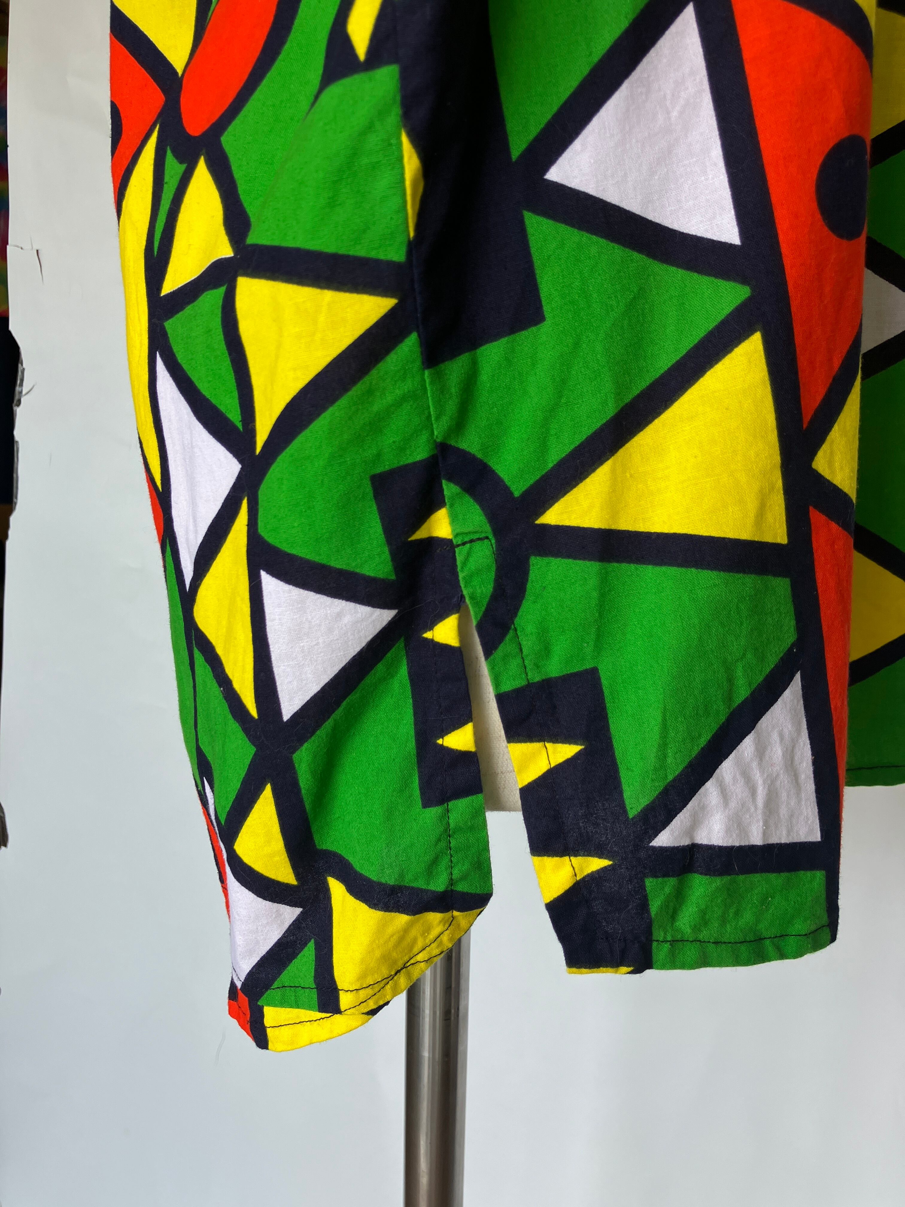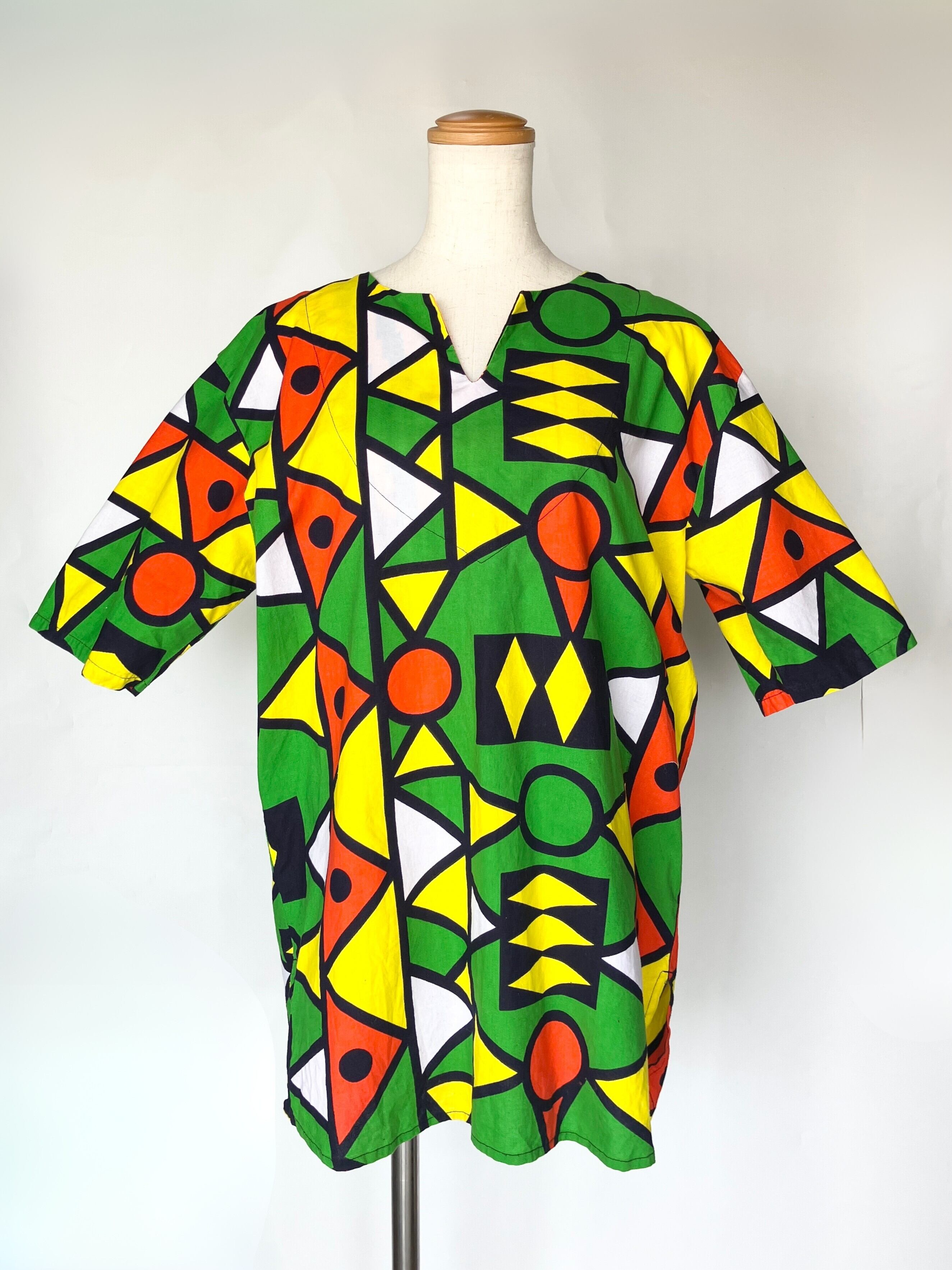 鮮やかなグリーン・イエロー・レッドが目を引く、ブラジルらしい色彩に惹かれました。大胆な幾何学模様とゆったりめのシルエット、サイドスリット入りのデザインも魅力です。