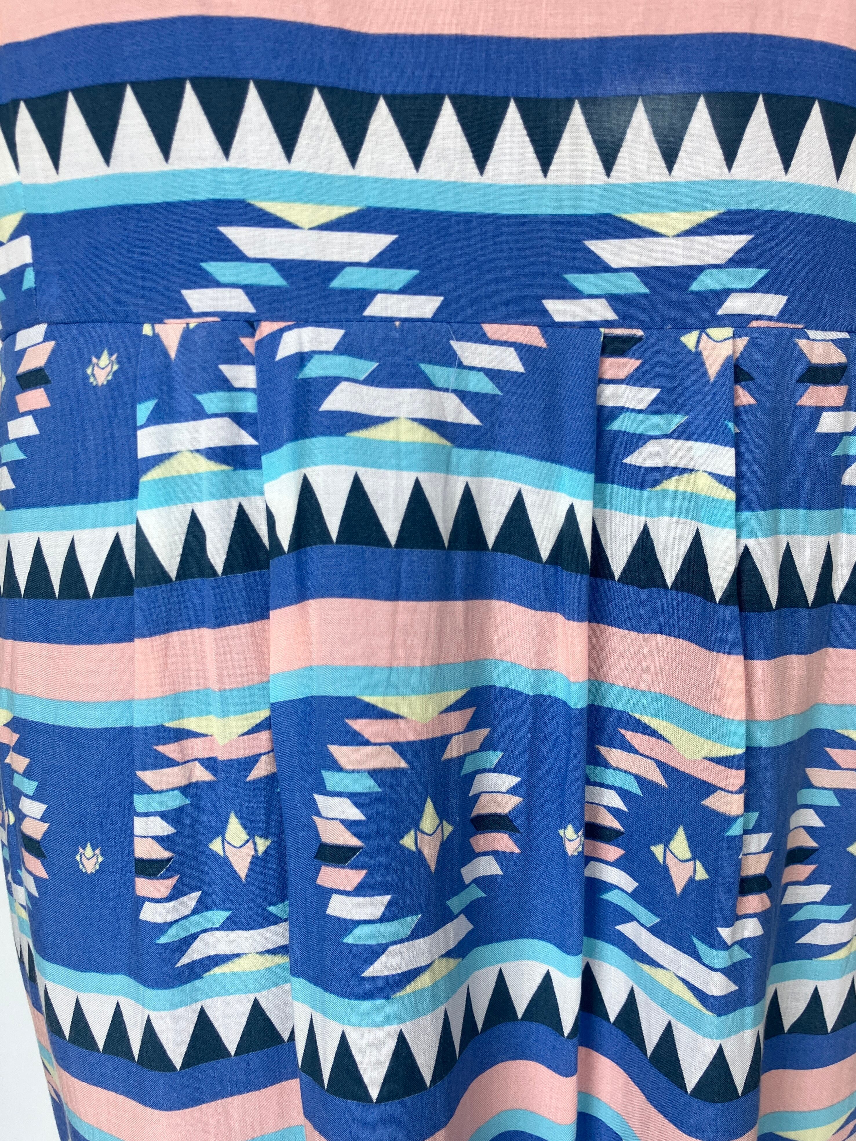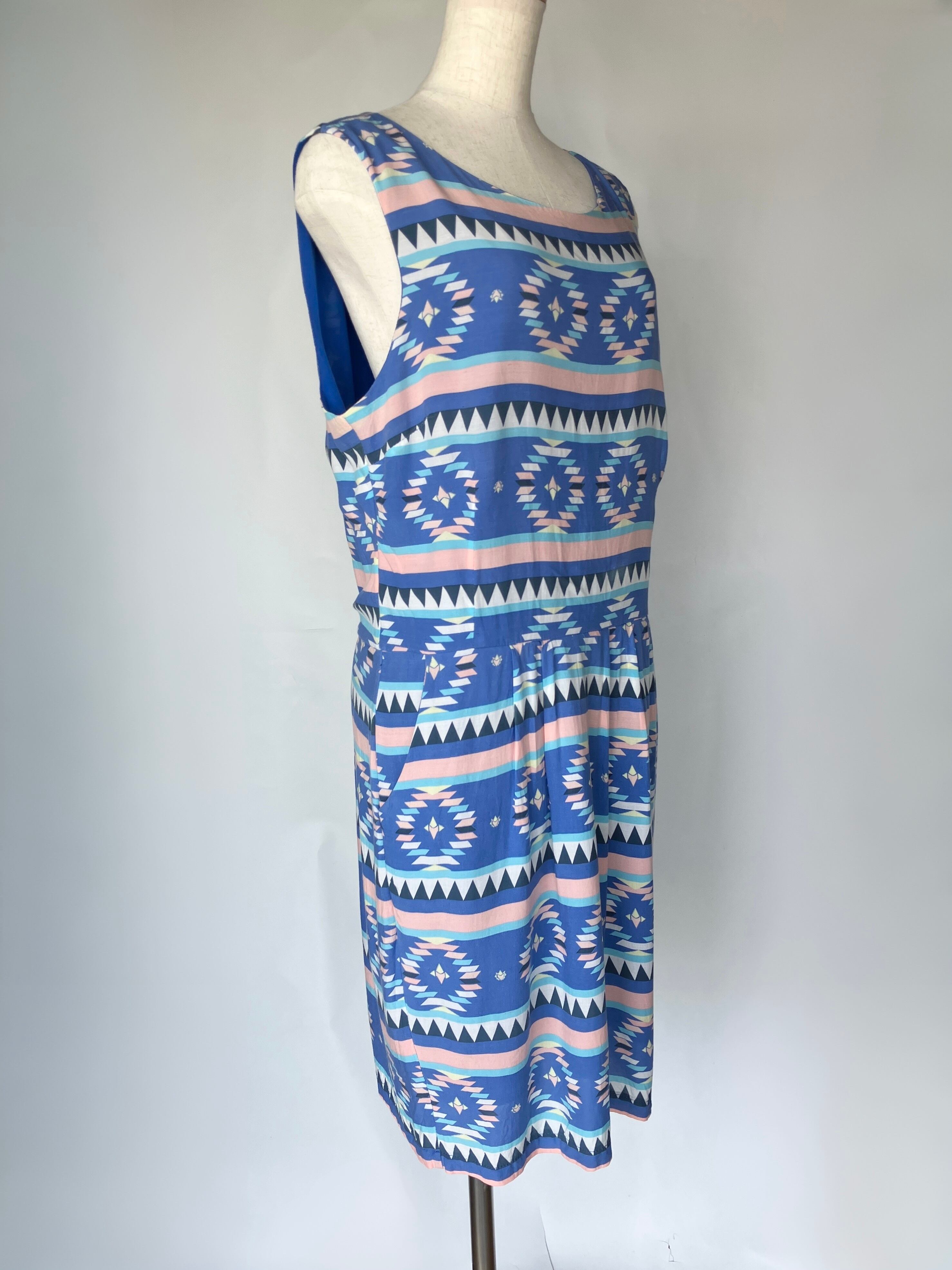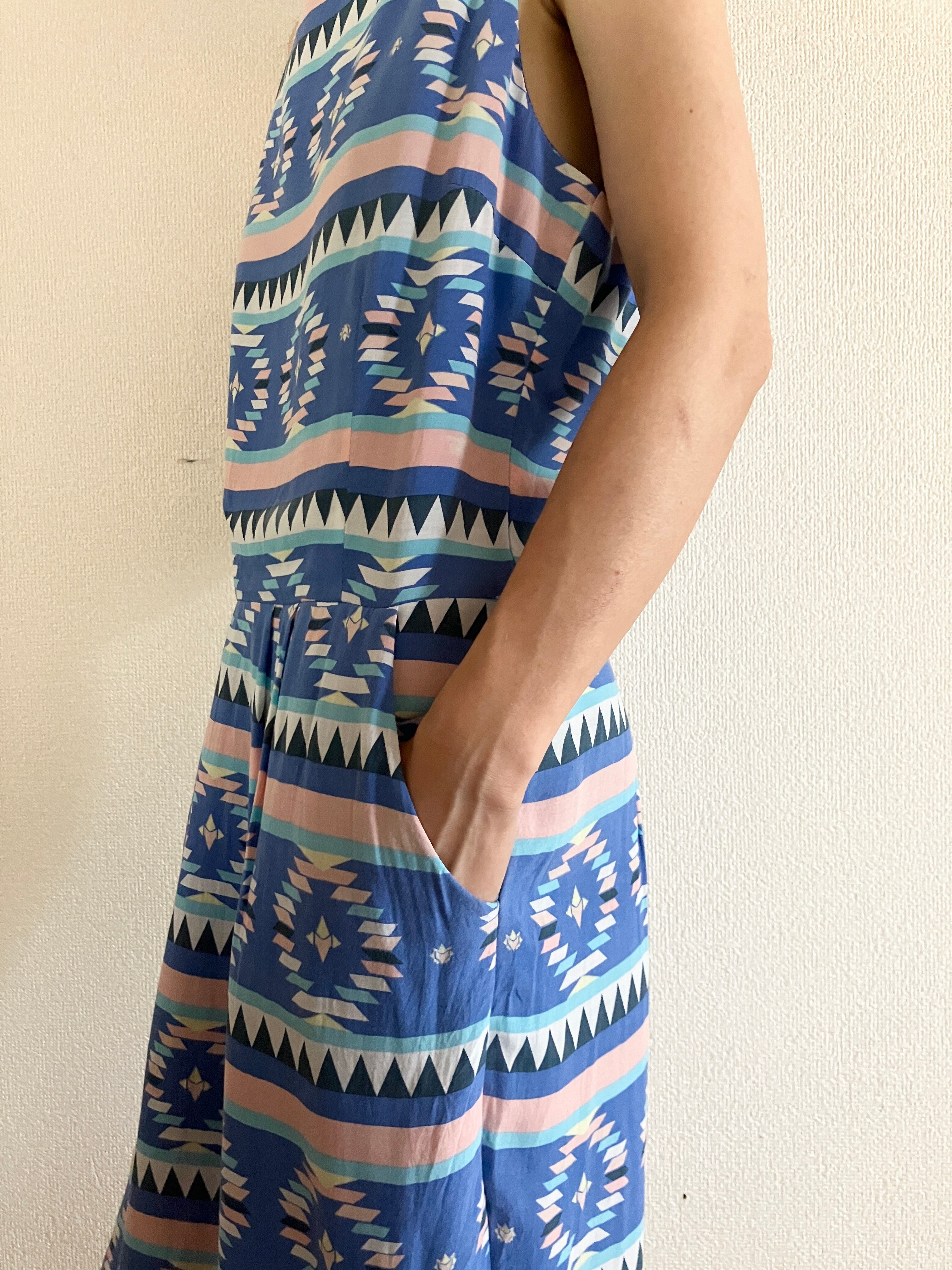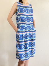鮮やかなブルーを基調としたネイティブ柄が目を引く、ノースリーブのワンピース。軽やかな生地感で、暑い季節もさらりと着られるアイテムです。