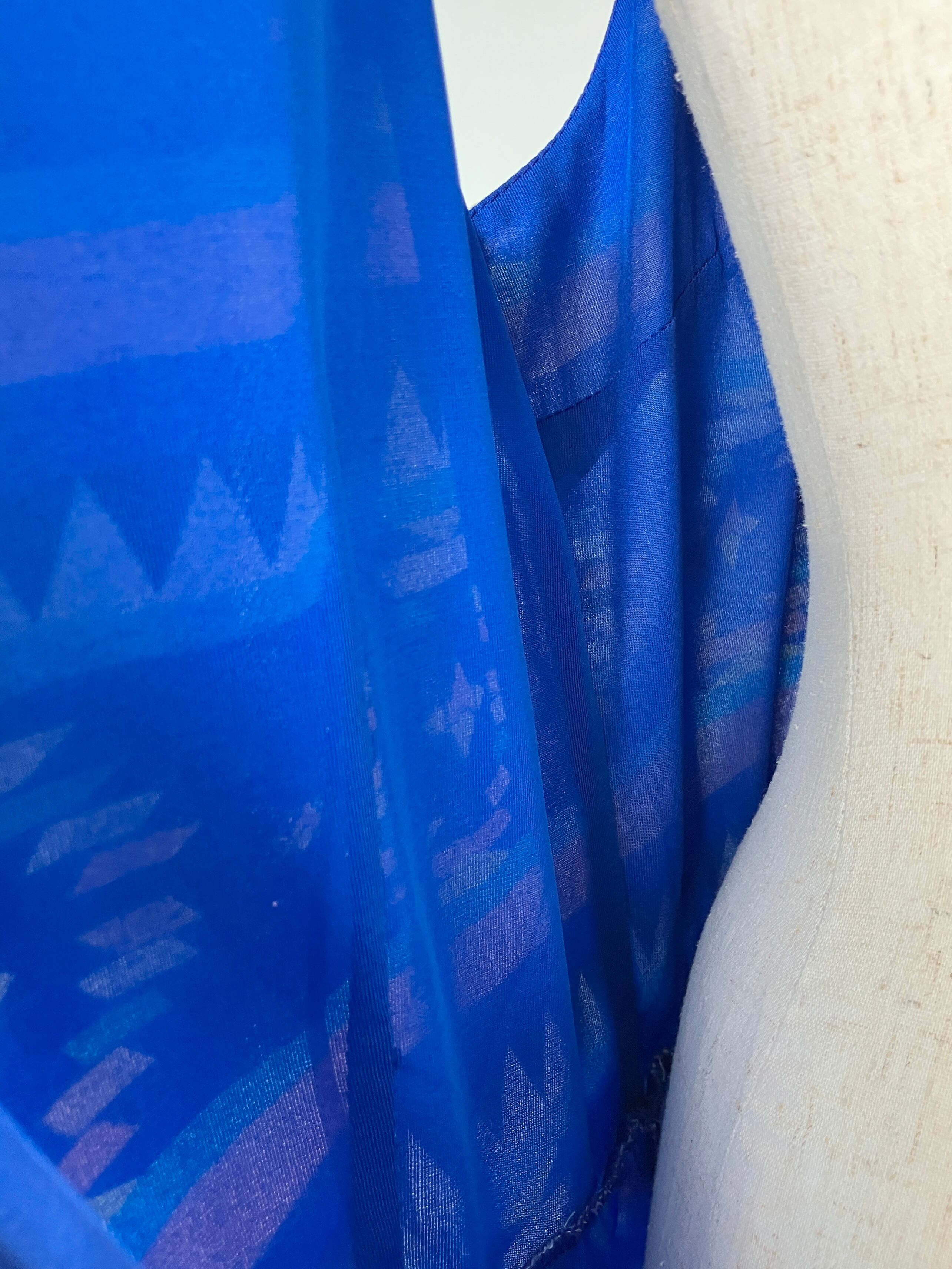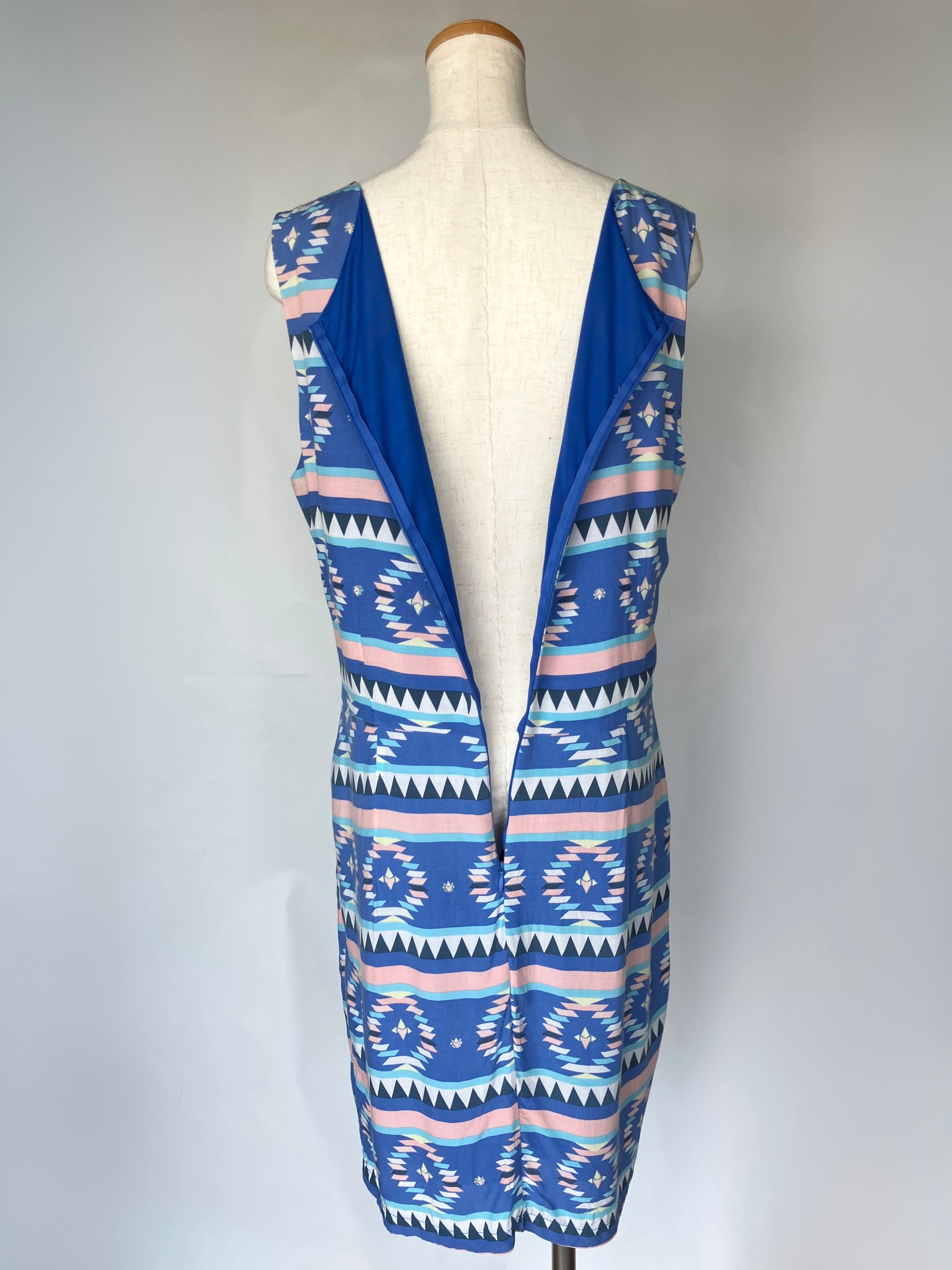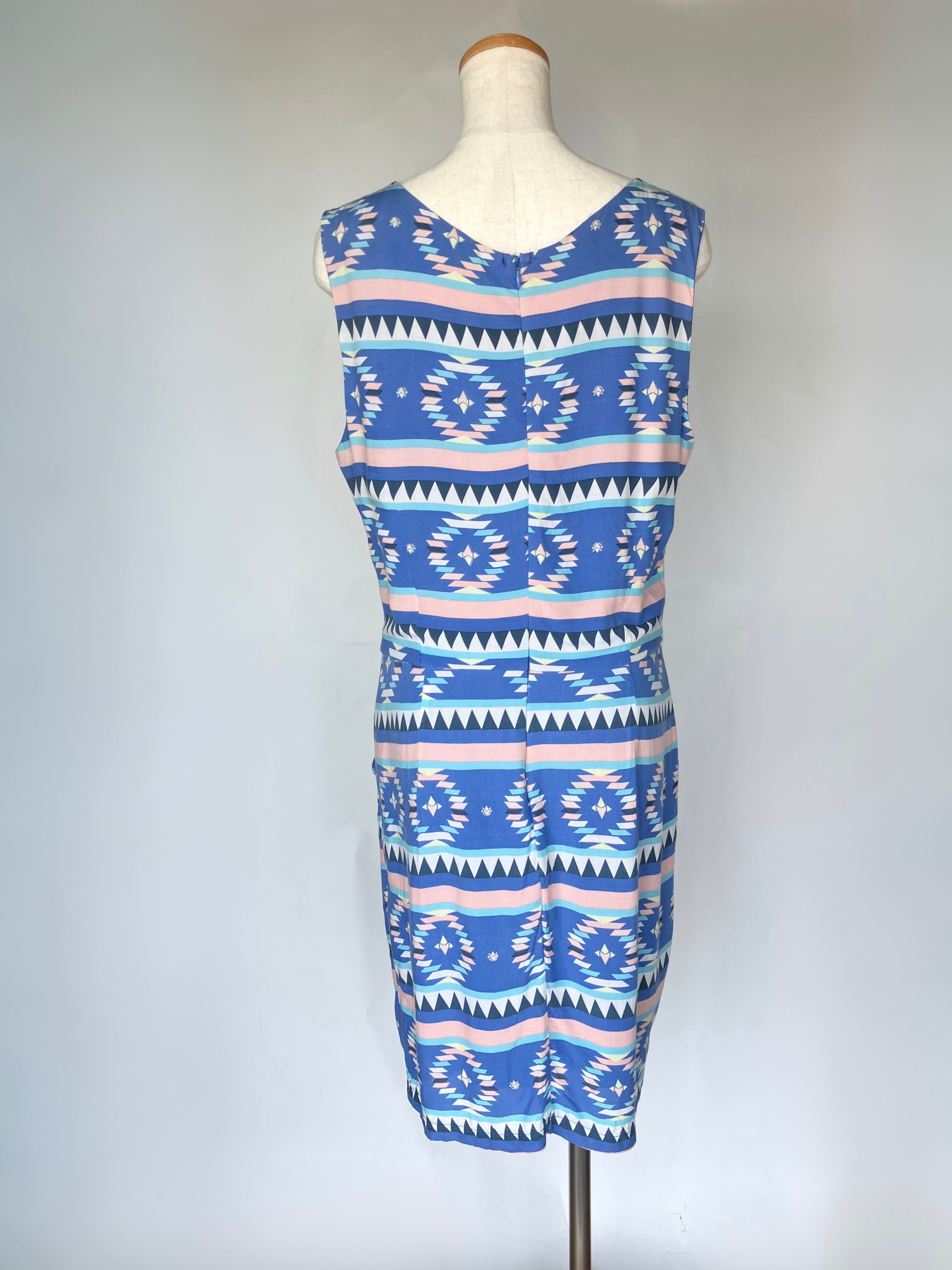 鮮やかなブルーを基調としたネイティブ柄が目を引く、ノースリーブのワンピース。軽やかな生地感で、暑い季節もさらりと着られるアイテムです。