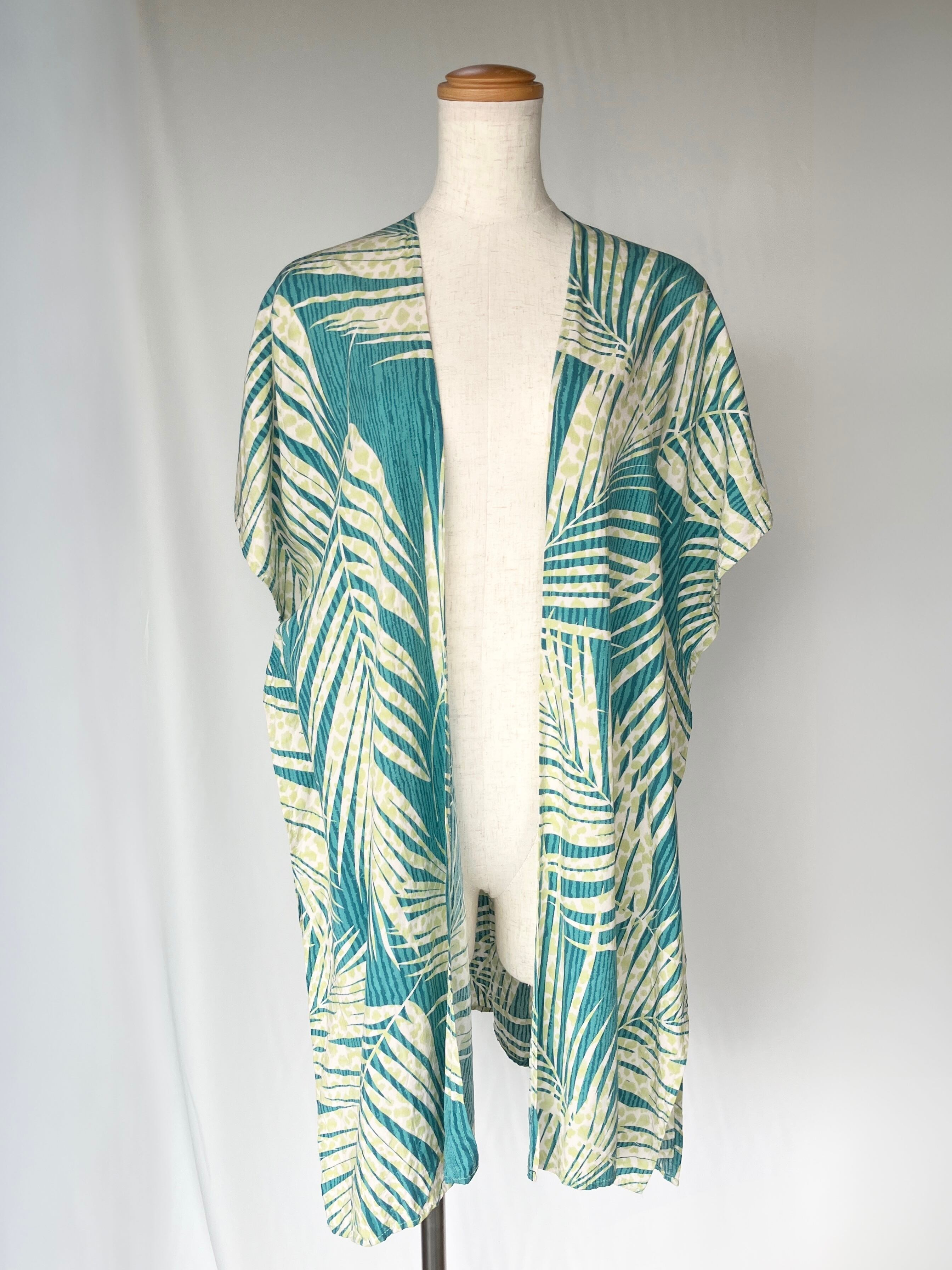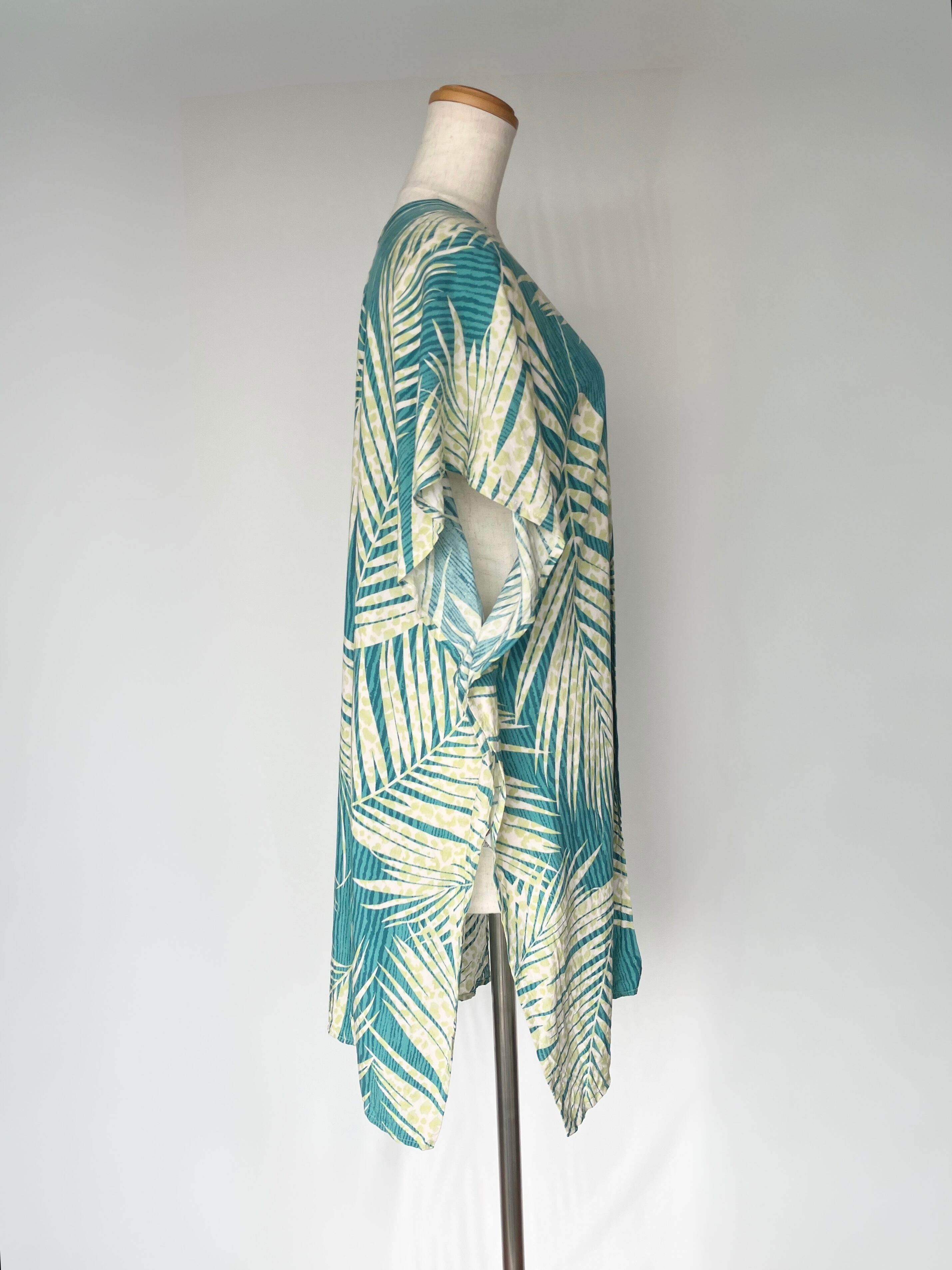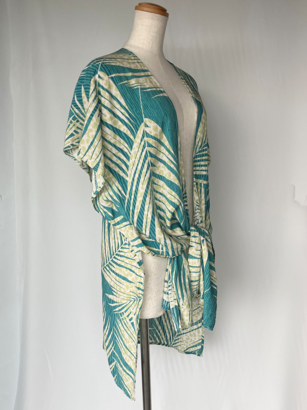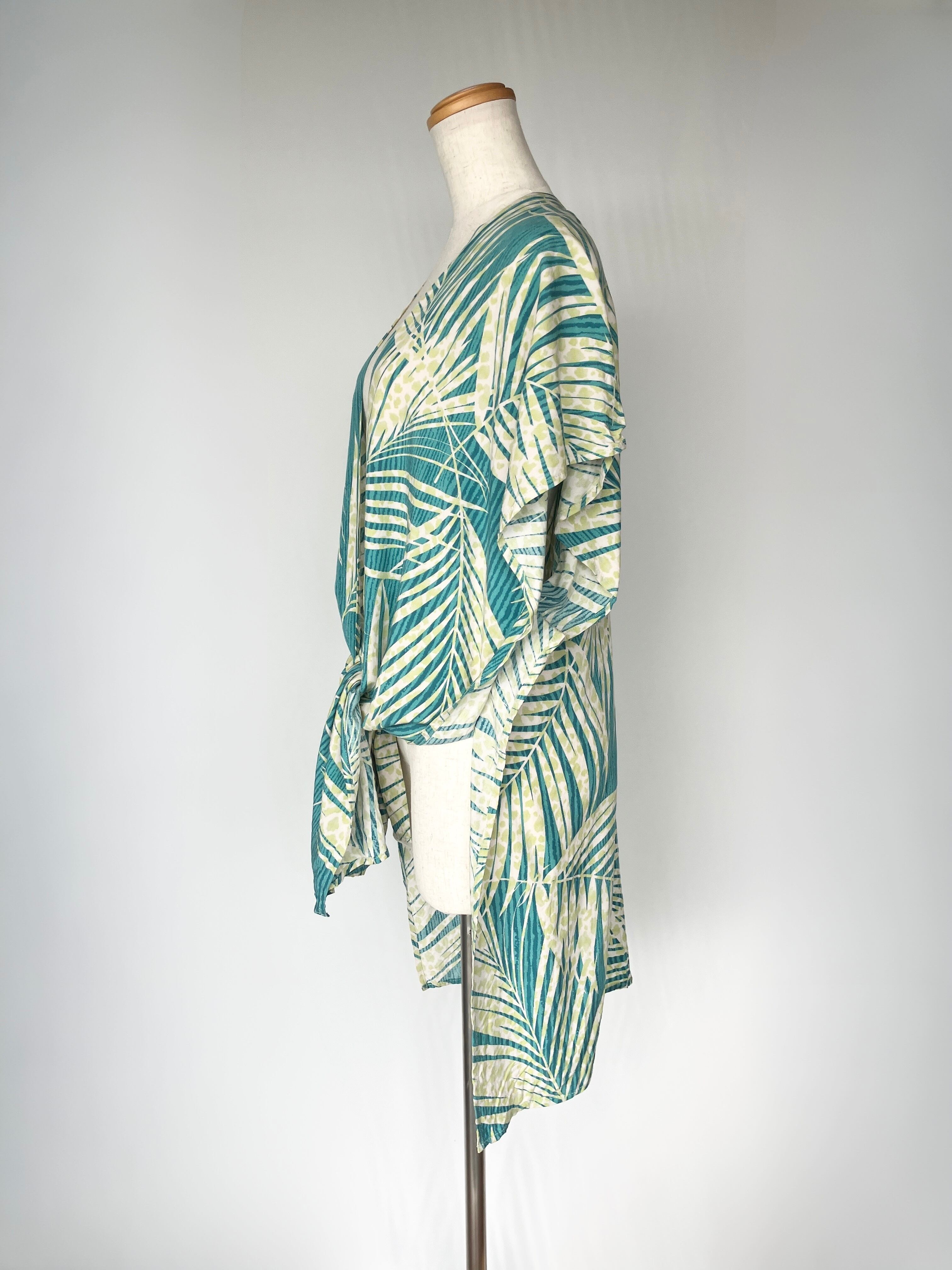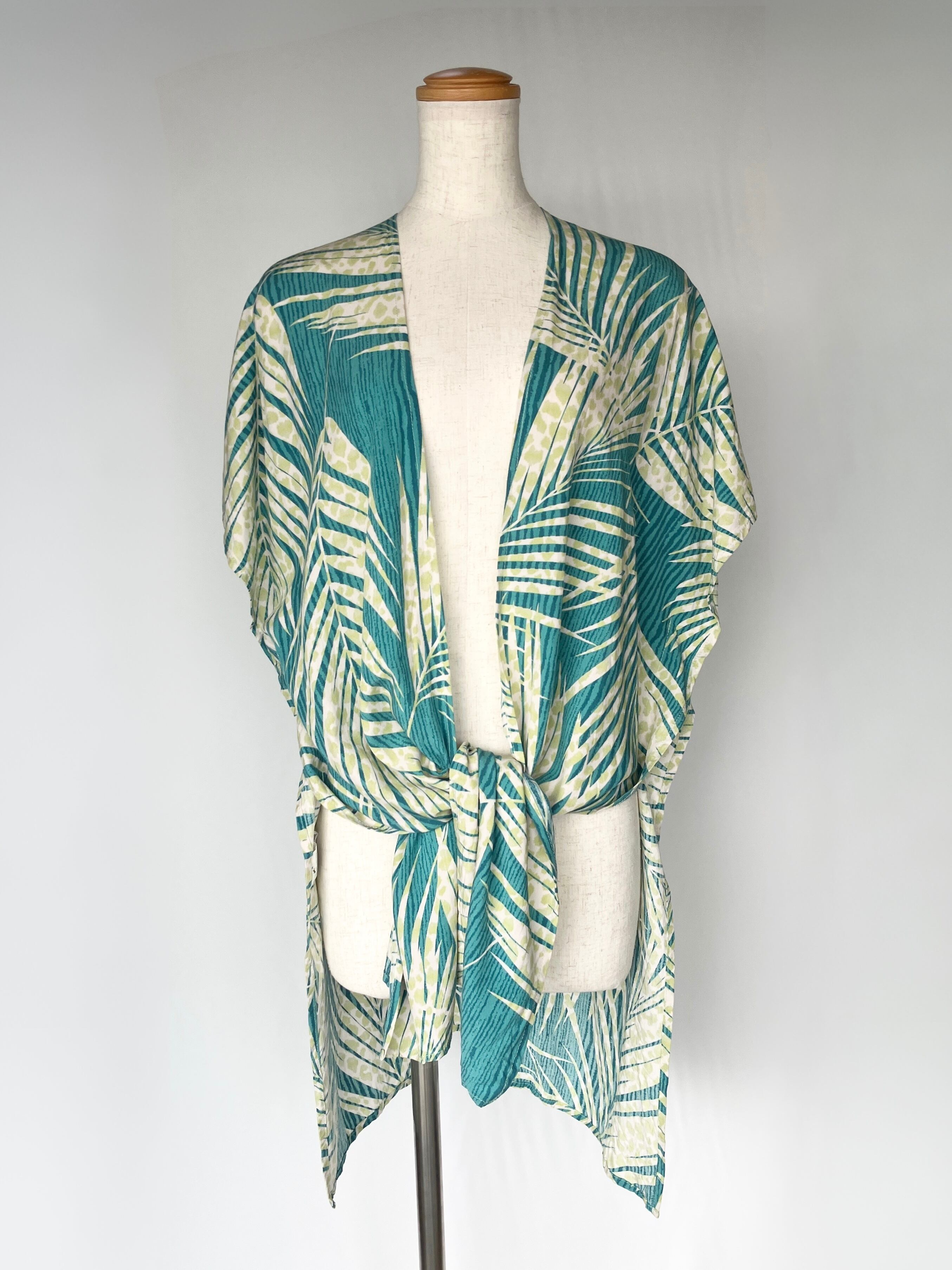 鮮やかな色合いとリーフ柄が素敵な、軽く羽織れるトップスです。両サイドにスリットが入っていて、前で結ぶことができます。海やリゾート地、夏のカジュアルなお出かけに活躍しそうです。サンパウロにて出会いました。