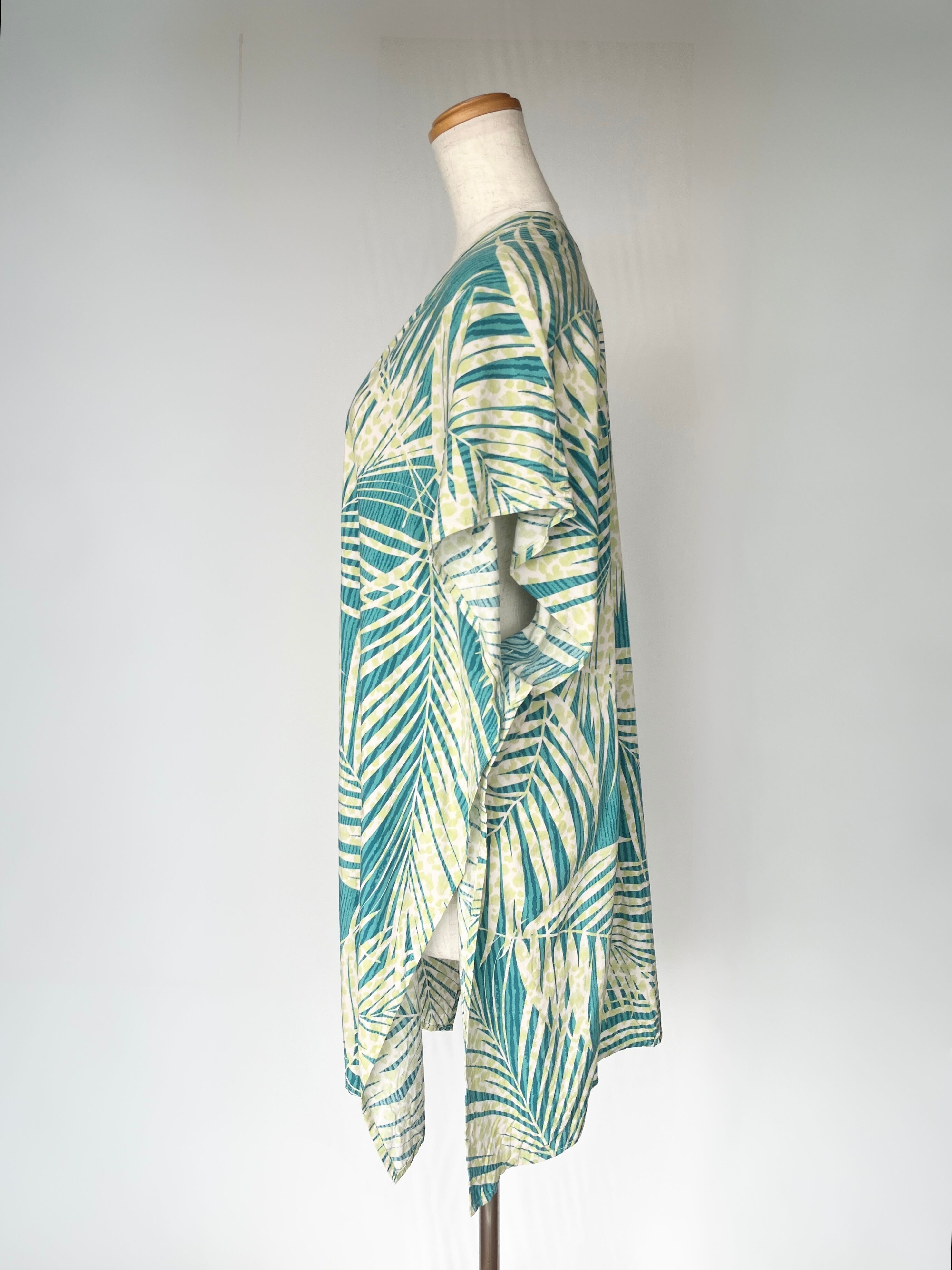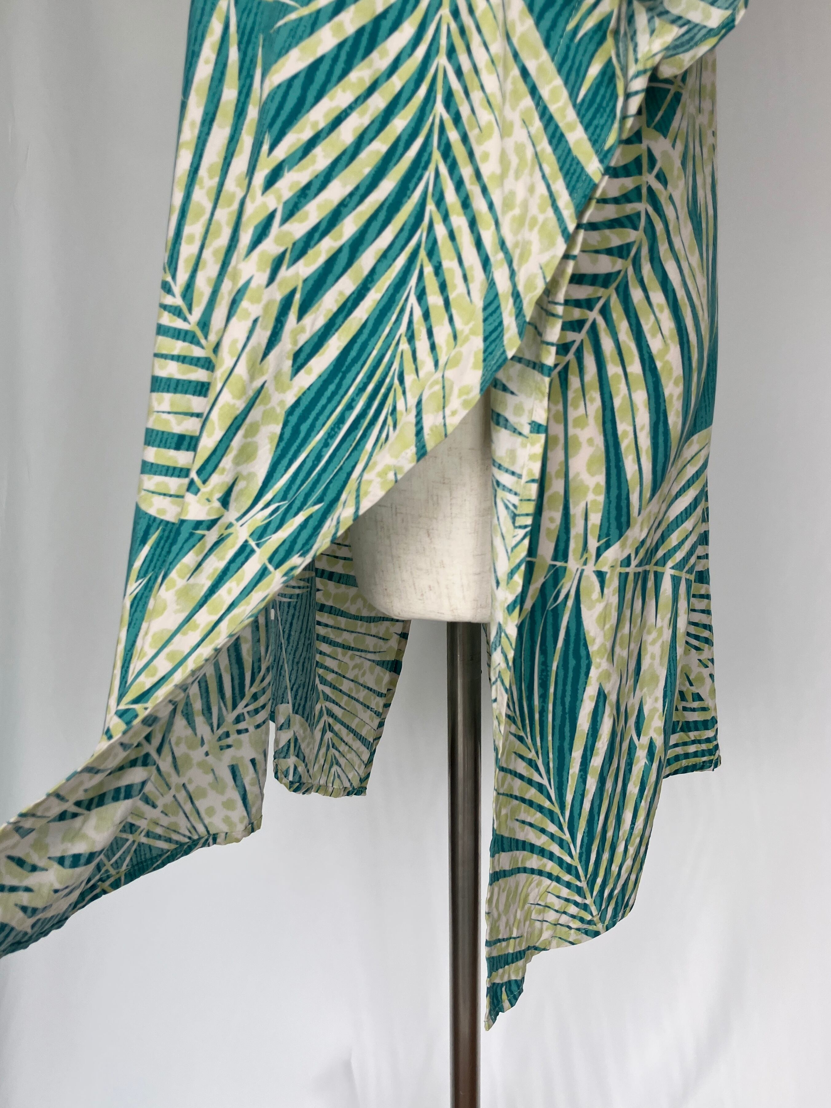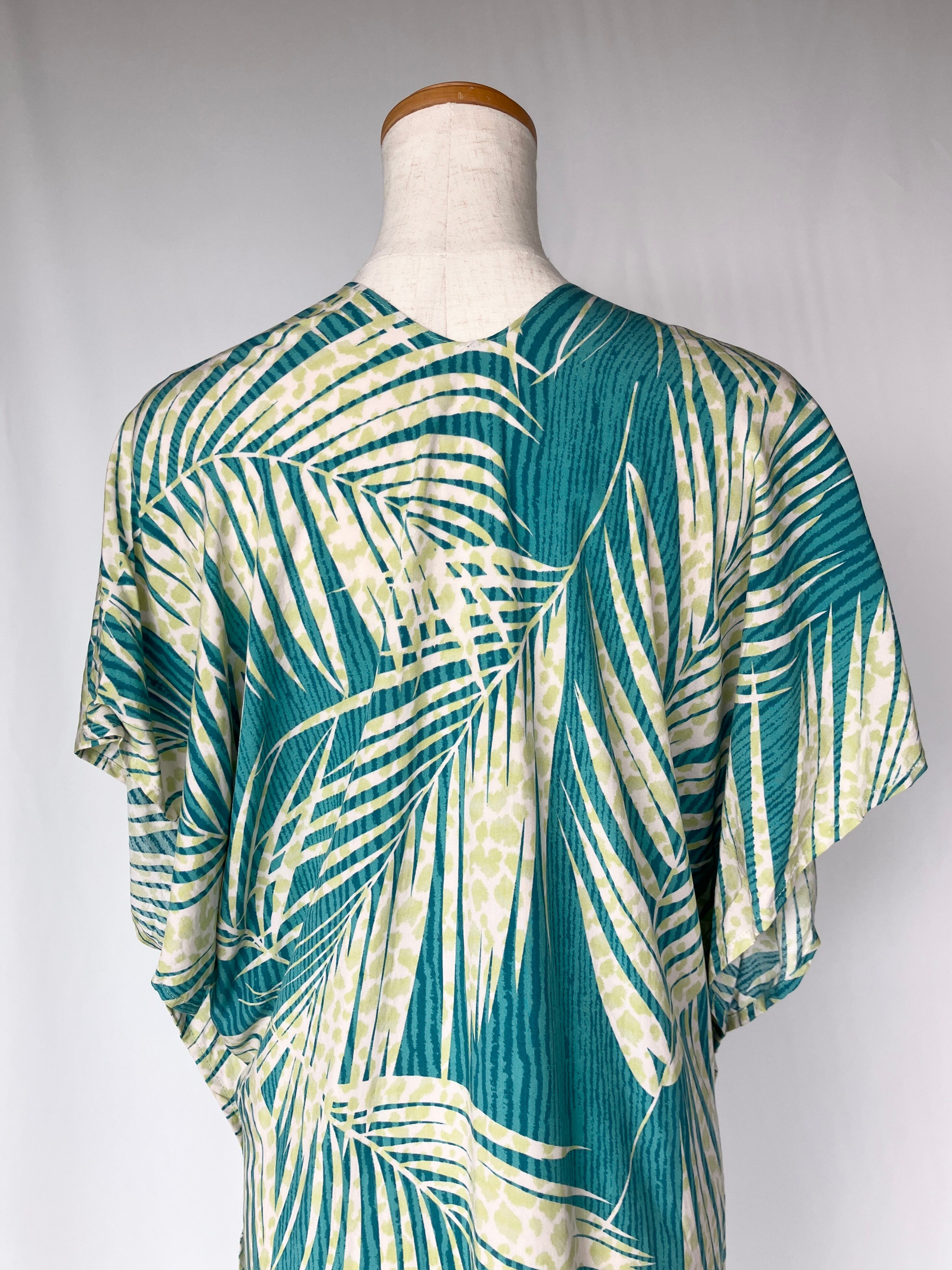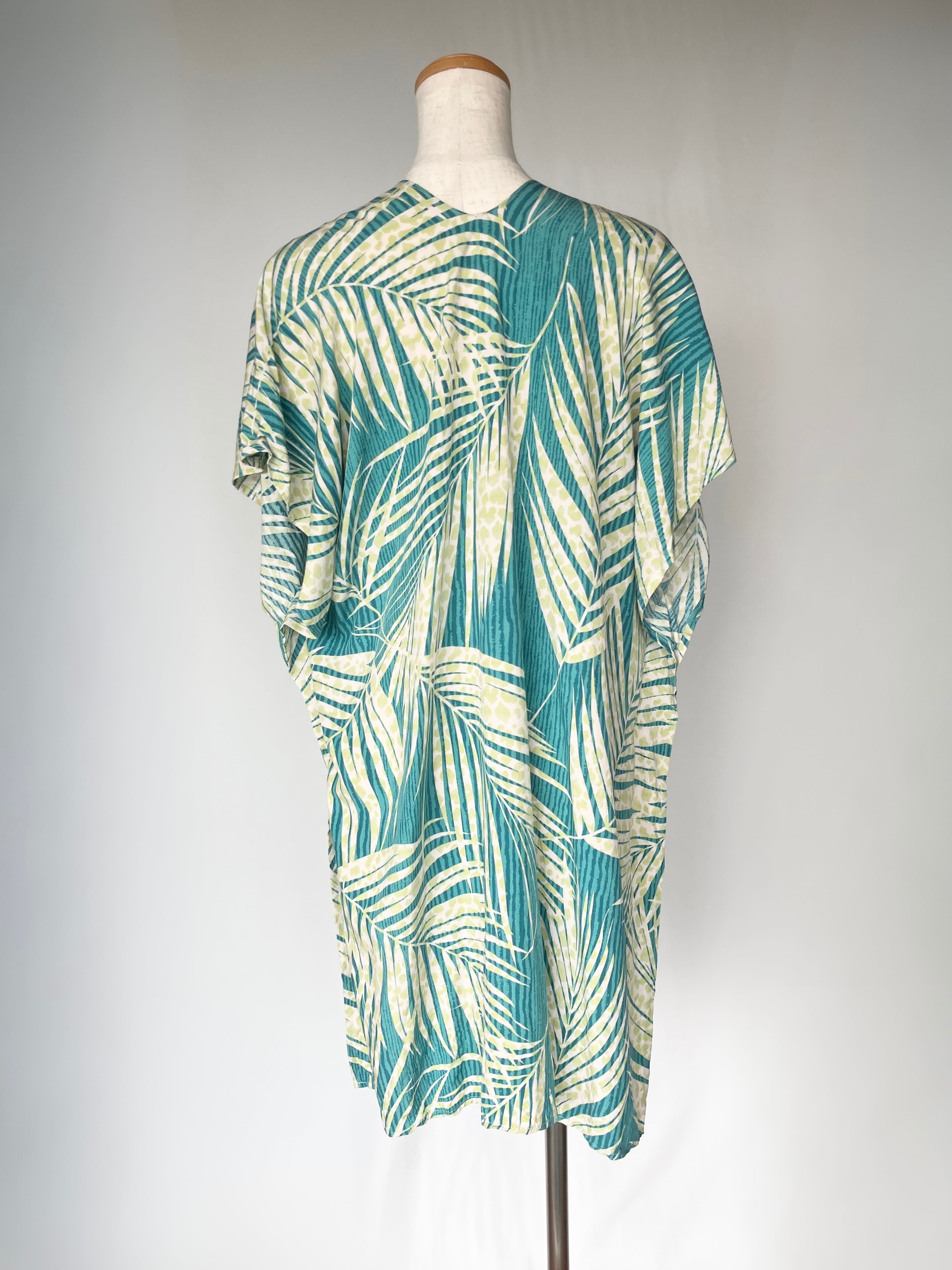 鮮やかな色合いとリーフ柄が素敵な、軽く羽織れるトップスです。両サイドにスリットが入っていて、前で結ぶことができます。海やリゾート地、夏のカジュアルなお出かけに活躍しそうです。サンパウロにて出会いました。