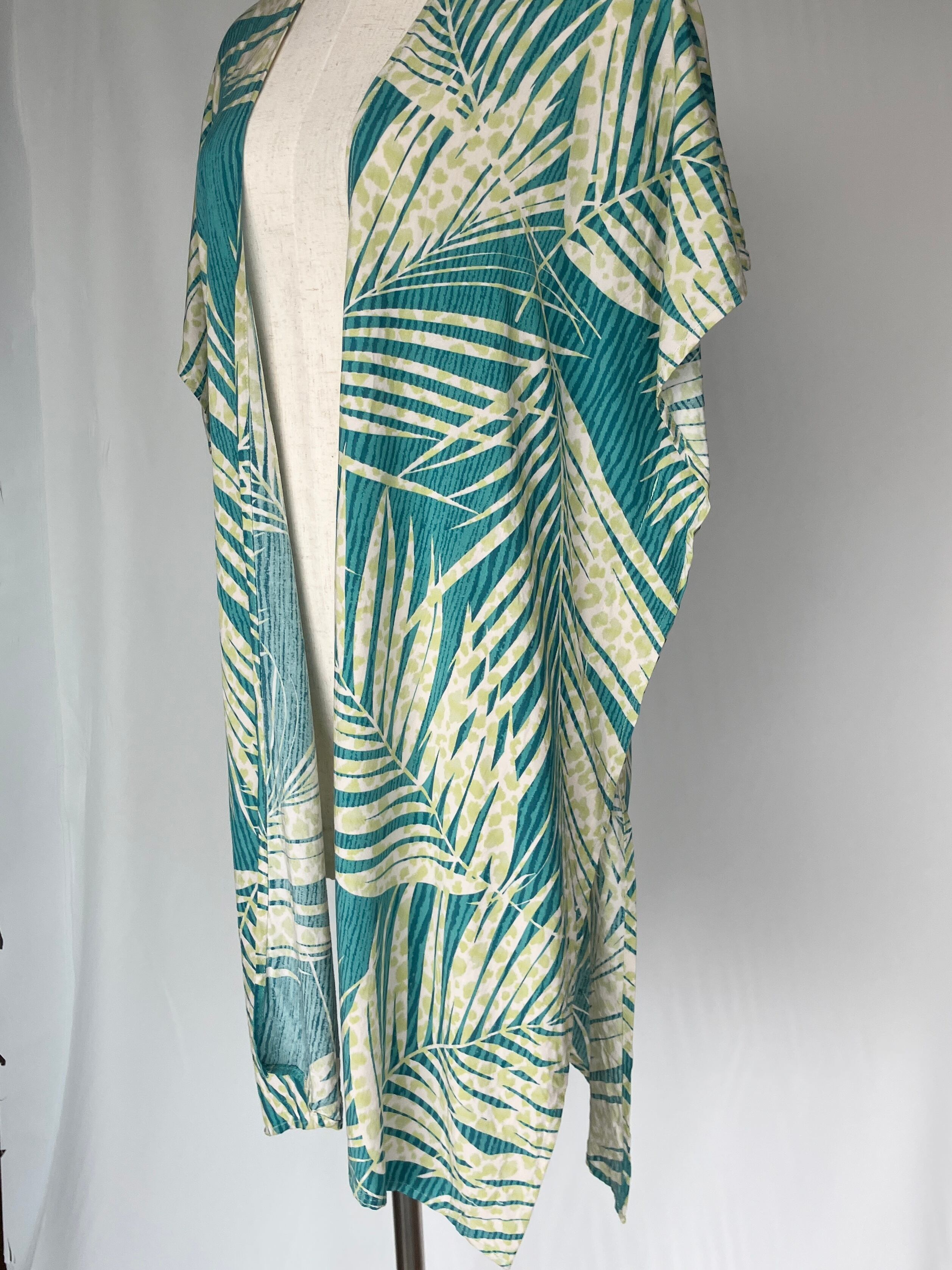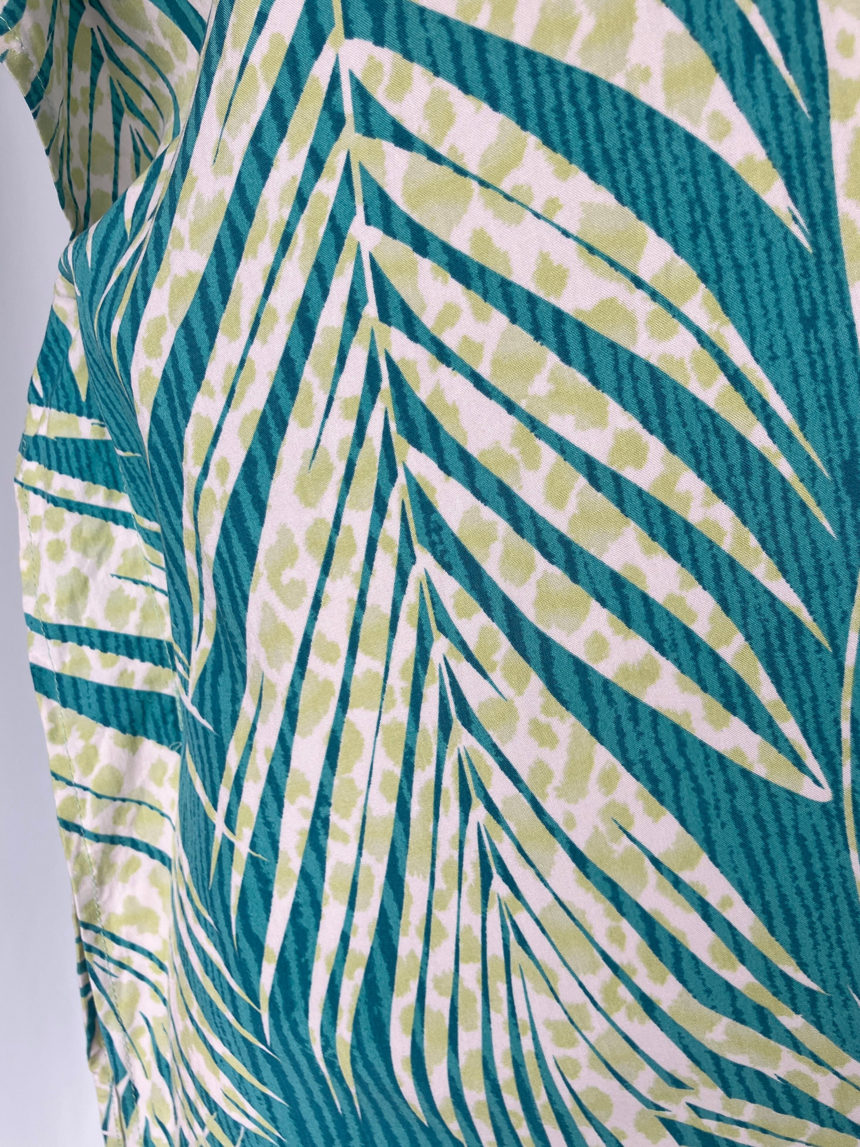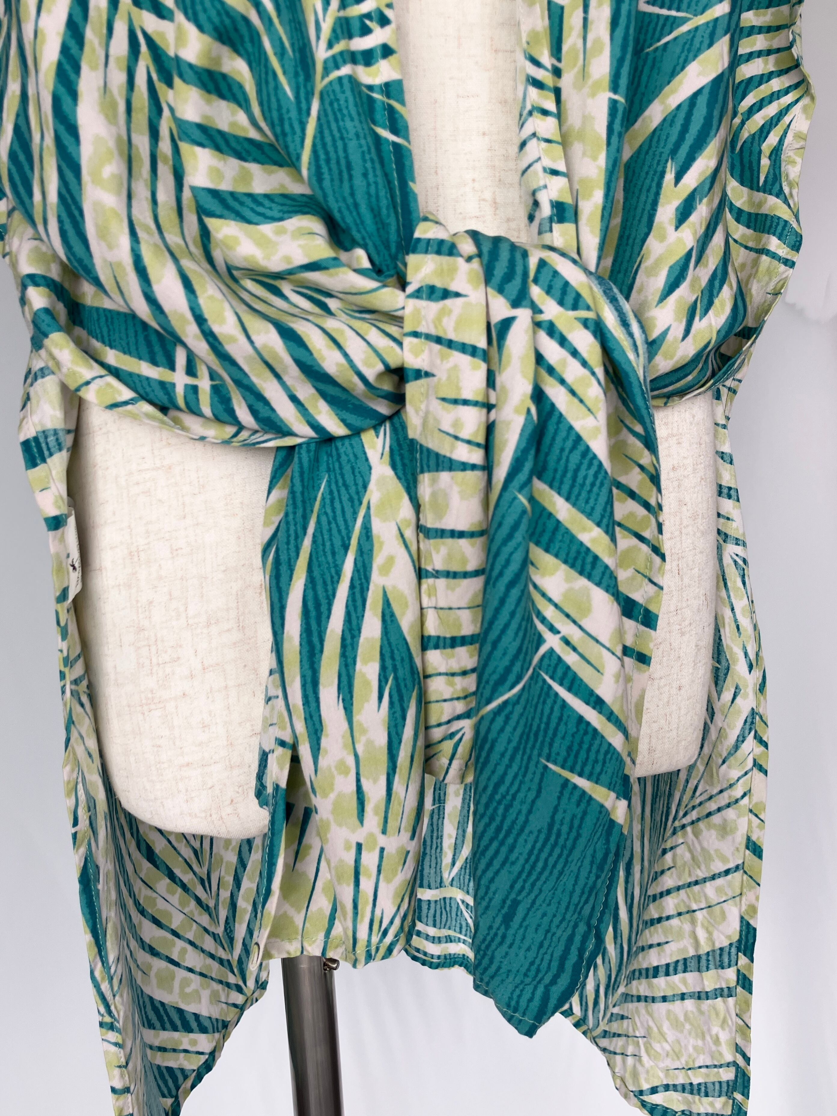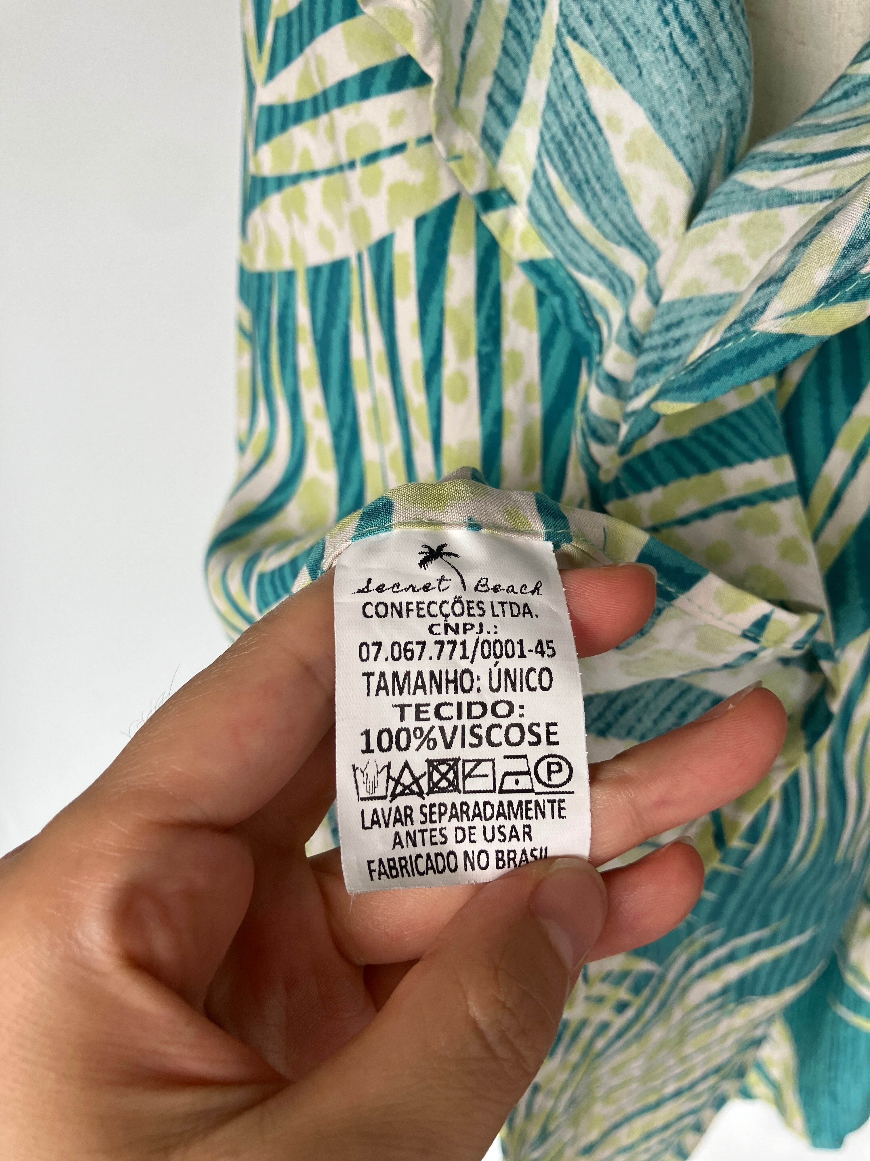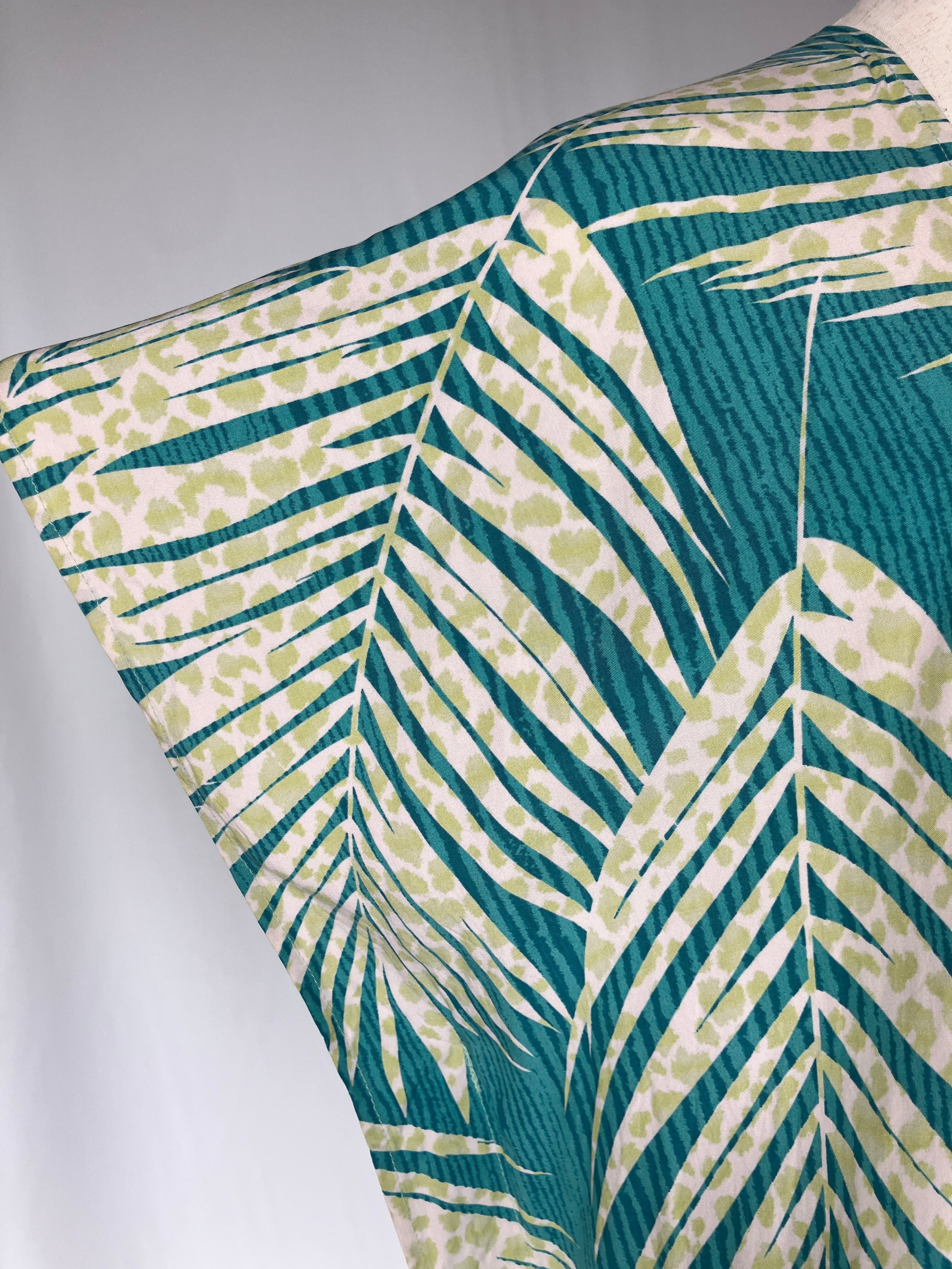鮮やかな色合いとリーフ柄が素敵な、軽く羽織れるトップスです。両サイドにスリットが入っていて、前で結ぶことができます。海やリゾート地、夏のカジュアルなお出かけに活躍しそうです。サンパウロにて出会いました。