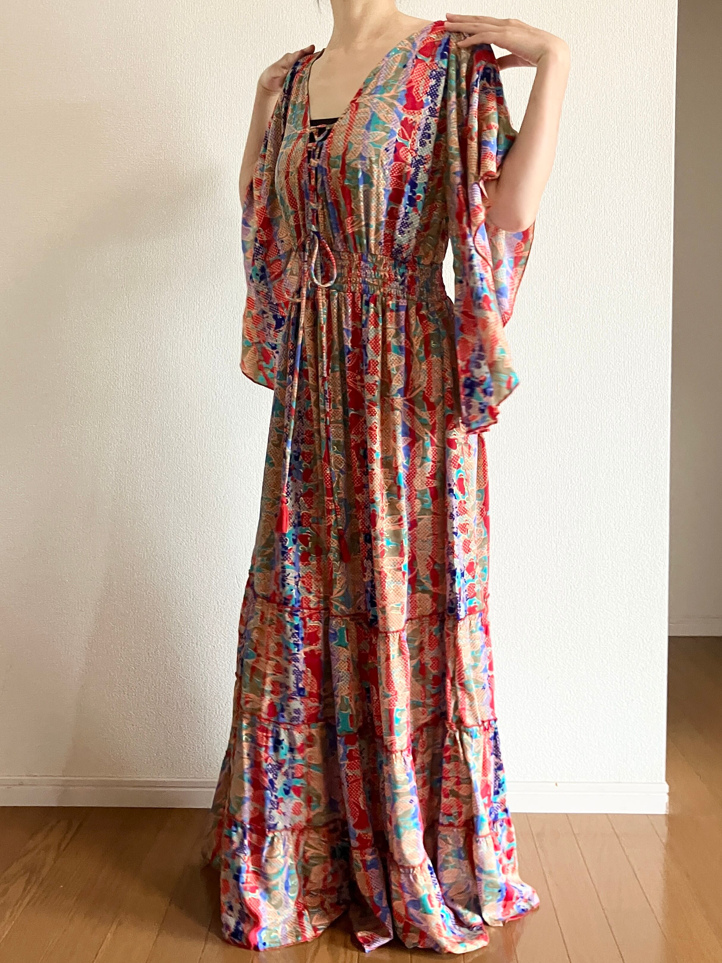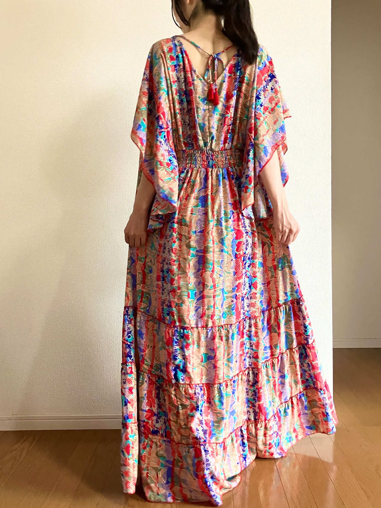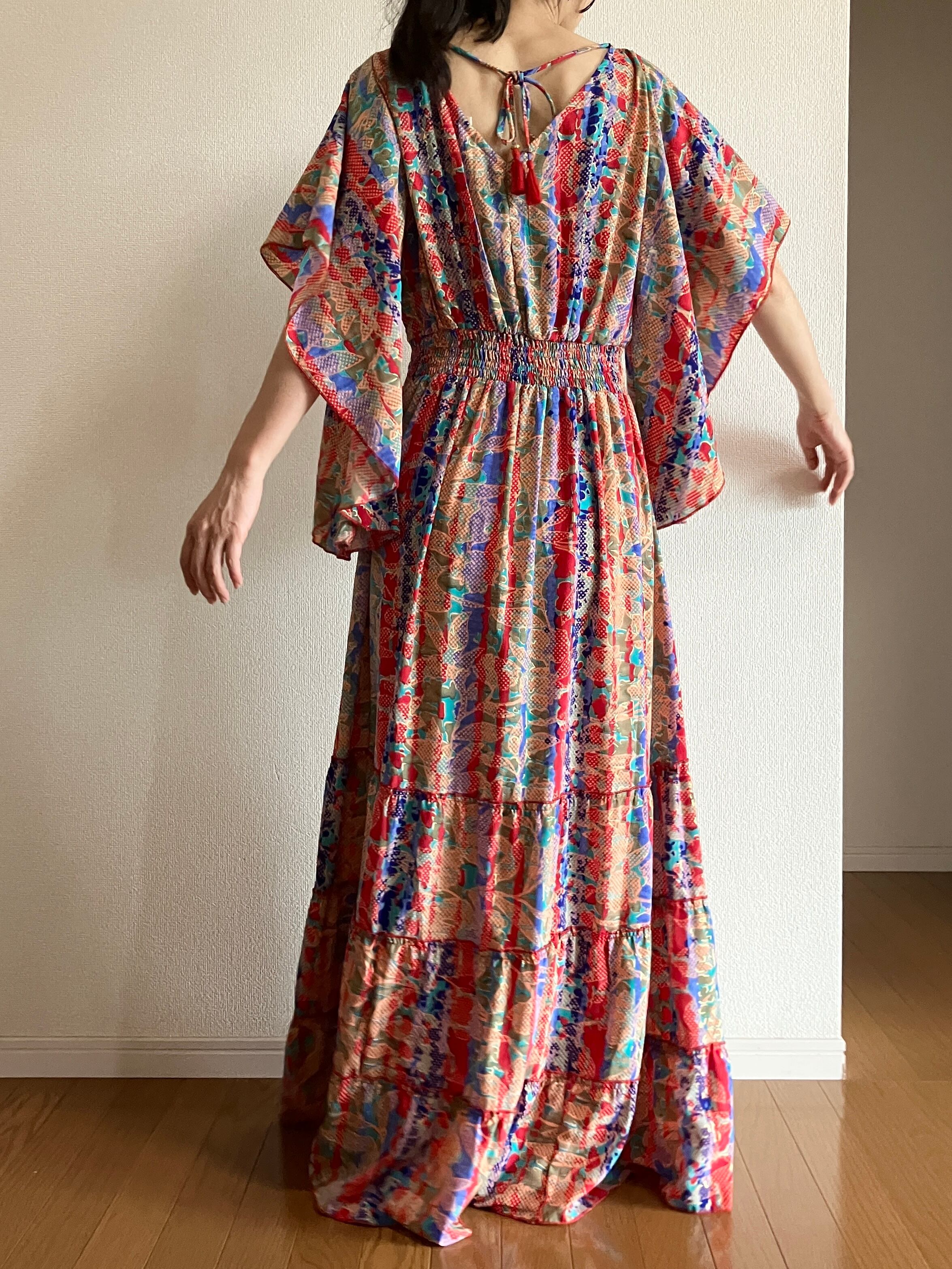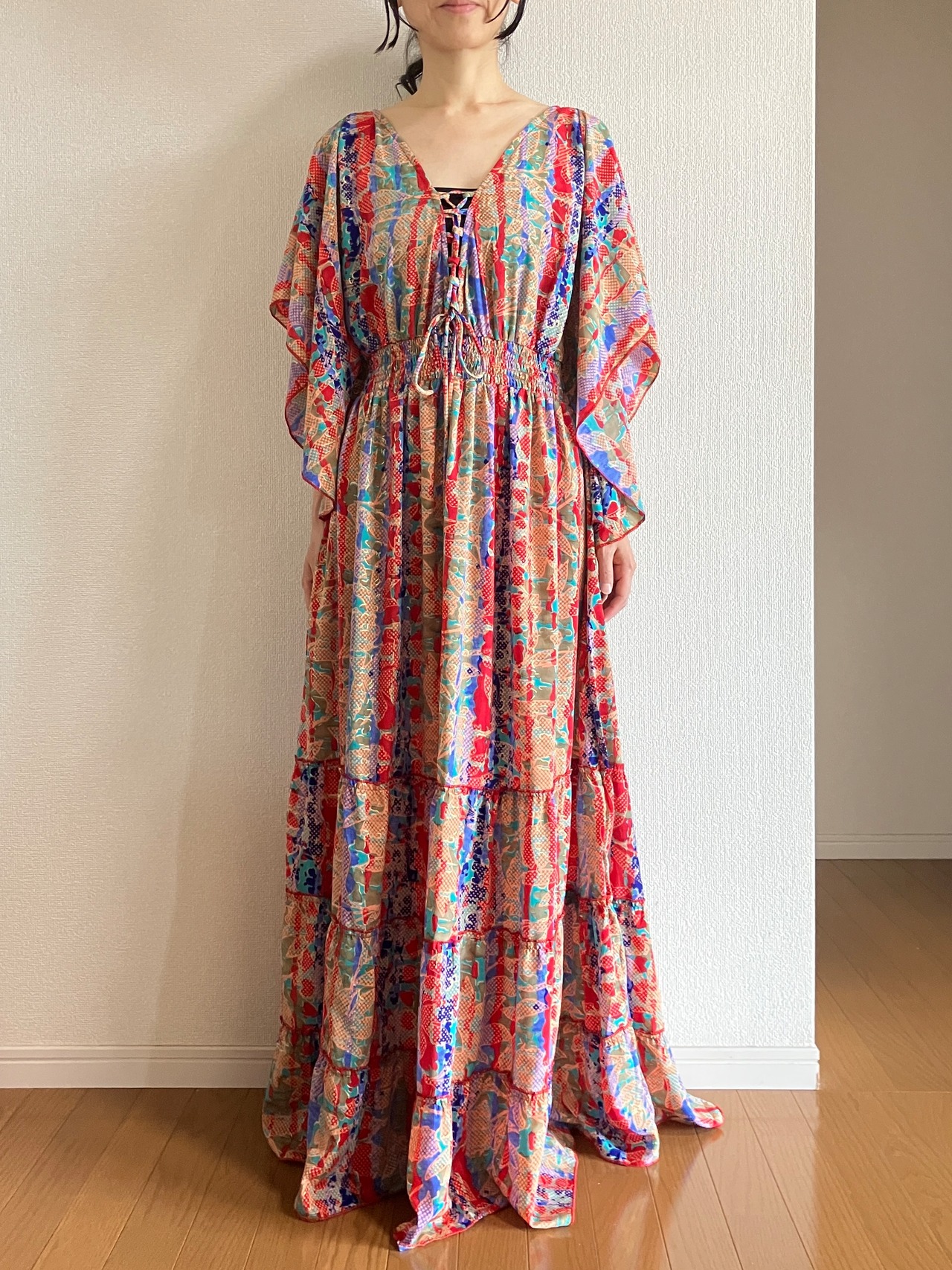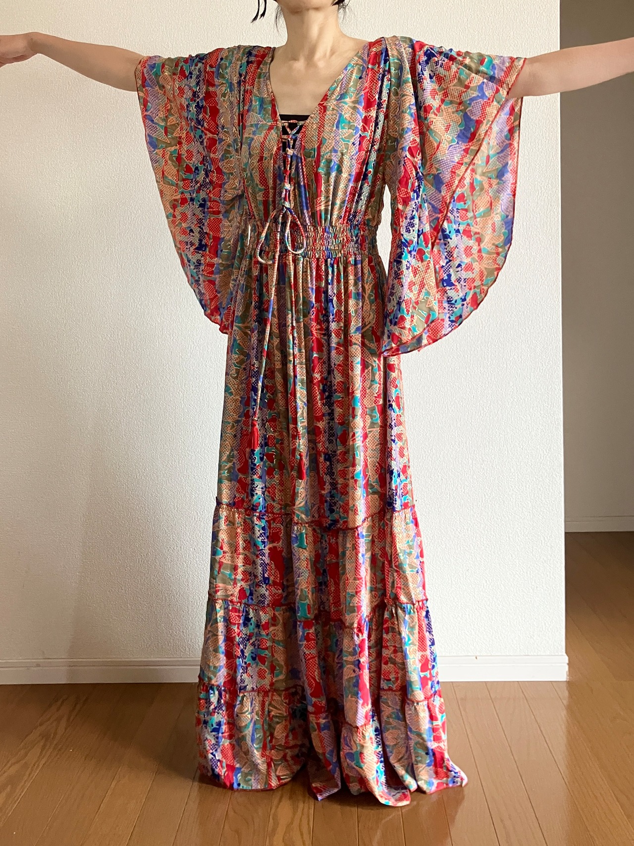 全身を包み込む鮮やかで立体感のあるプリントが印象的なマキシワンピースです。軽やかな生地で、動くたびにふんわりと揺れ、華やかで存在感のある一着。ウエストはシャーリング仕様で、体型を問わず着やすいデザインです。袖はケープのように広がるフレアスリーブで、二の腕もさりげなくカバーします。フロントはレースアップ仕様で、リボンが可愛らしいアクセントに。