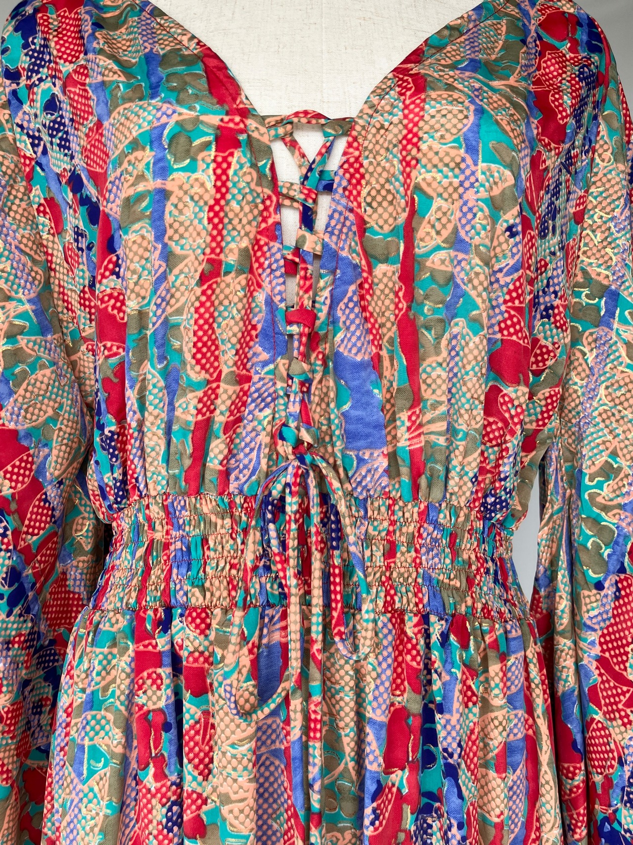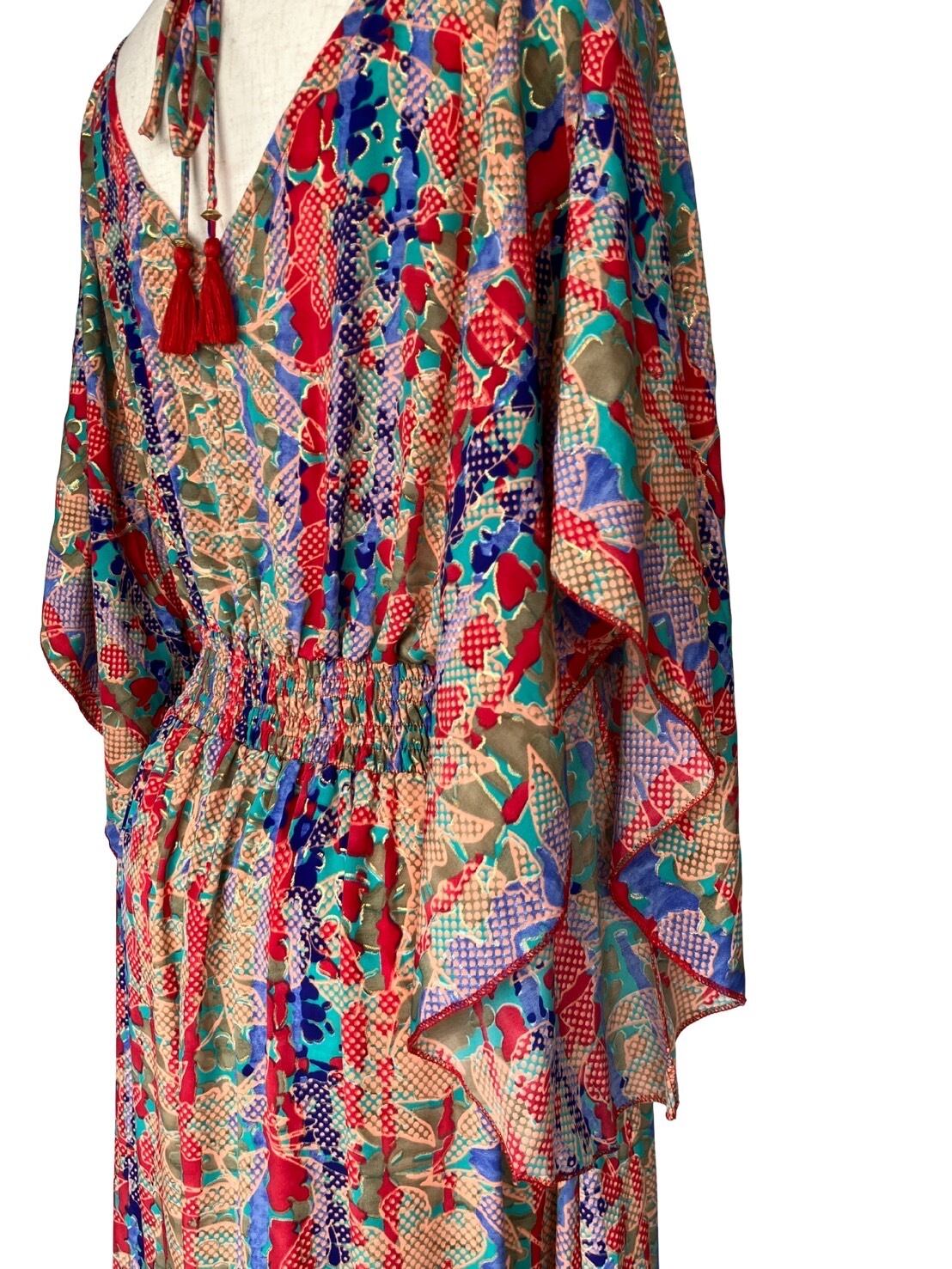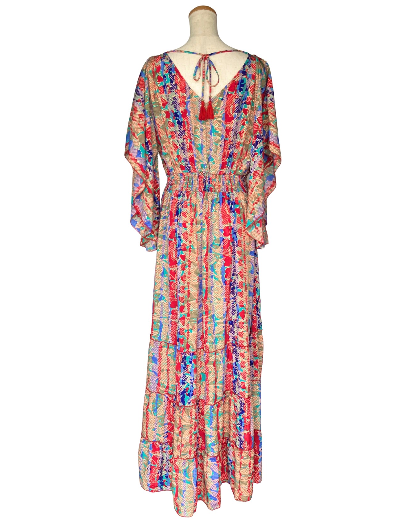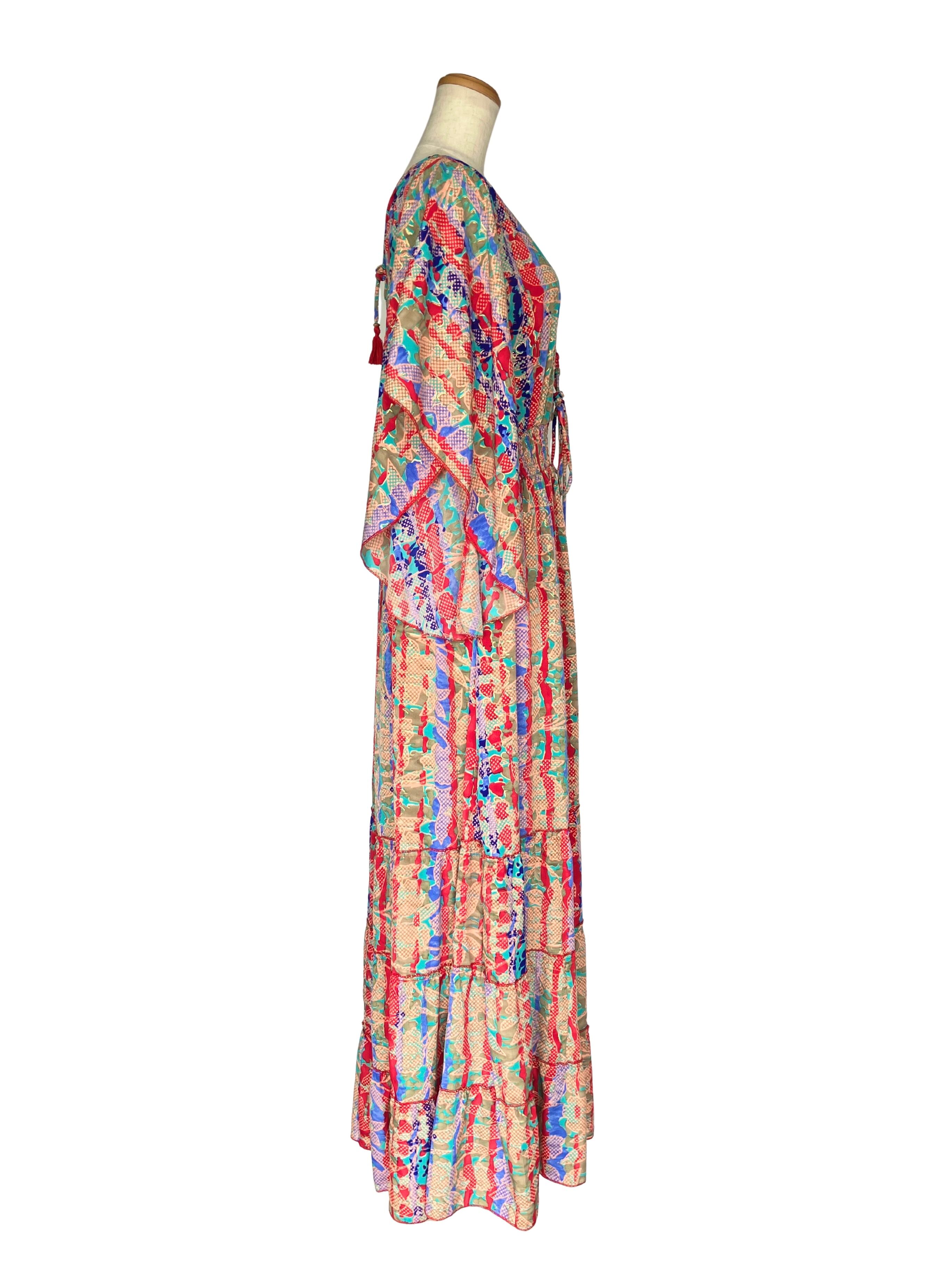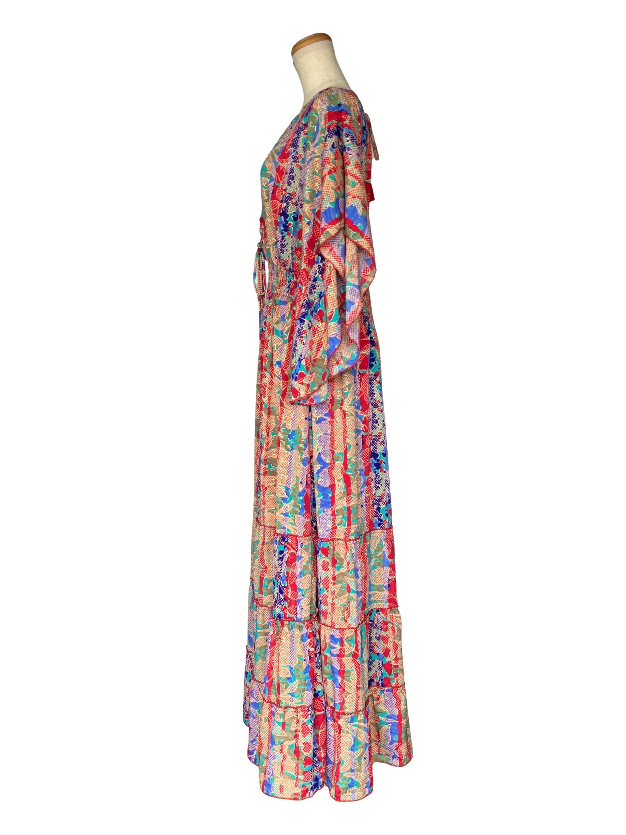 全身を包み込む鮮やかで立体感のあるプリントが印象的なマキシワンピースです。軽やかな生地で、動くたびにふんわりと揺れ、華やかで存在感のある一着。ウエストはシャーリング仕様で、体型を問わず着やすいデザインです。袖はケープのように広がるフレアスリーブで、二の腕もさりげなくカバーします。フロントはレースアップ仕様で、リボンが可愛らしいアクセントに。