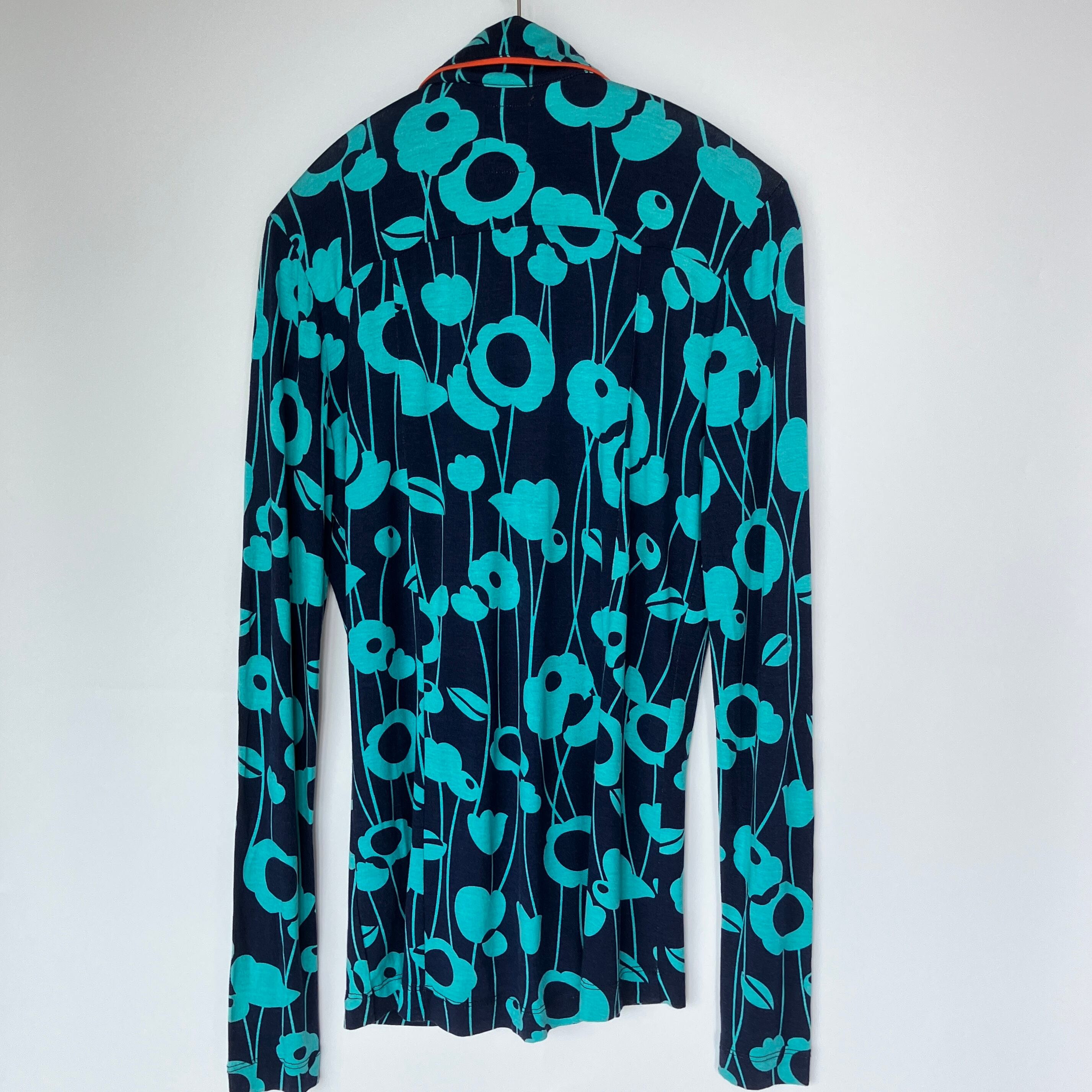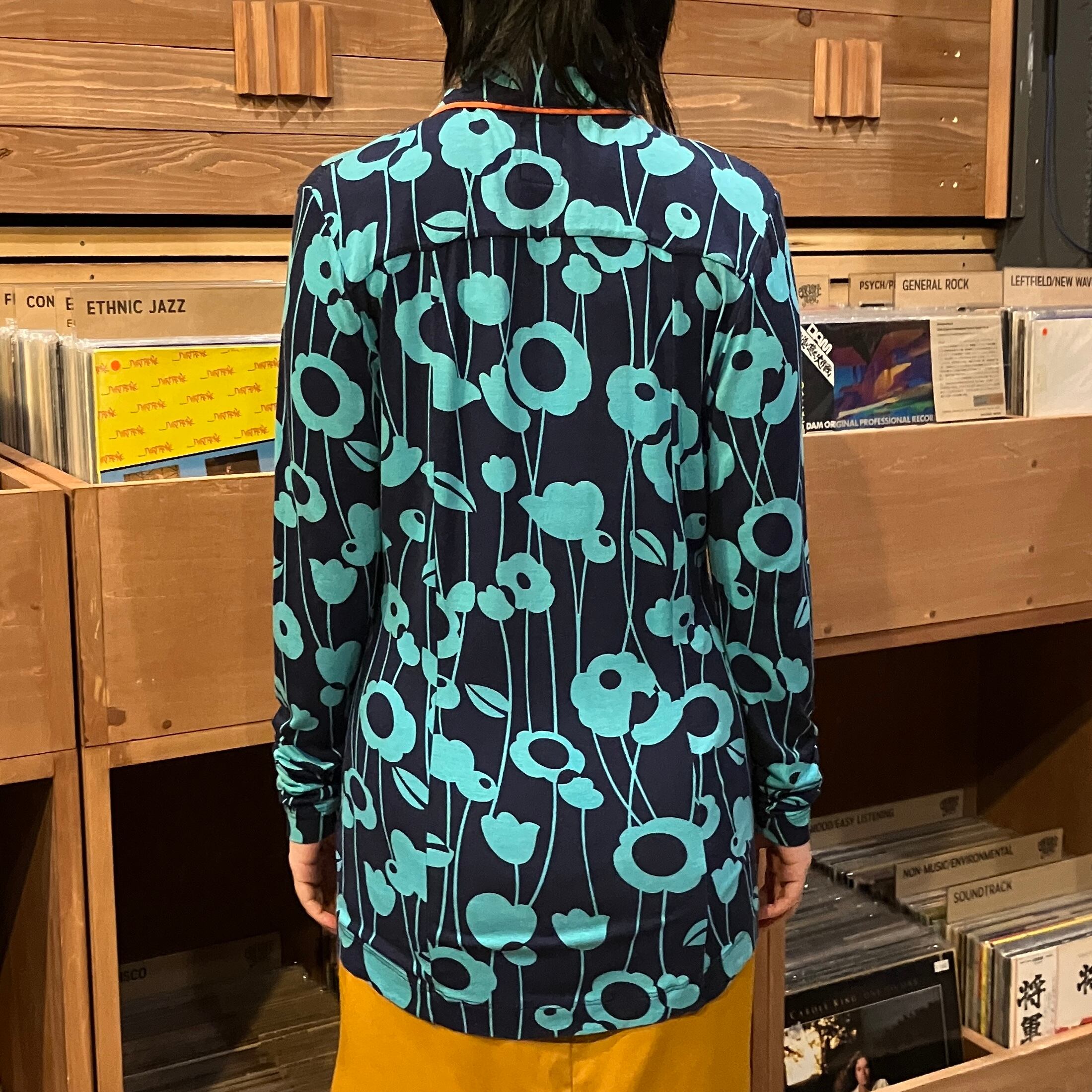 植物の柄に、中央と襟のオレンジ色がオシャレな長袖のトップスです。ボタンが花柄で可愛いです。