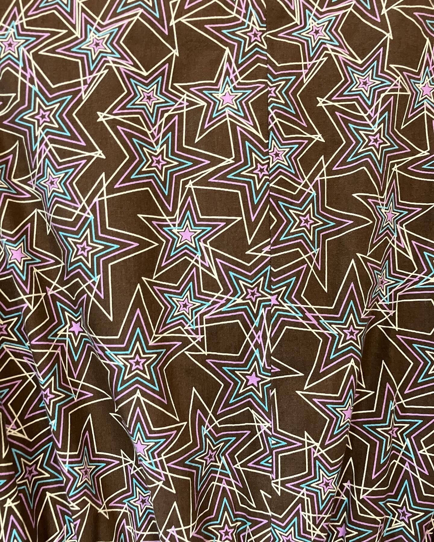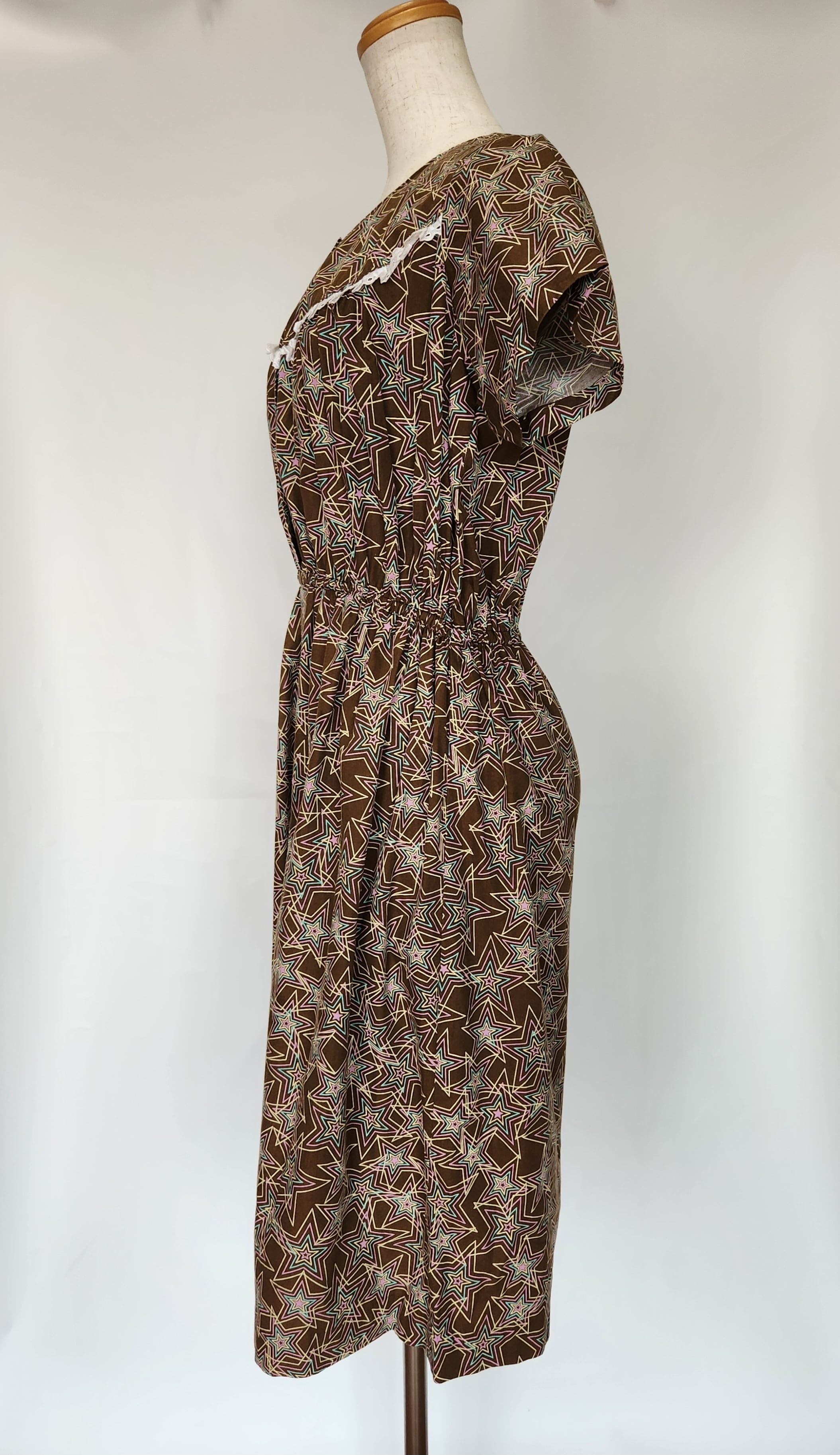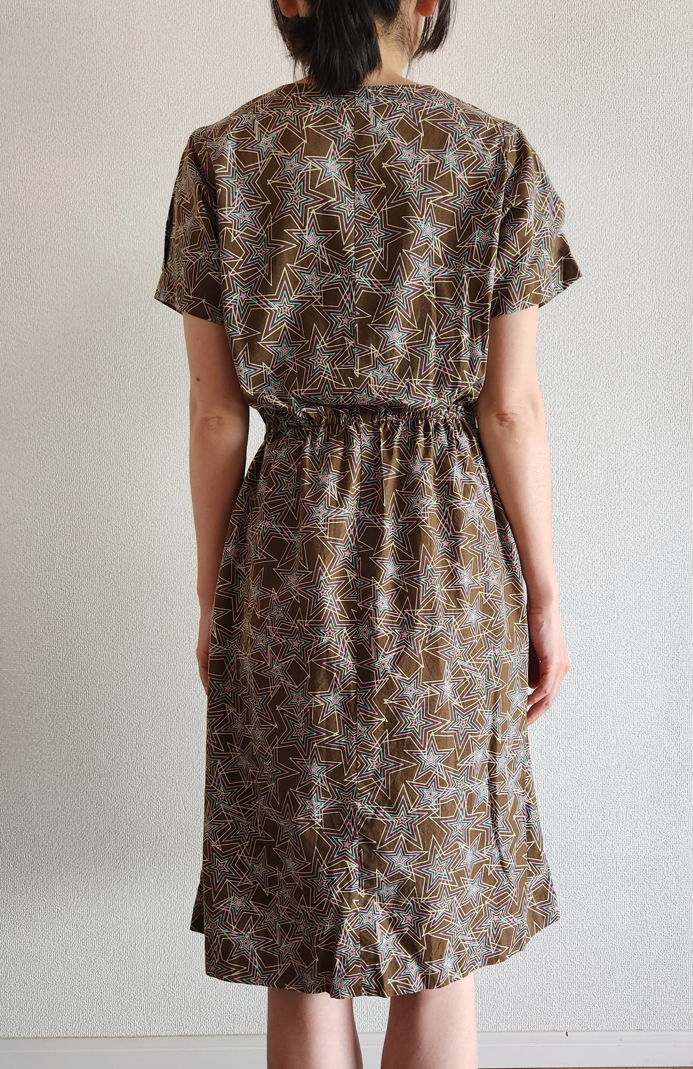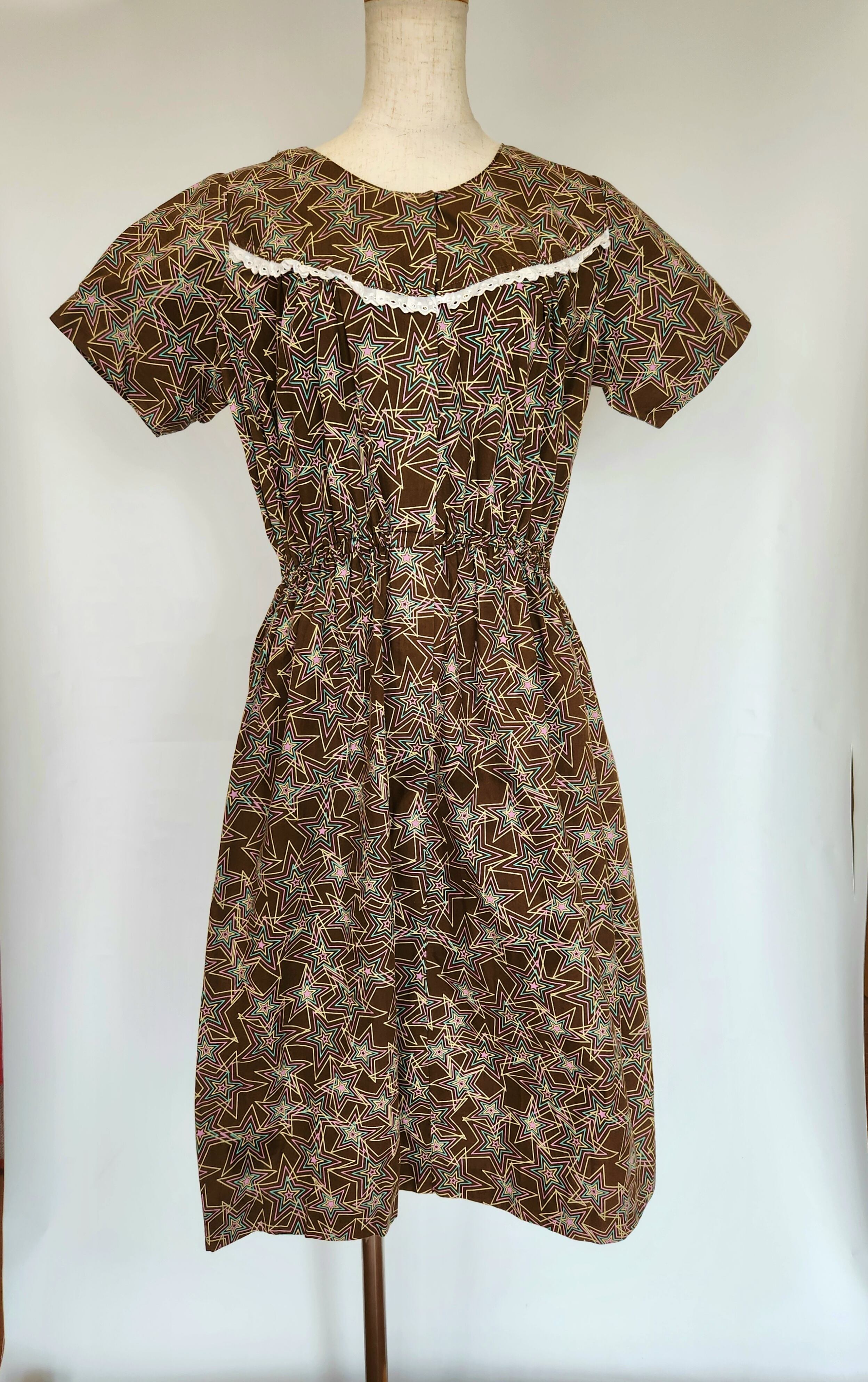星柄がインパクトのあるワンピースです。前身頃にスナップボタンがついています。ウエストはゴムなので、着脱しやすいです。ポケットはついていません。