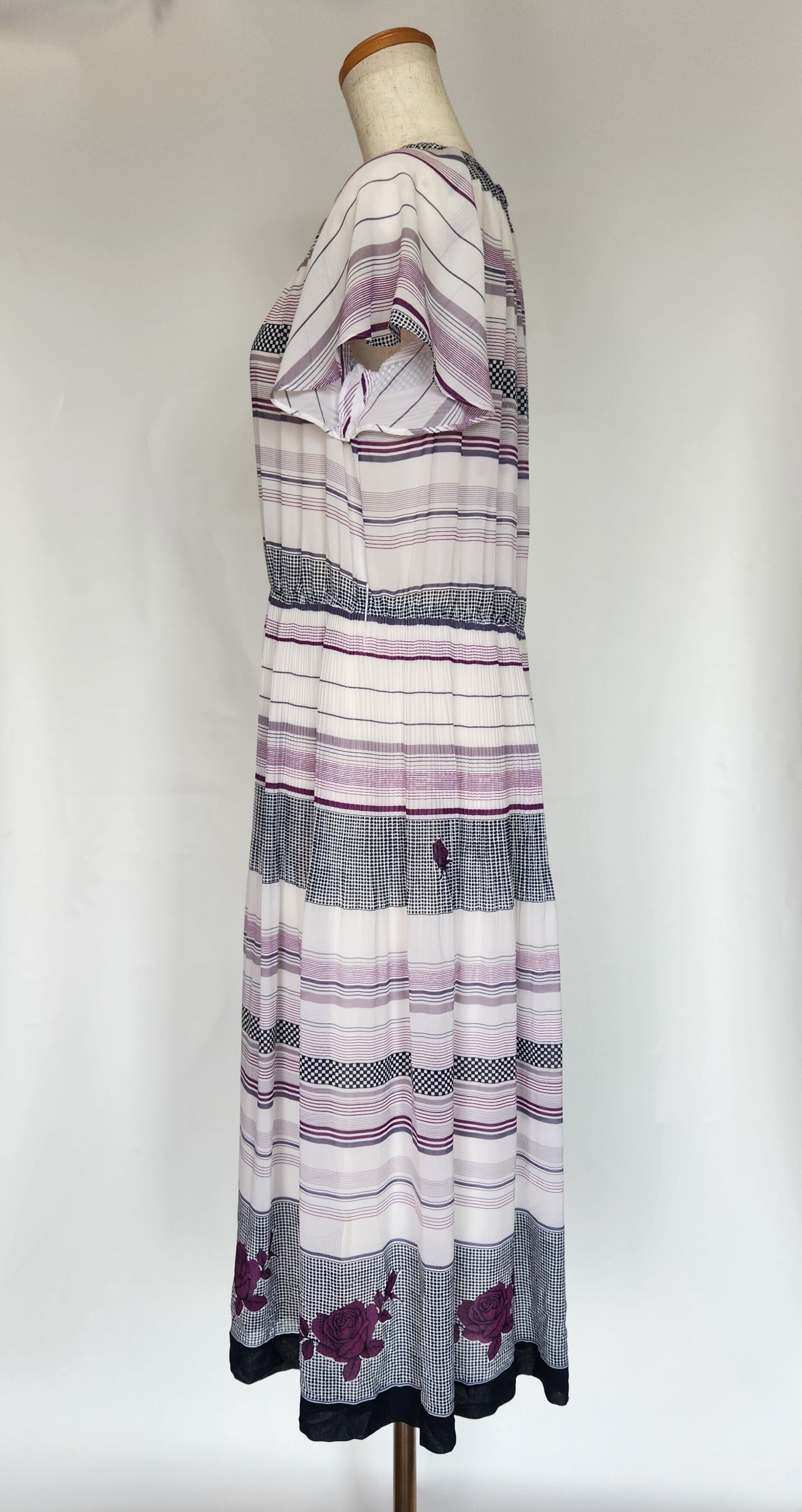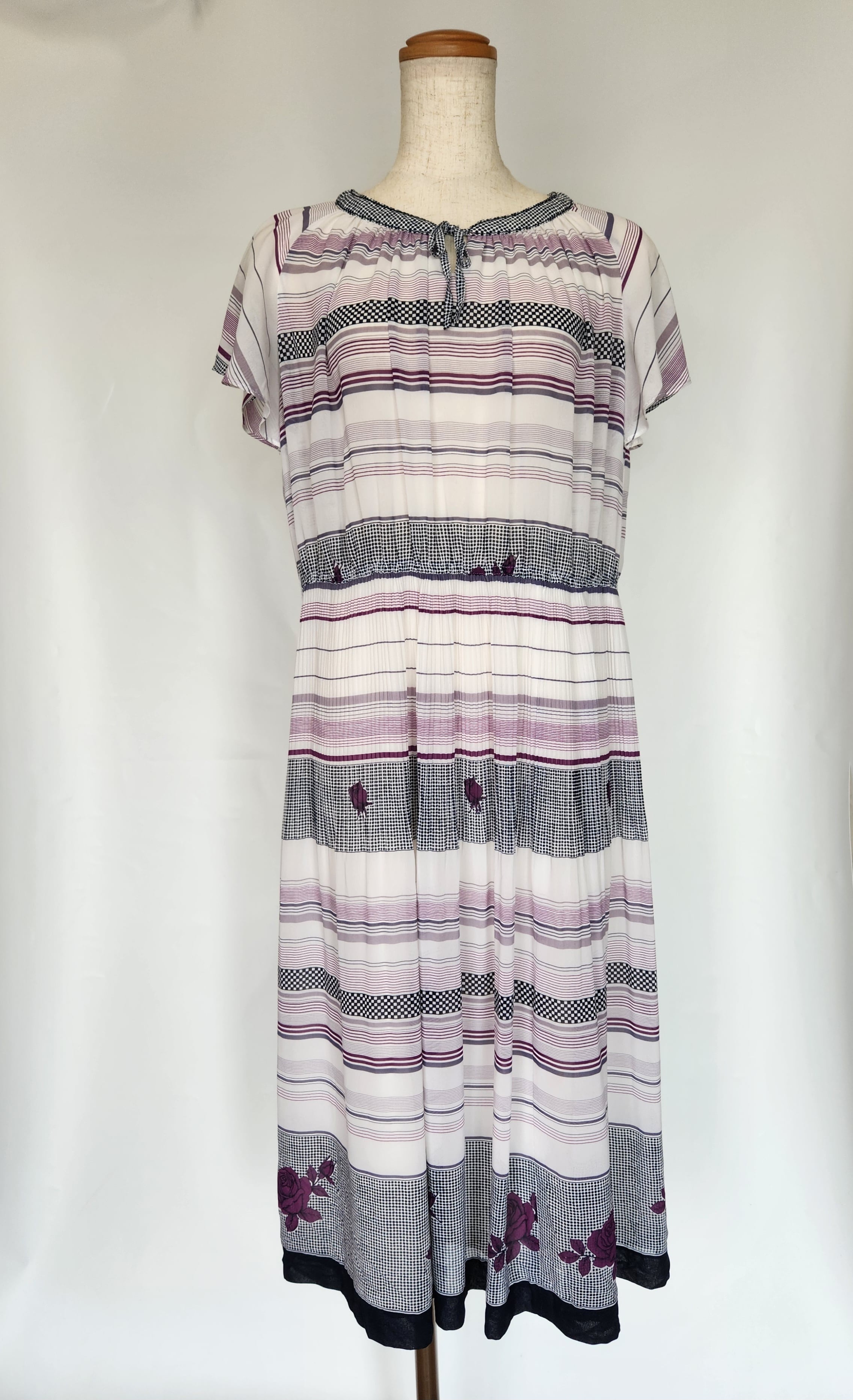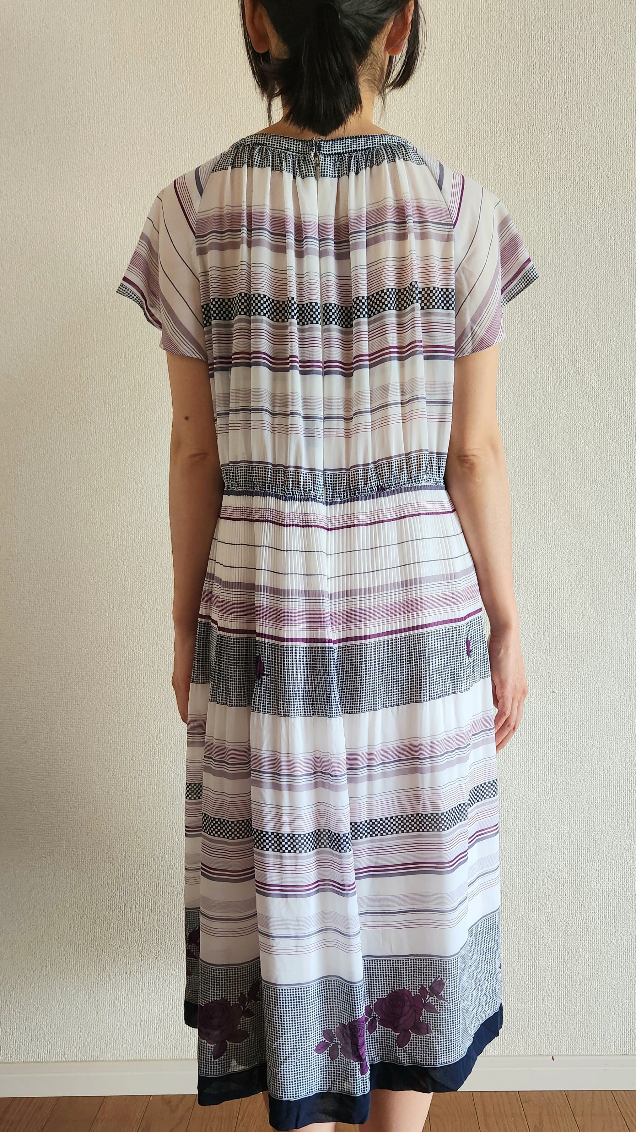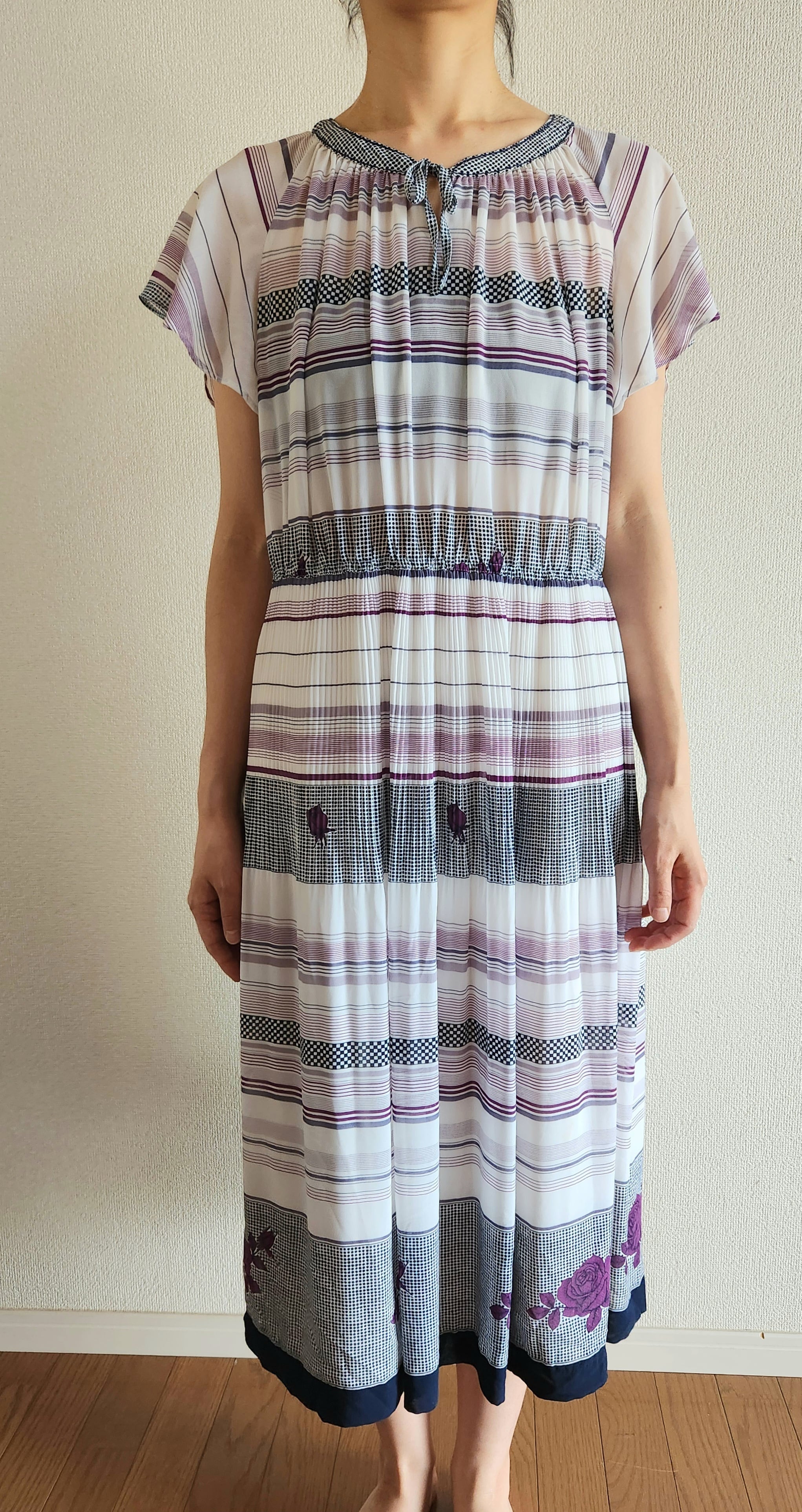 レトロ感のあるワンピースです。紫のバラの柄がポイント。