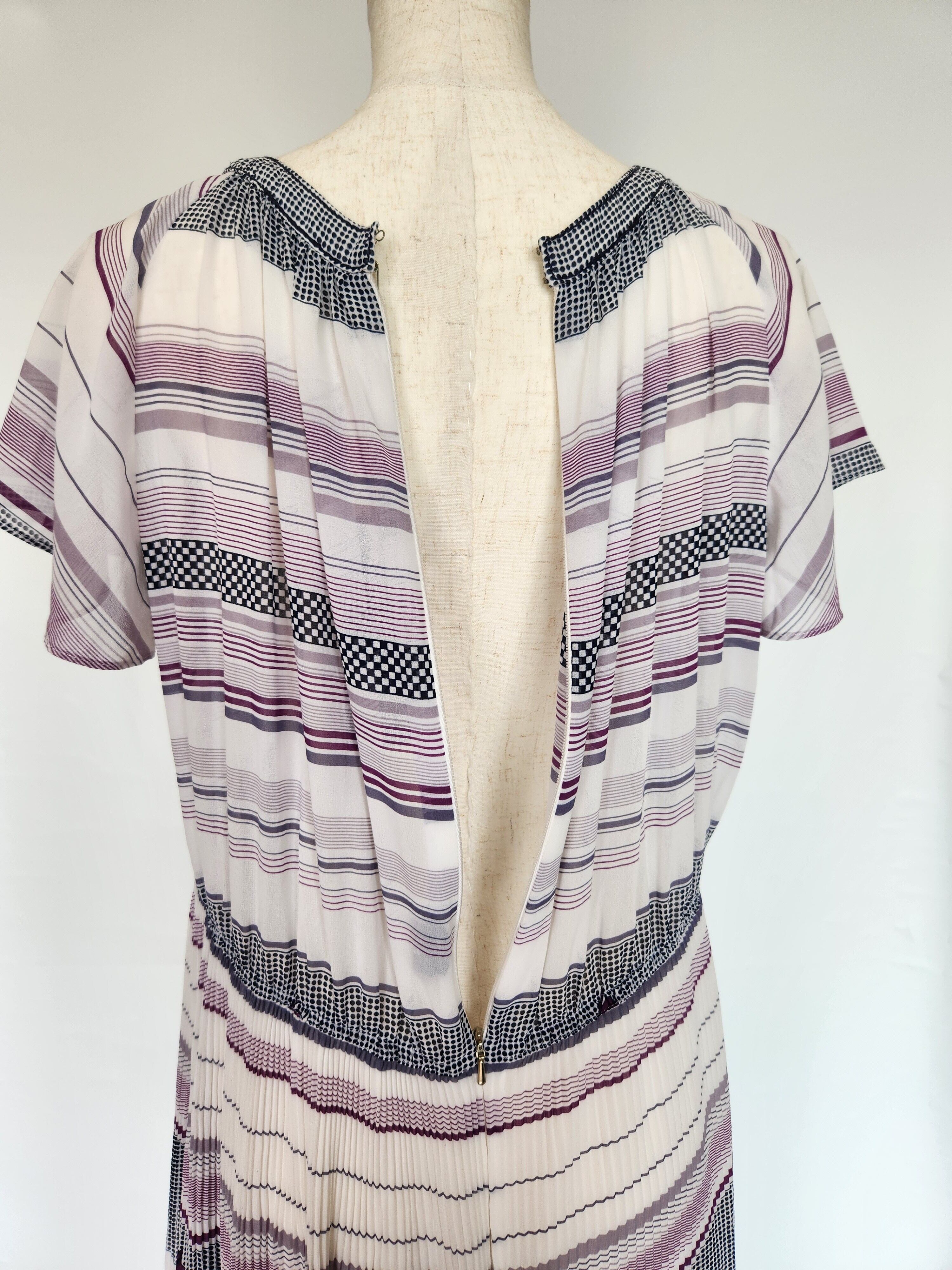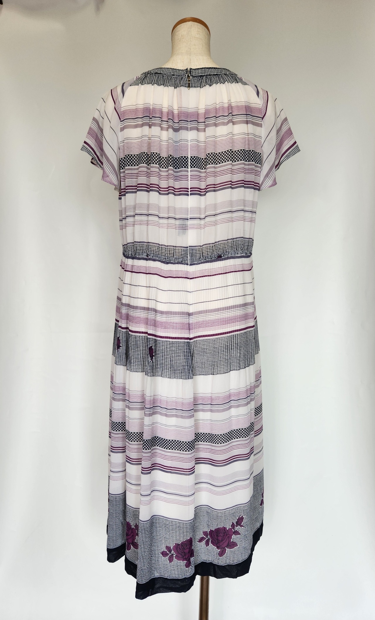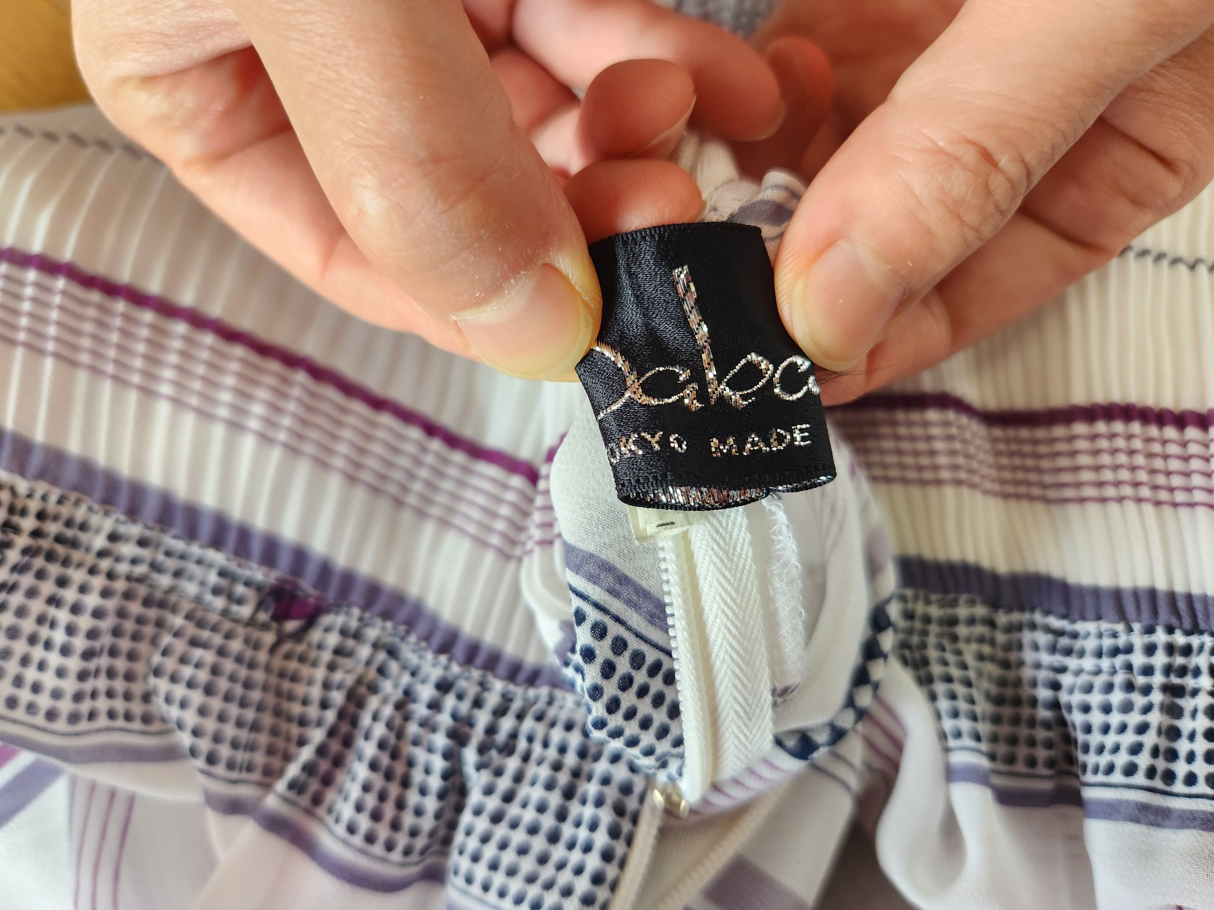 ウエストからスカート中央にのみプリーツが入っていて凝ったデザインです。袖はフレアスリーブです。スカート部分に裏地がついていて、上半身は透け感があります。後ろ中央にチャックがついていてウエスト部分はゴムなので着脱しやすいと思います。オランダで買付しましたが、SAKAI TOKYO MADEとタグがついています。逆輸入品です。ポケットはついていません。