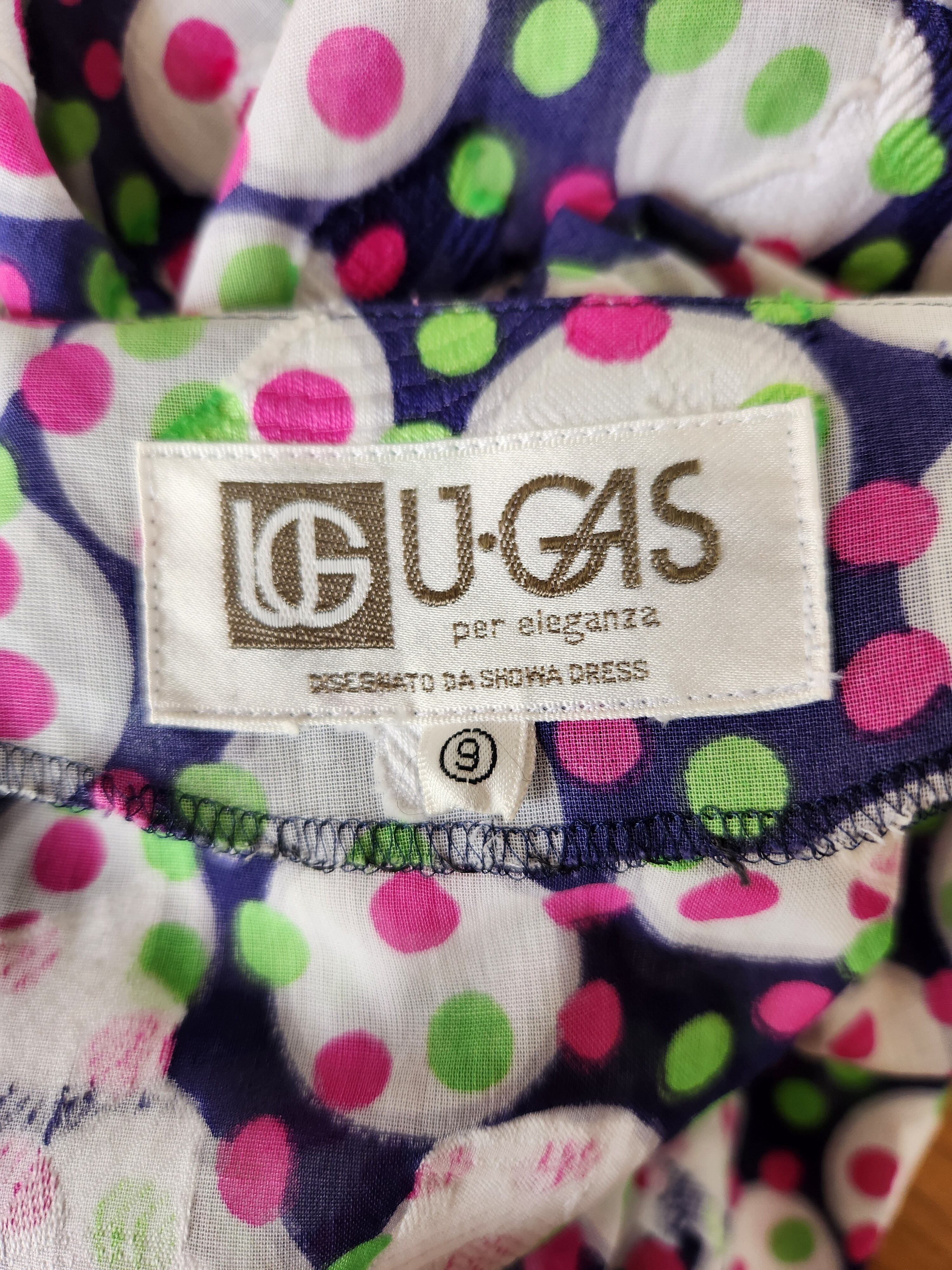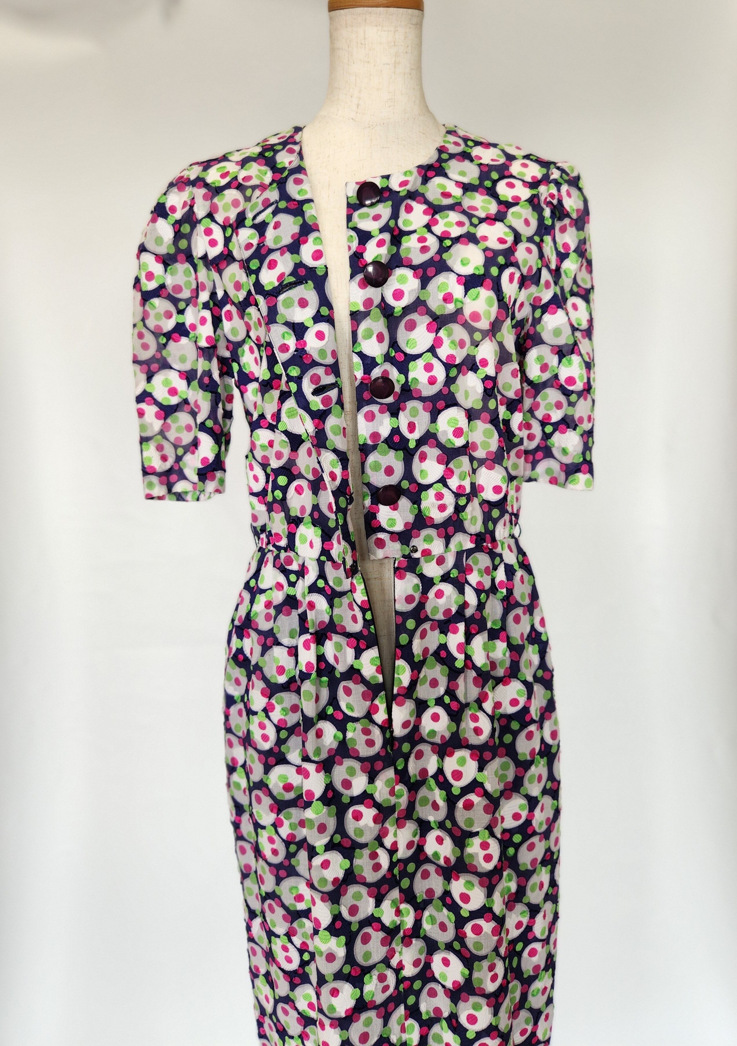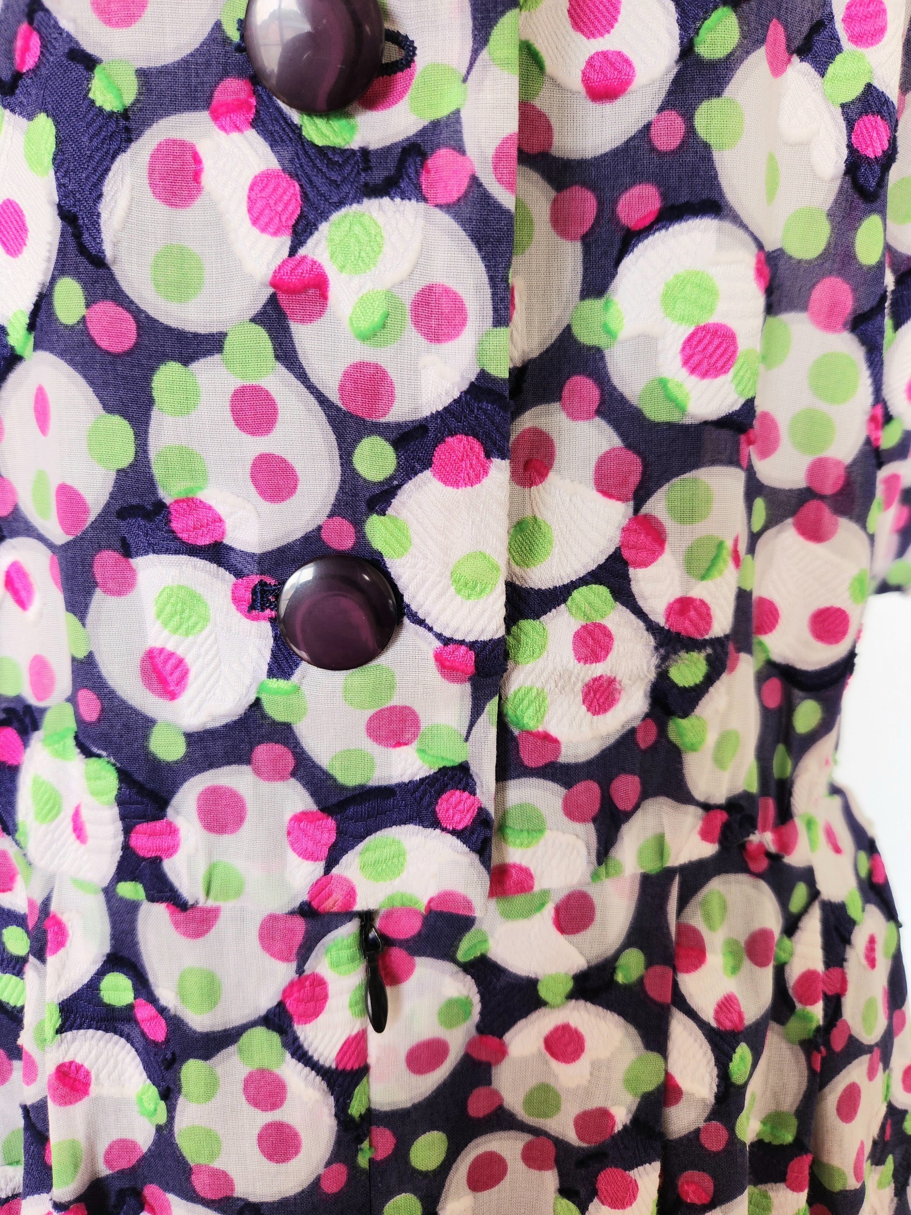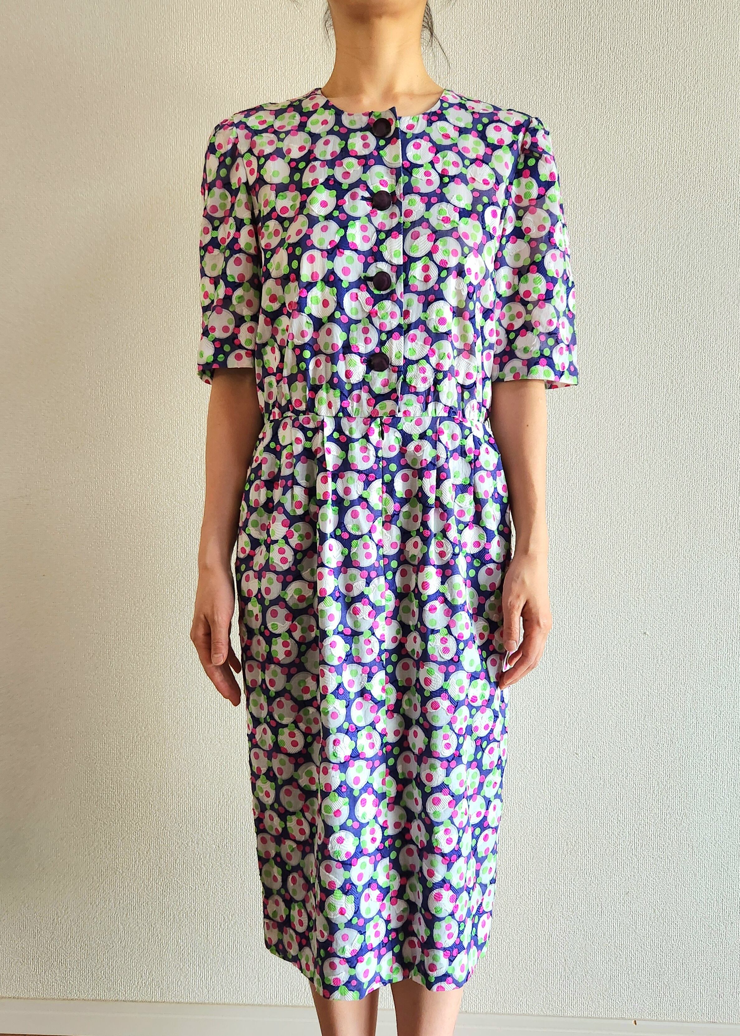 水玉模様に、凹凸感のある葉っぱのような模様の生地がかわいいタイトめのワンピースです。前身頃中央にボタンと、ウエストから下にチャックがついています。オランダで買付しましたが、昭和ドレスのヴィンテージ品です。ポケットはついていません。
