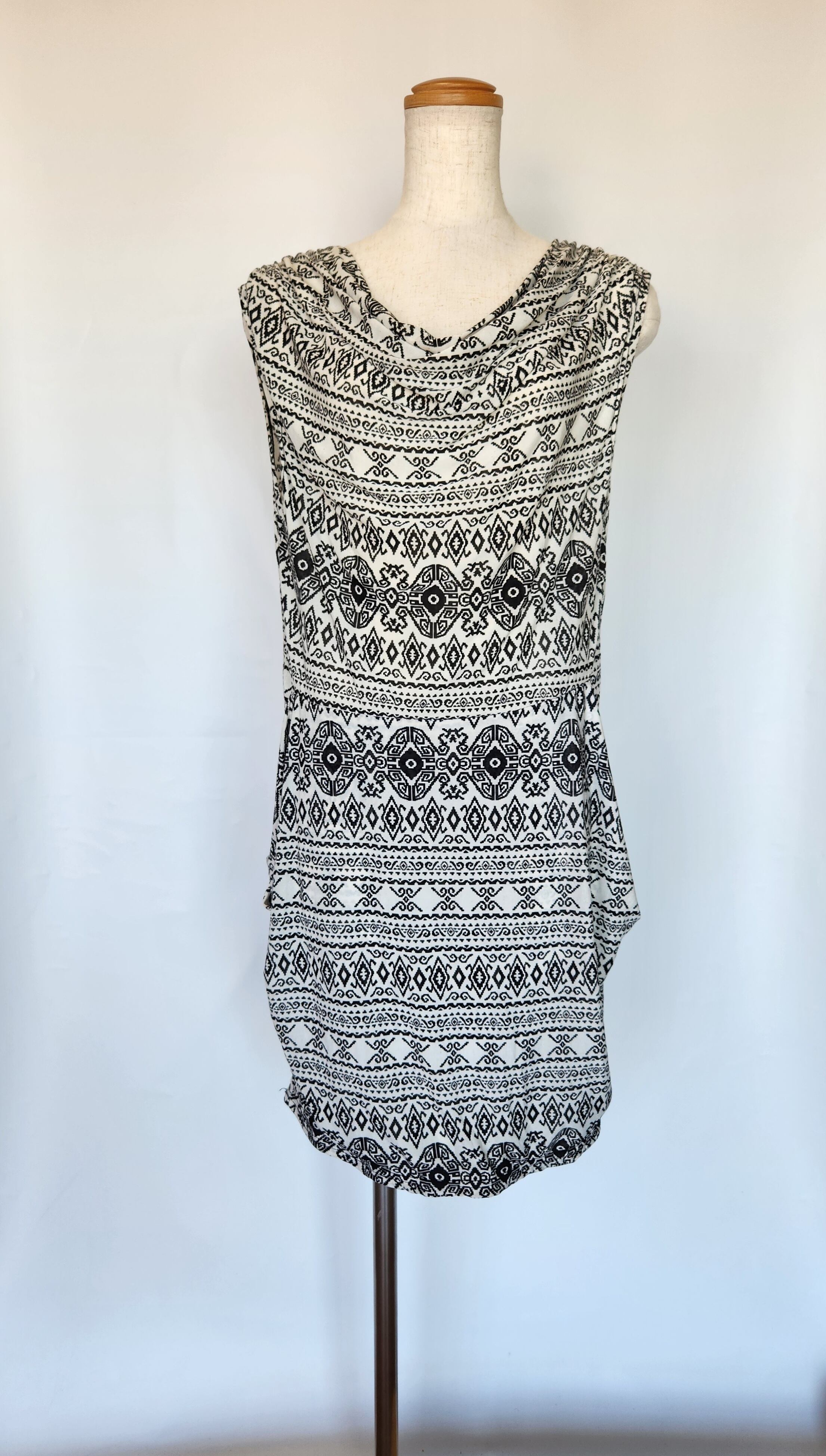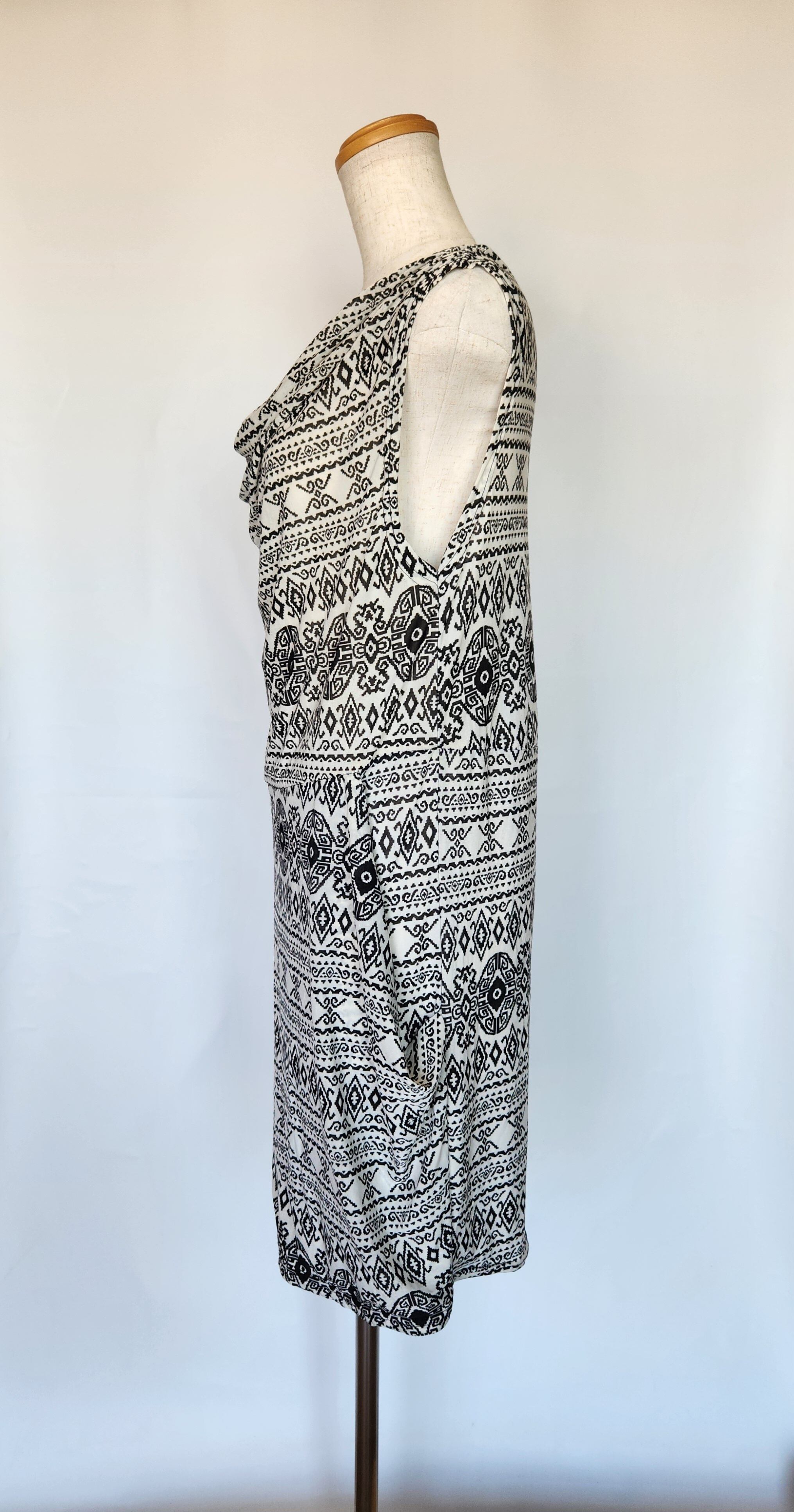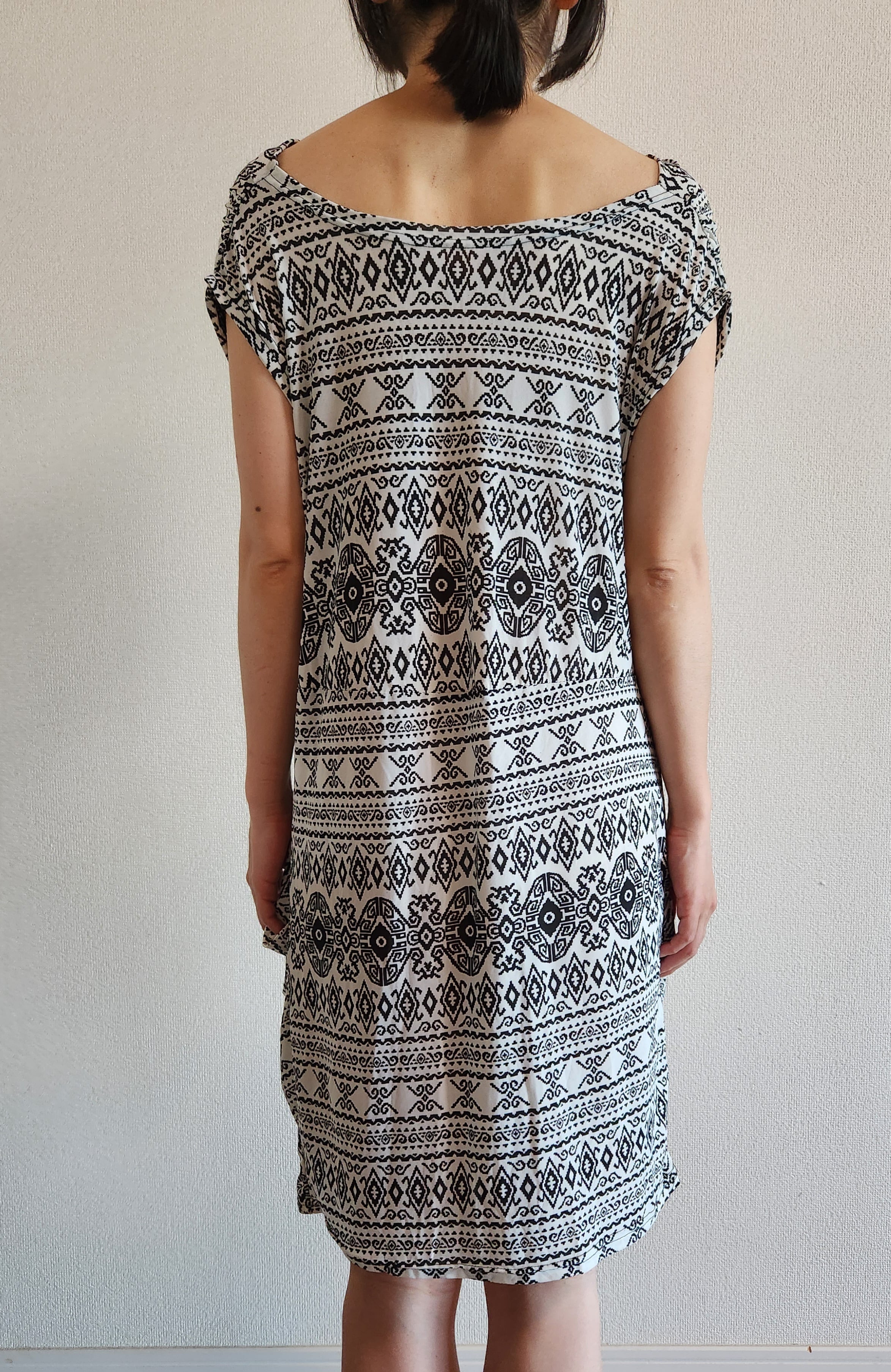 幾何学模様がかわいいワンピースです。前身頃両側から手を入れられる裾までサイズの大きいポケットがついています。