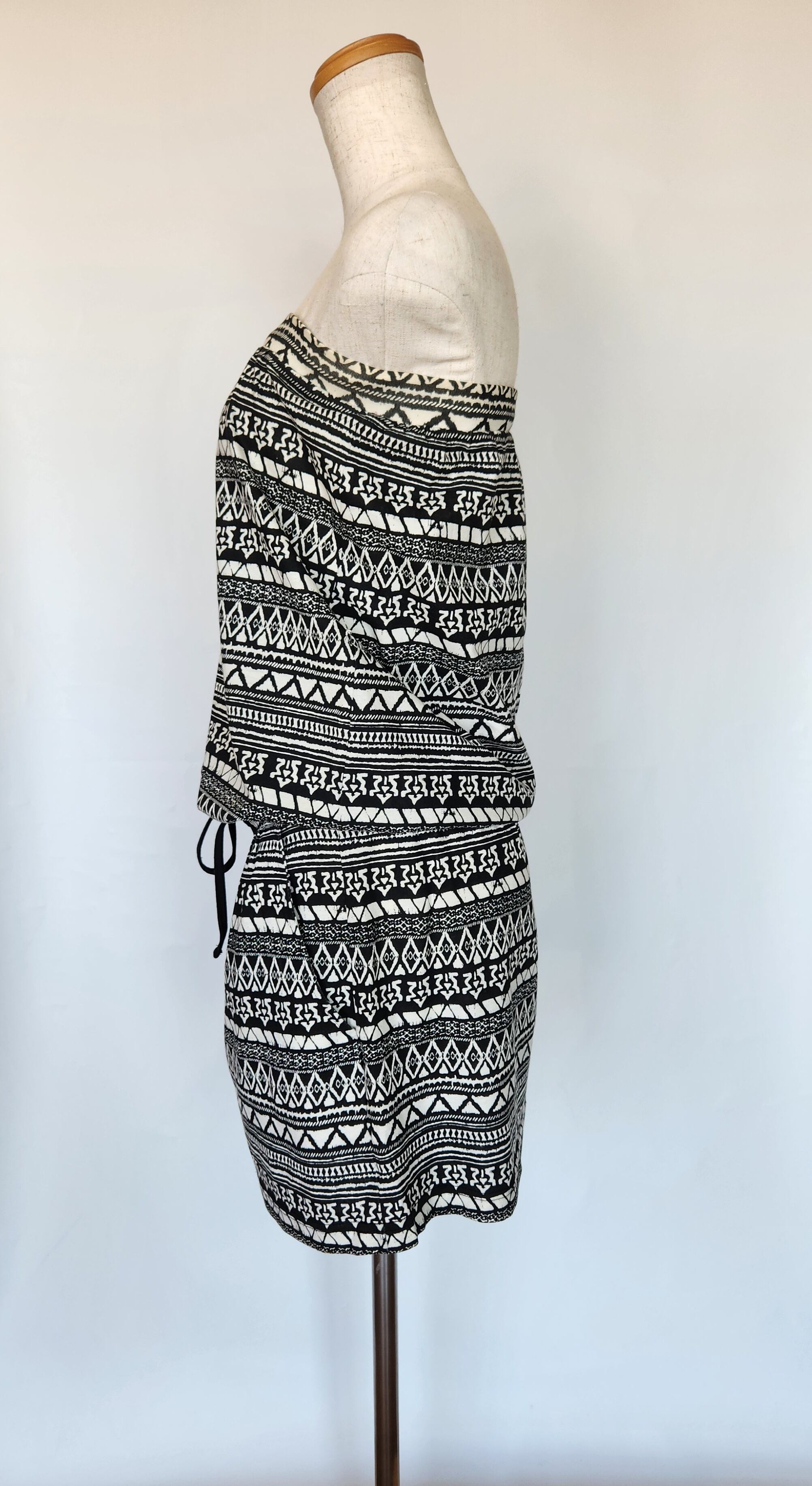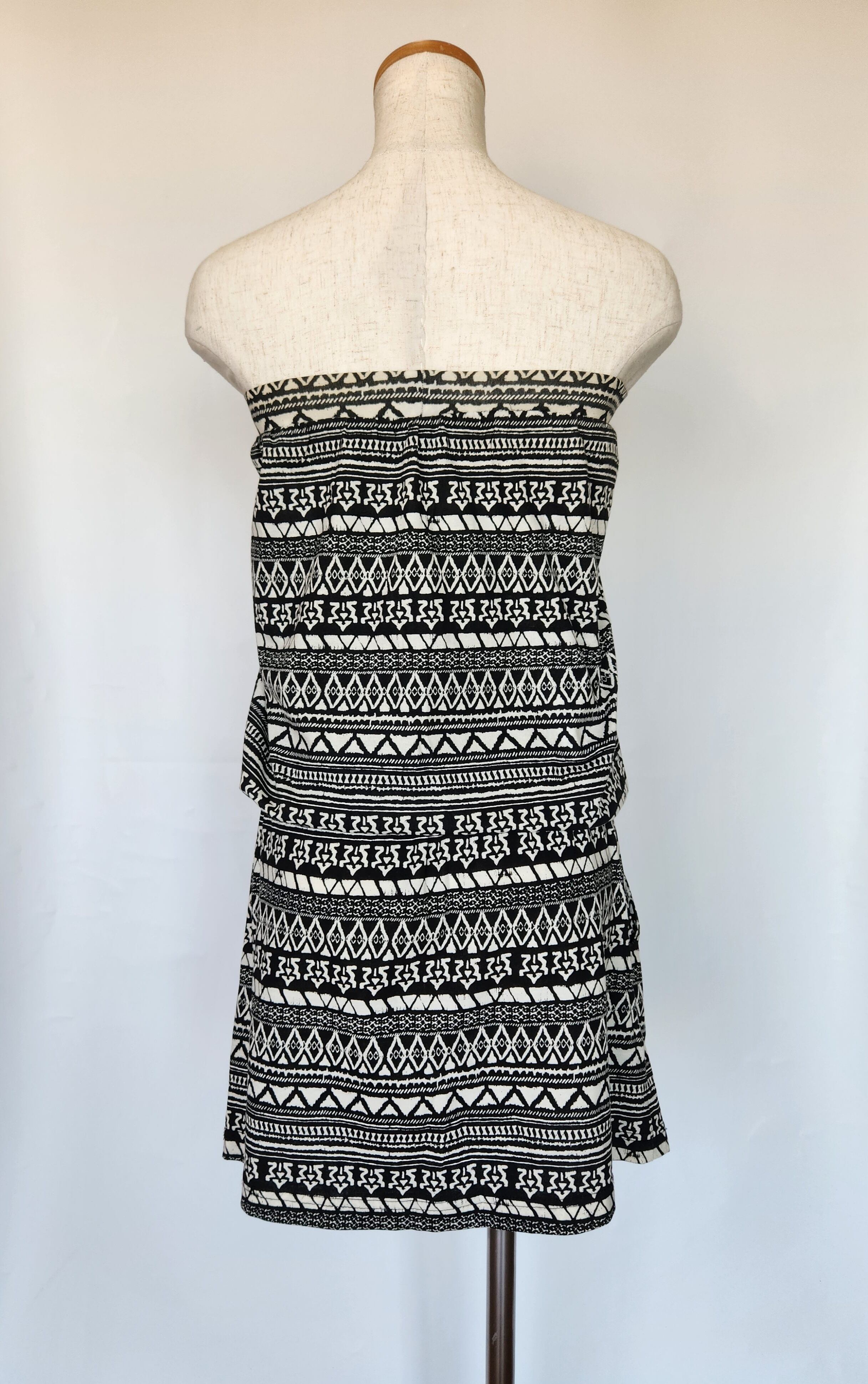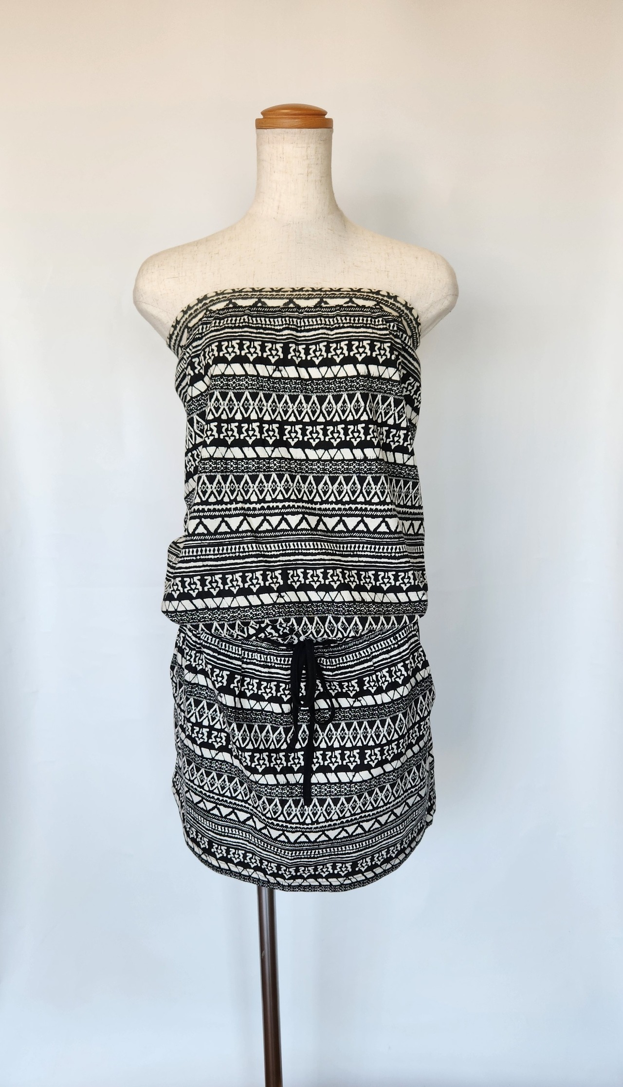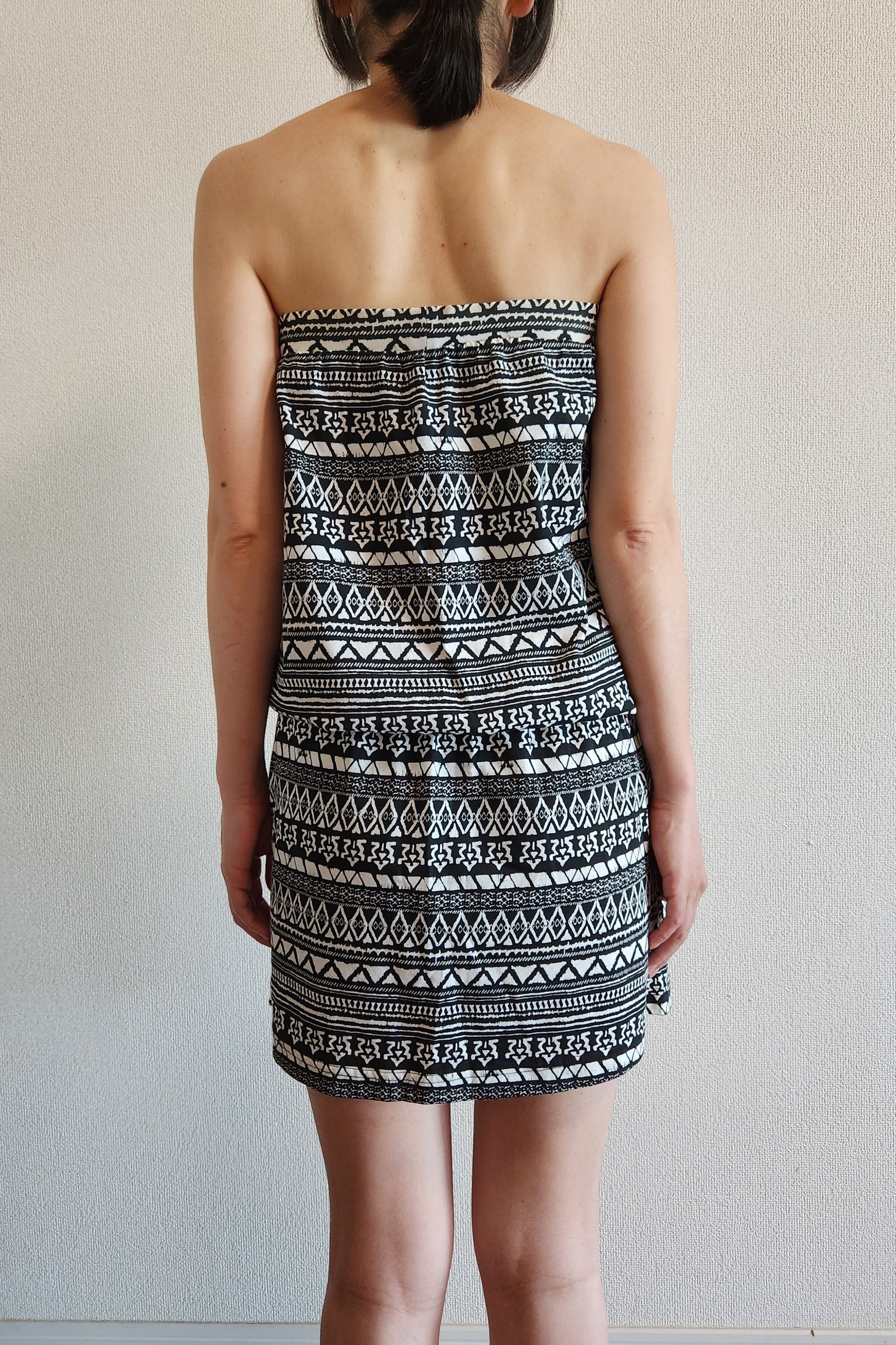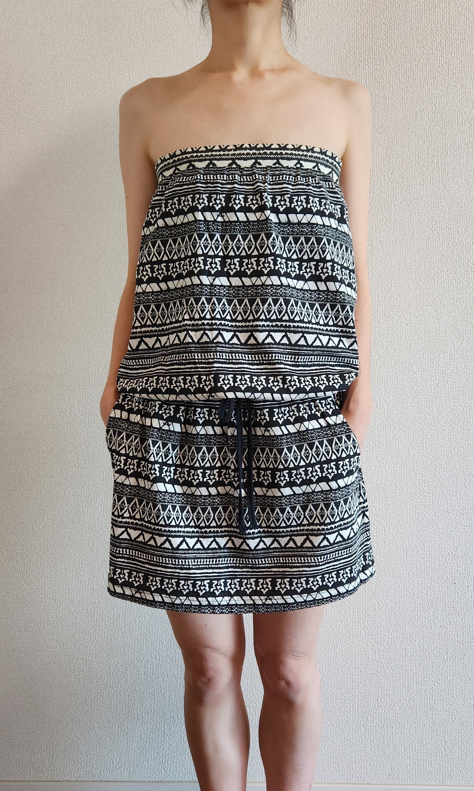 幾何学模様がかわいいチューブトップのワンピースです。ウエストはゴムで調整できます。左右にポケットがついています。