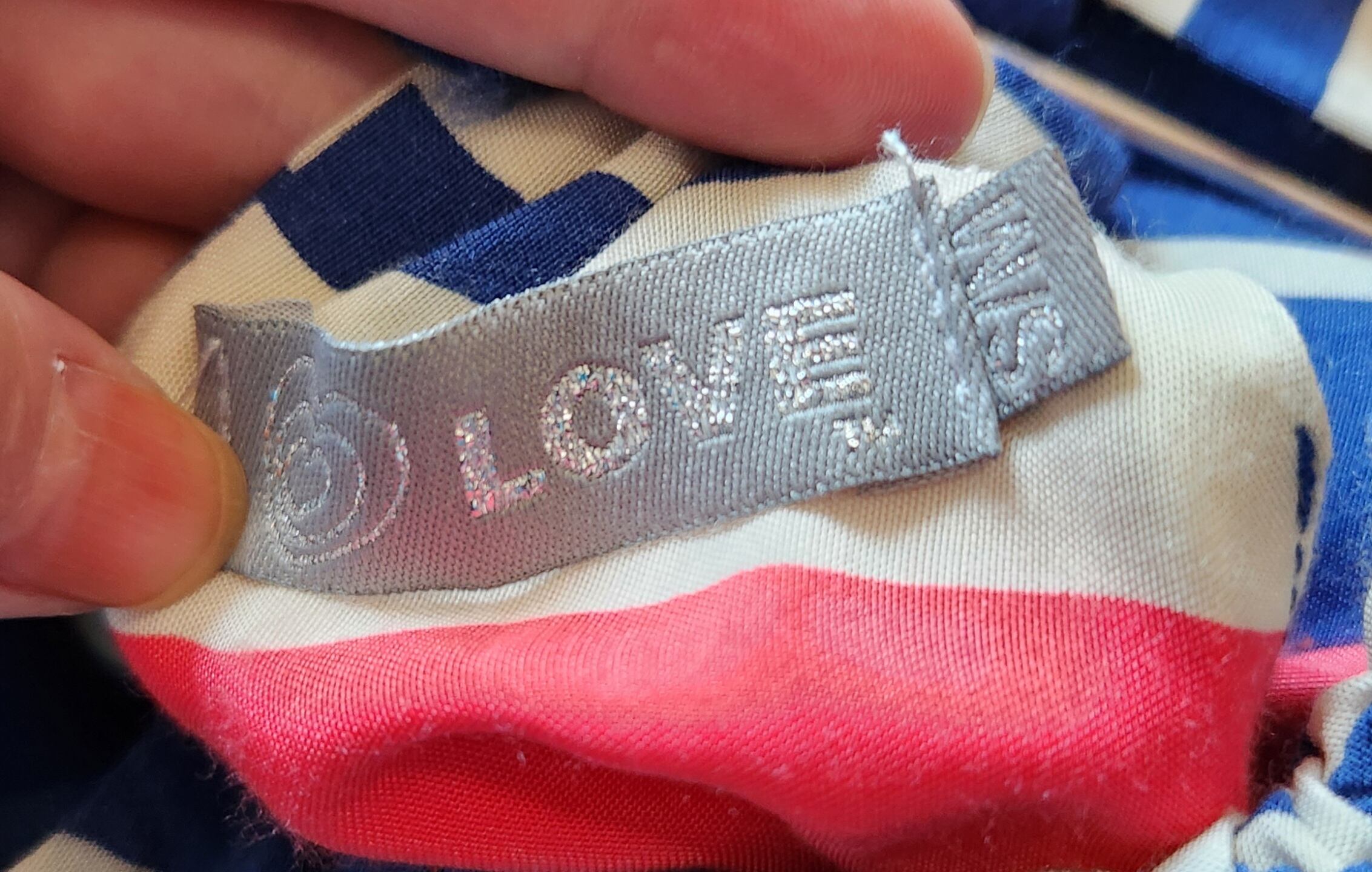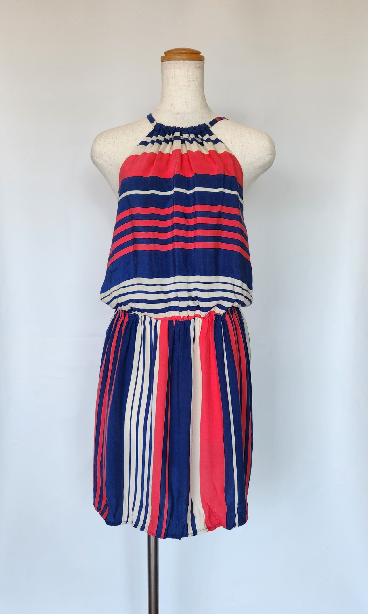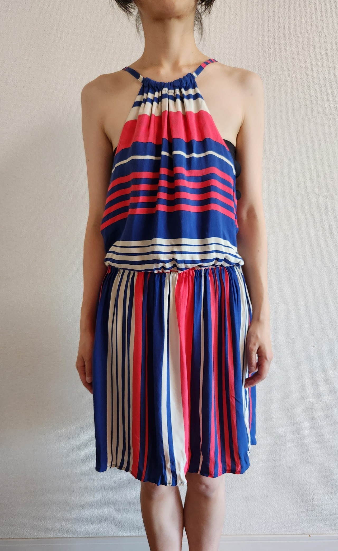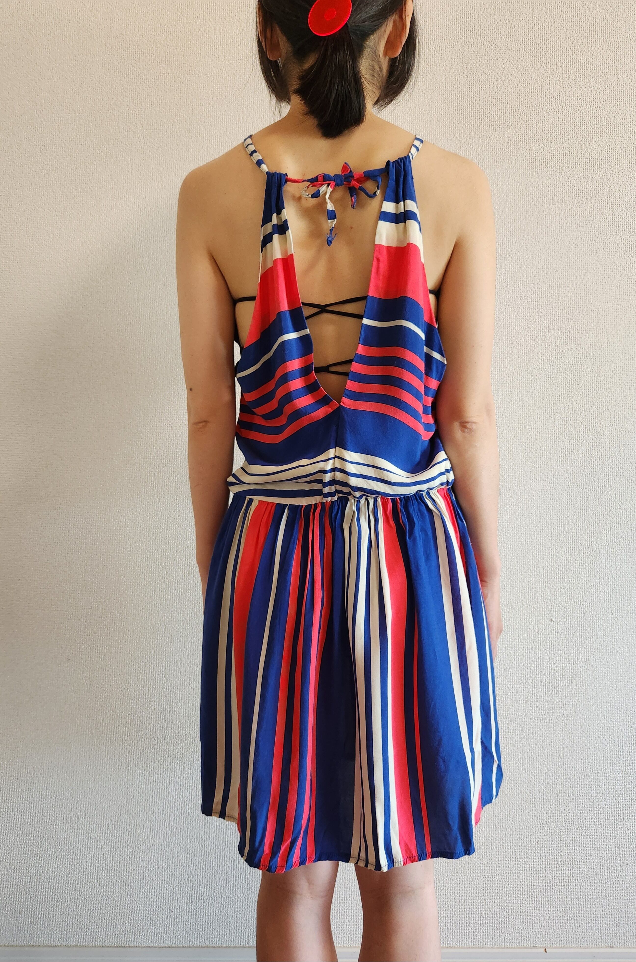 夏を感じさせるストライプ柄と、背中中央が少し見えるデザインが可愛いです。後ろ首元でリボンを結んで調整できます。ウエストはゴムで伸縮します。ポケットはありません。