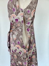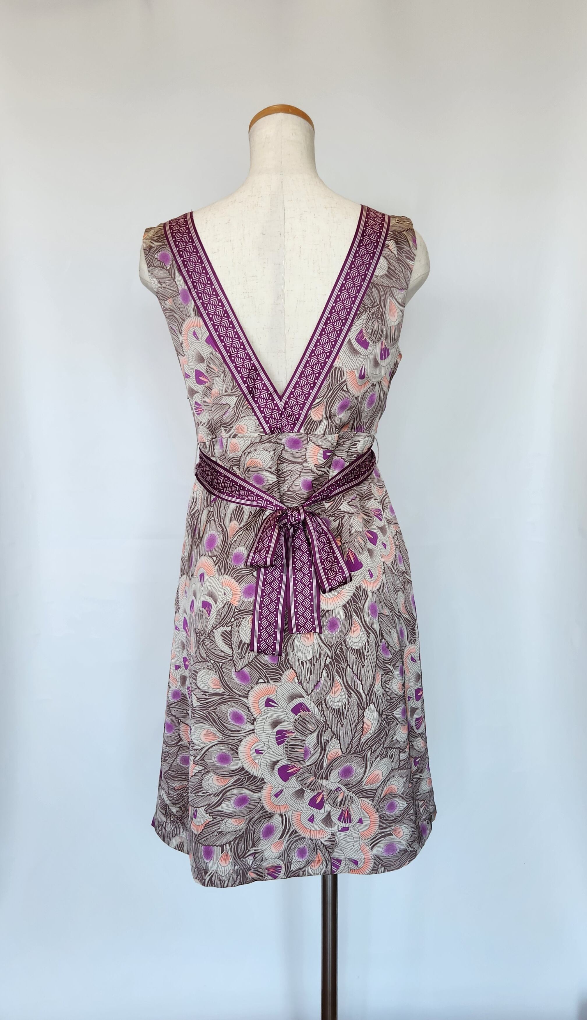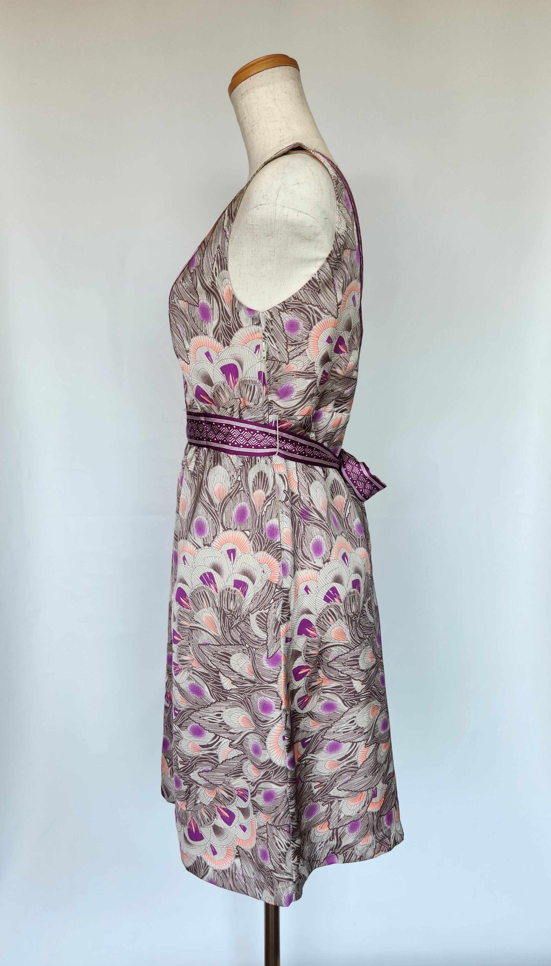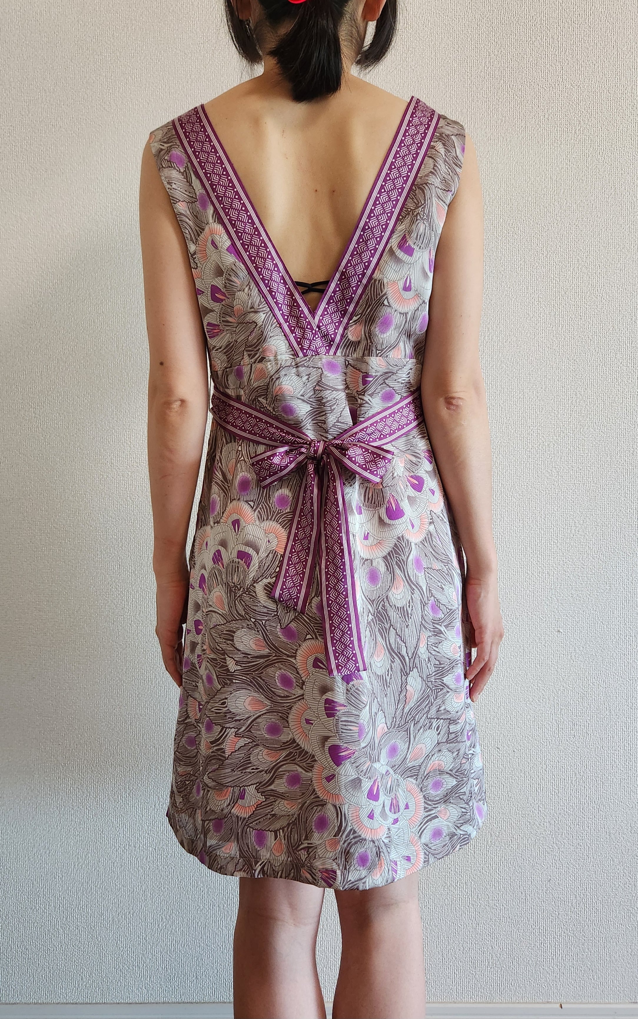 光沢のある孔雀の羽模様が可愛いワンピースです。ウエストにリボンがついて、前でも後ろでも結ぶことができます。左脇に着脱用のチャックがついています。ポケットはありません。裏地がついているので透けません。