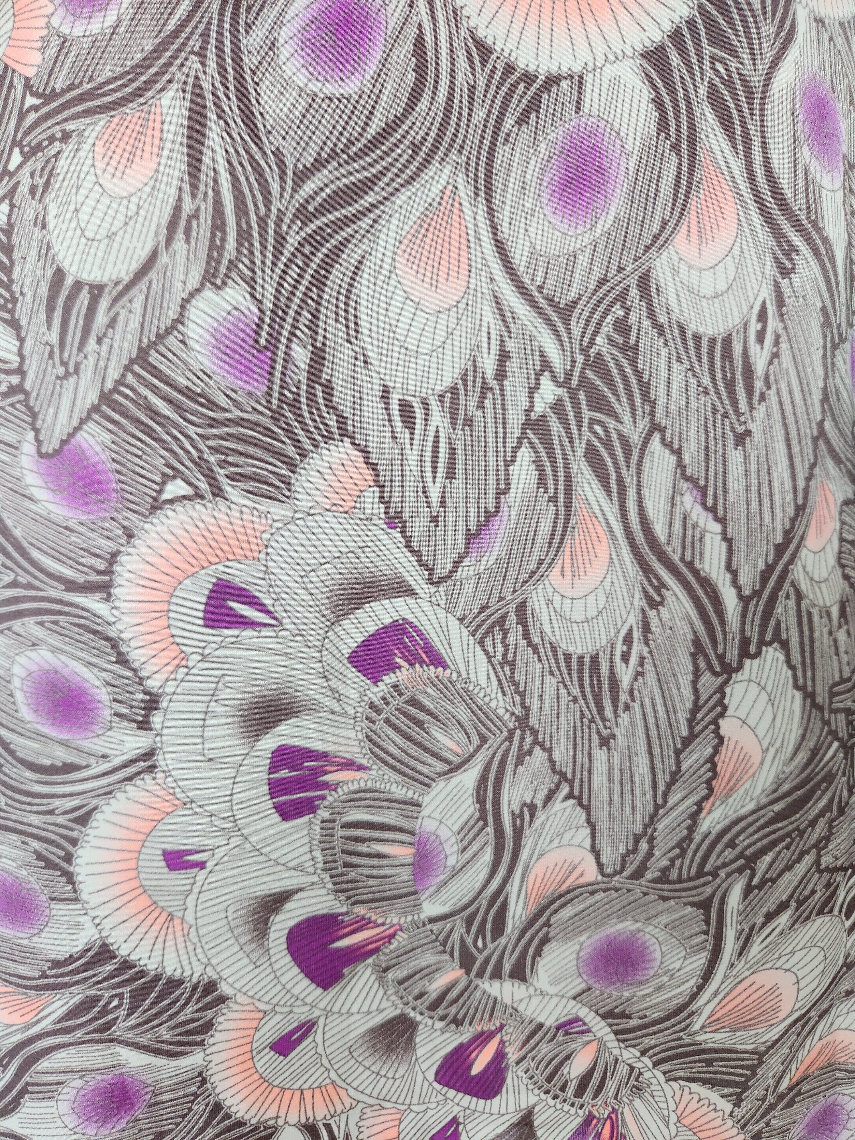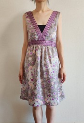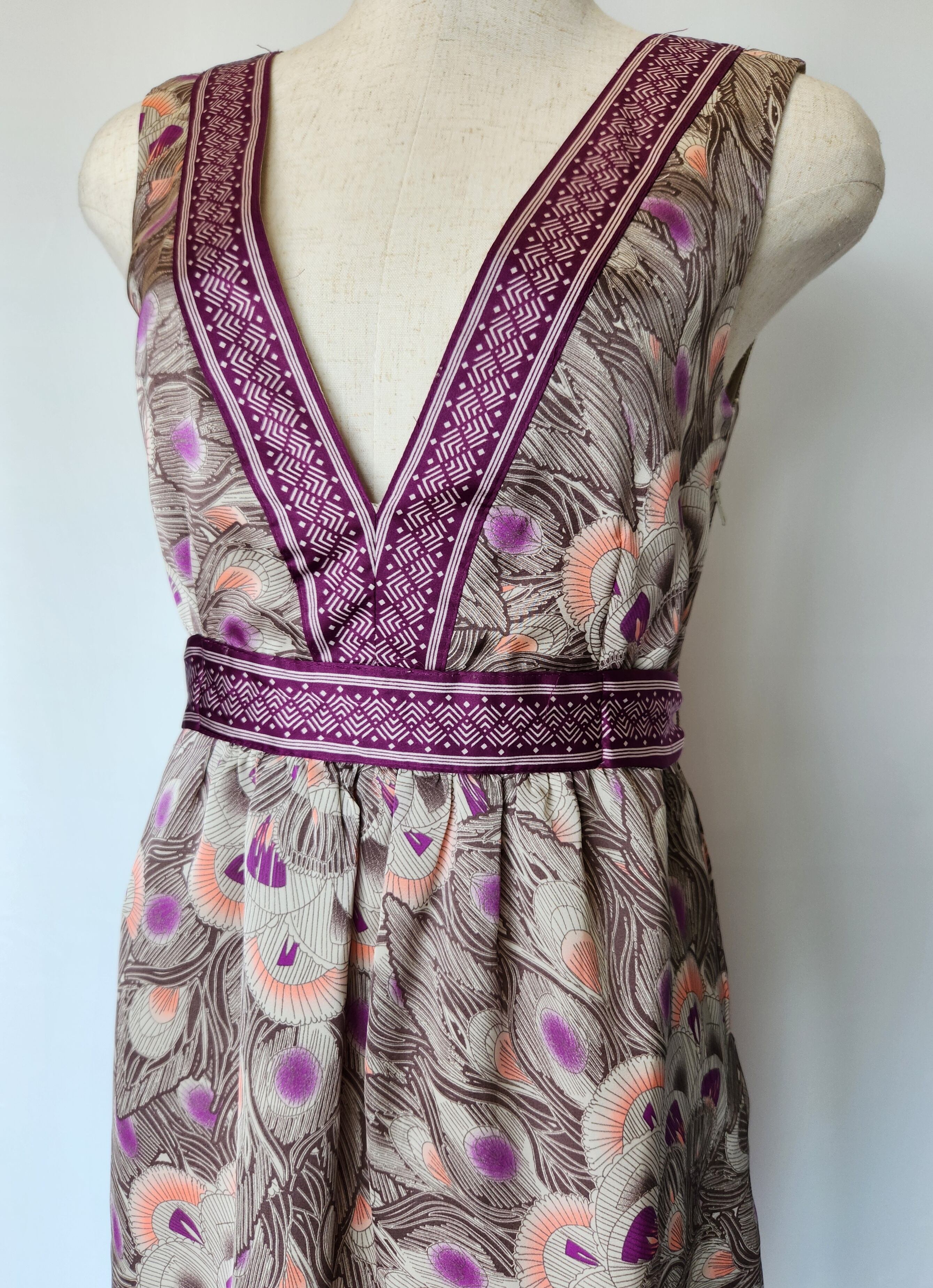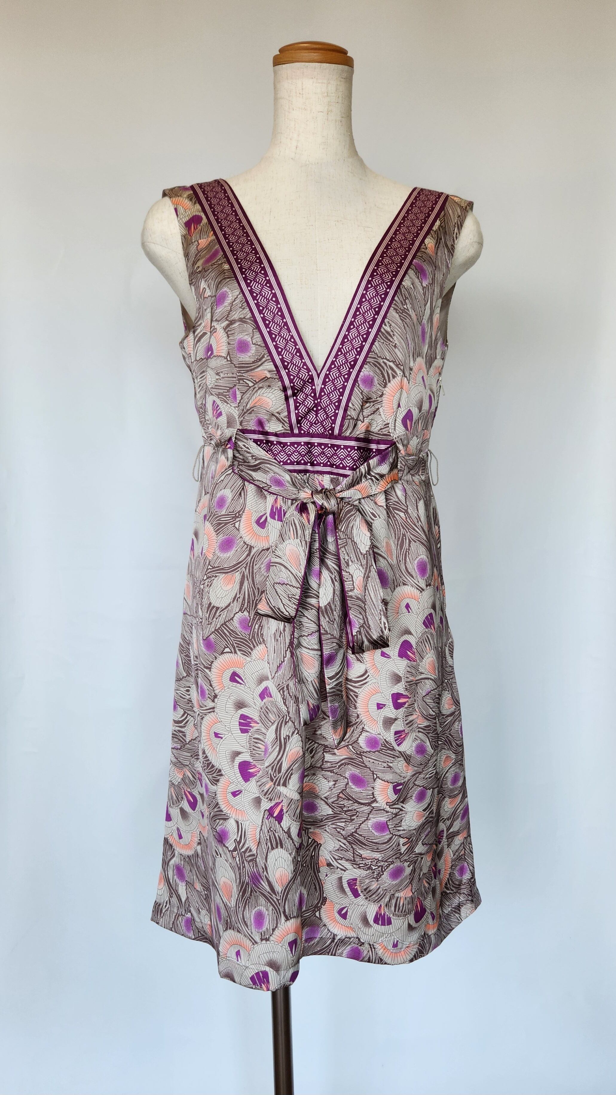 光沢のある孔雀の羽模様が可愛いワンピースです。ウエストにリボンがついて、前でも後ろでも結ぶことができます。左脇に着脱用のチャックがついています。ポケットはありません。裏地がついているので透けません。