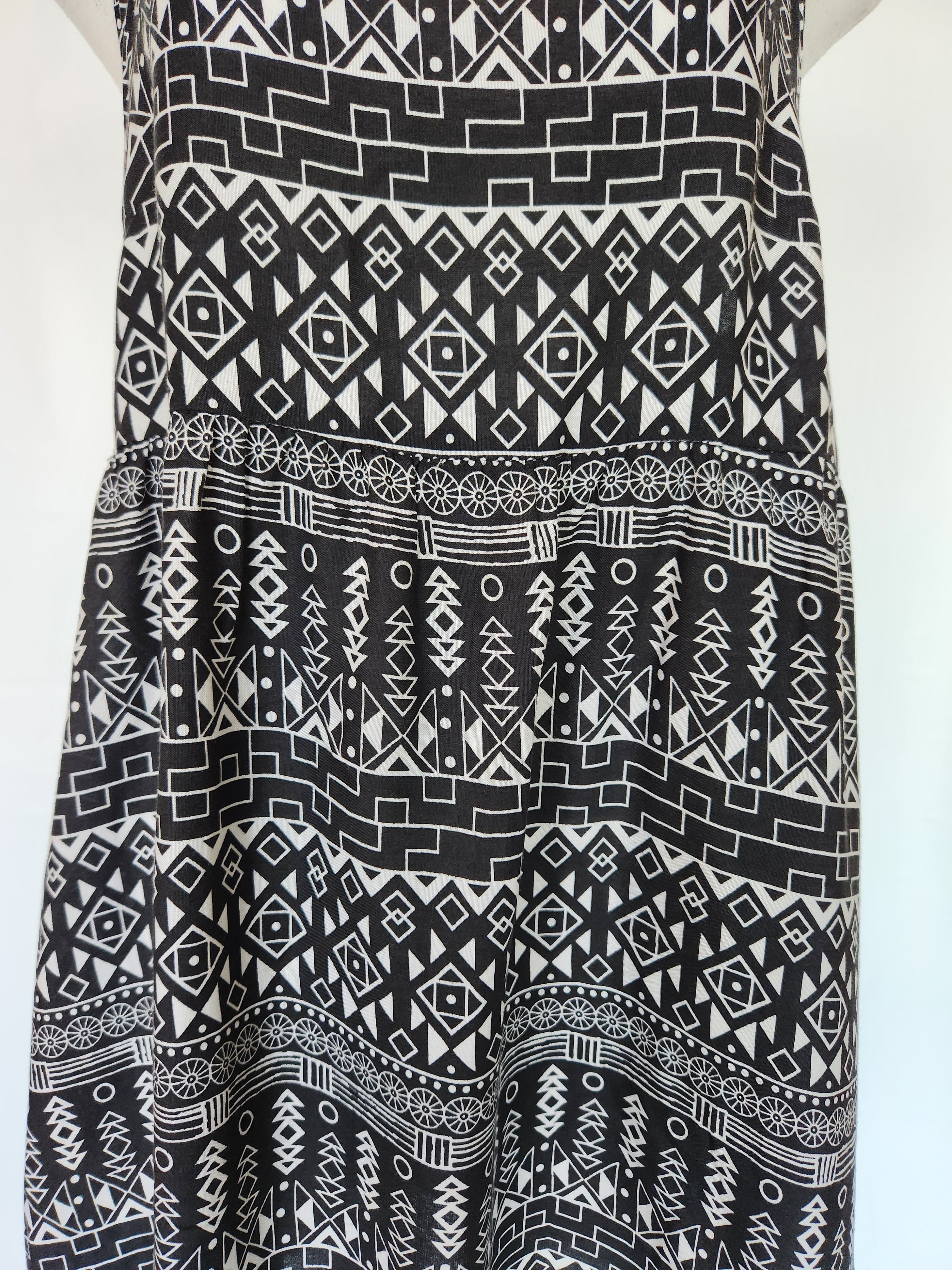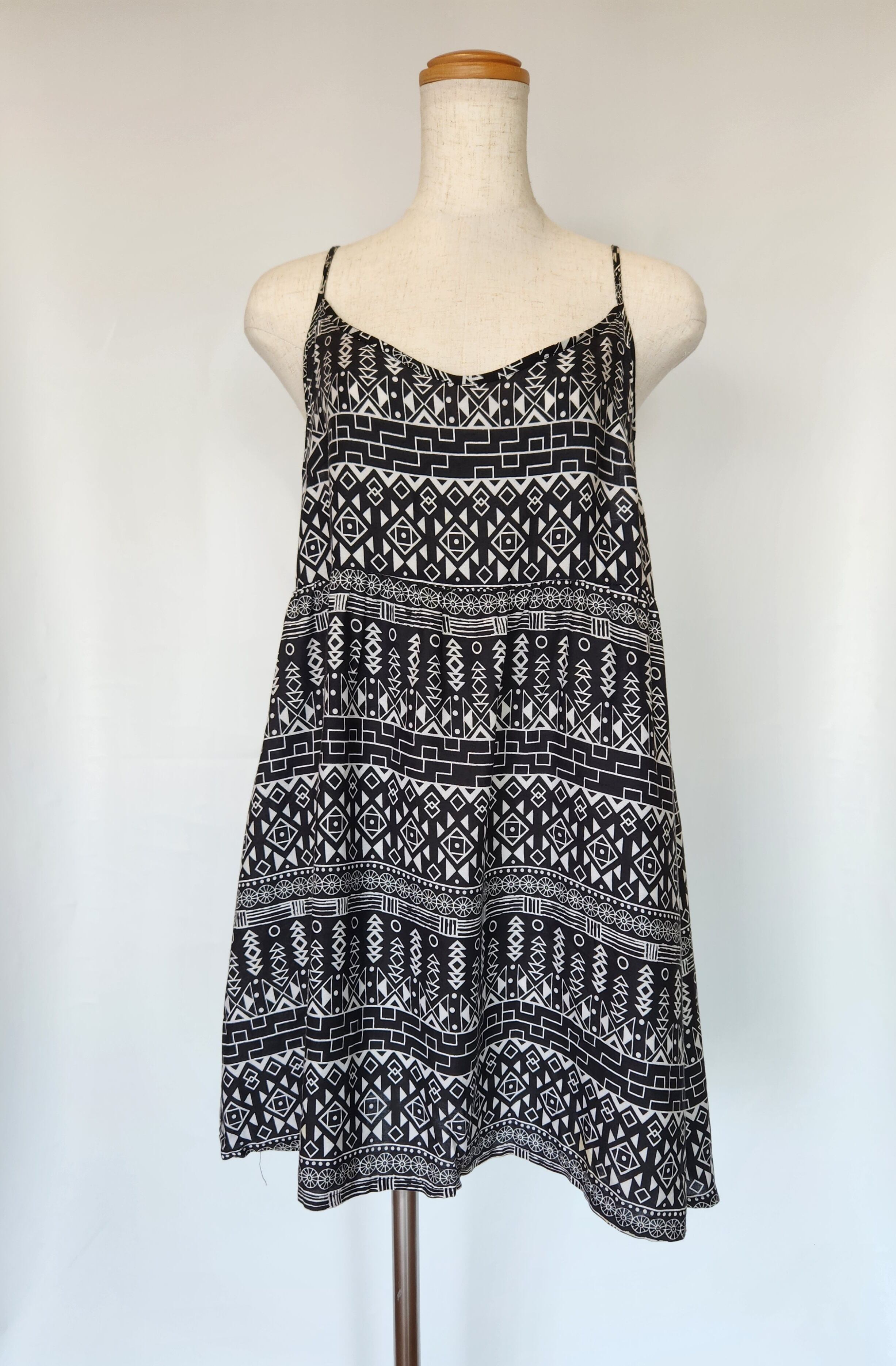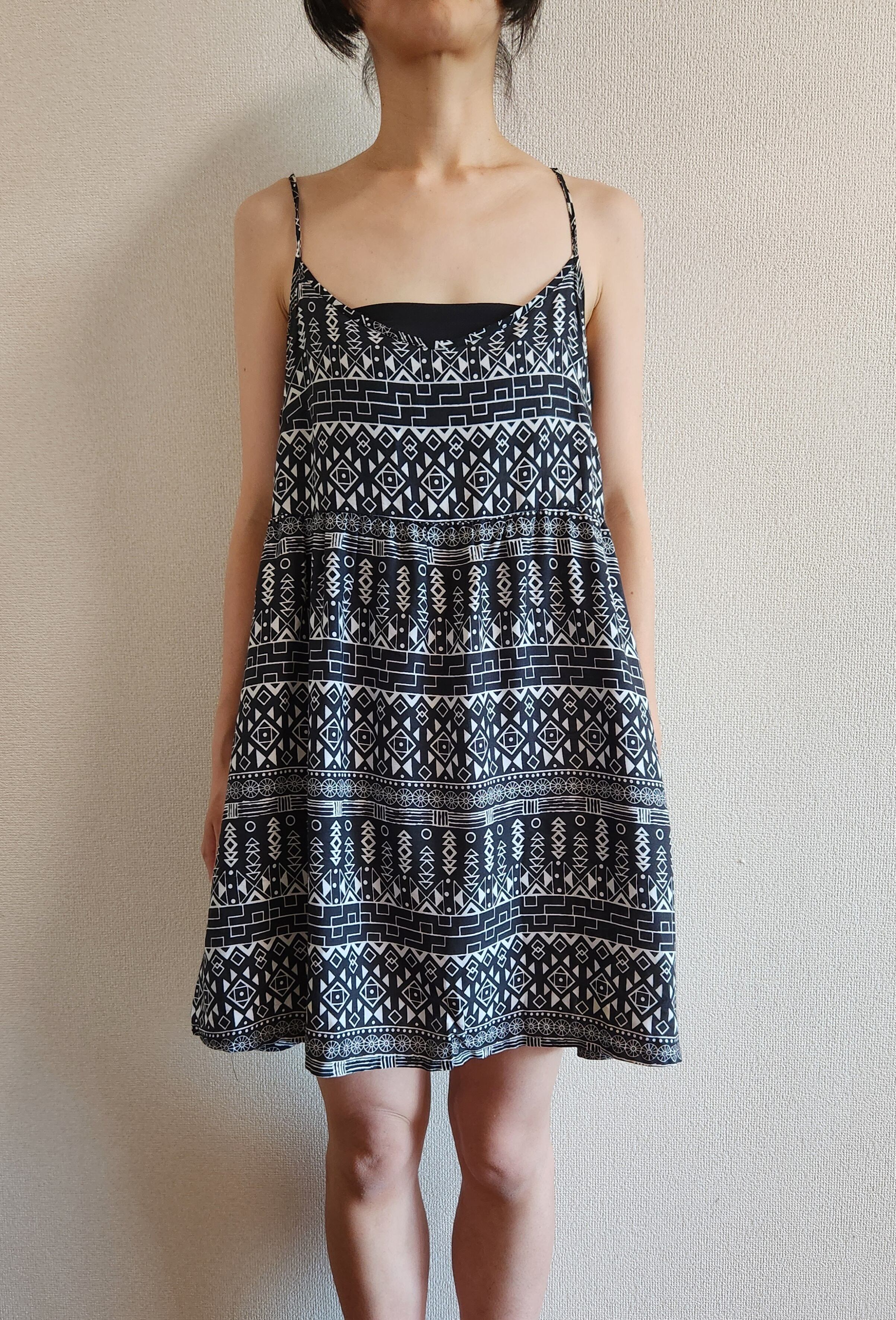 幾何学模様の柄が可愛いです。裾にかけて緩やかに広がるデザインですので楽に着ていただけます。ポケットはありません。