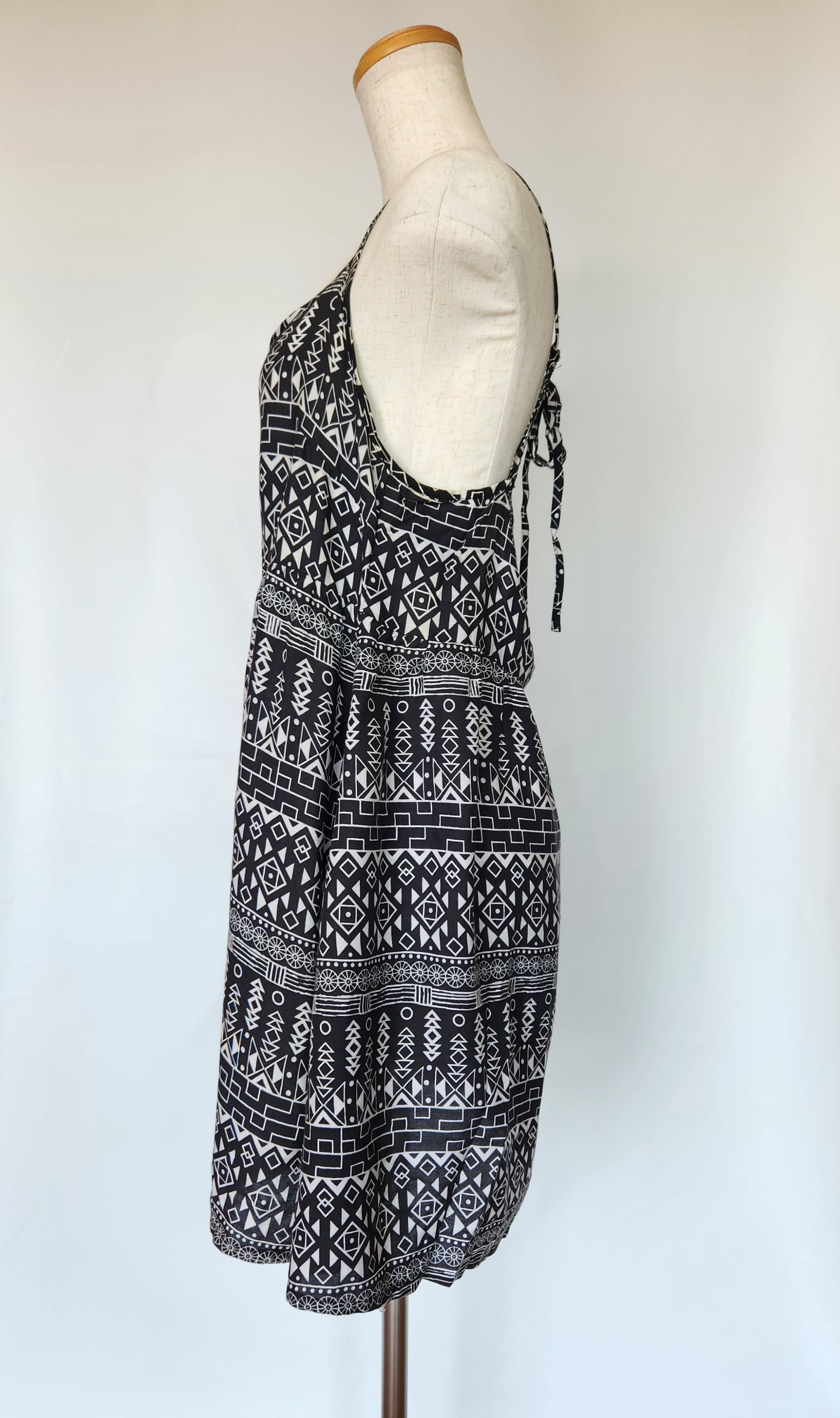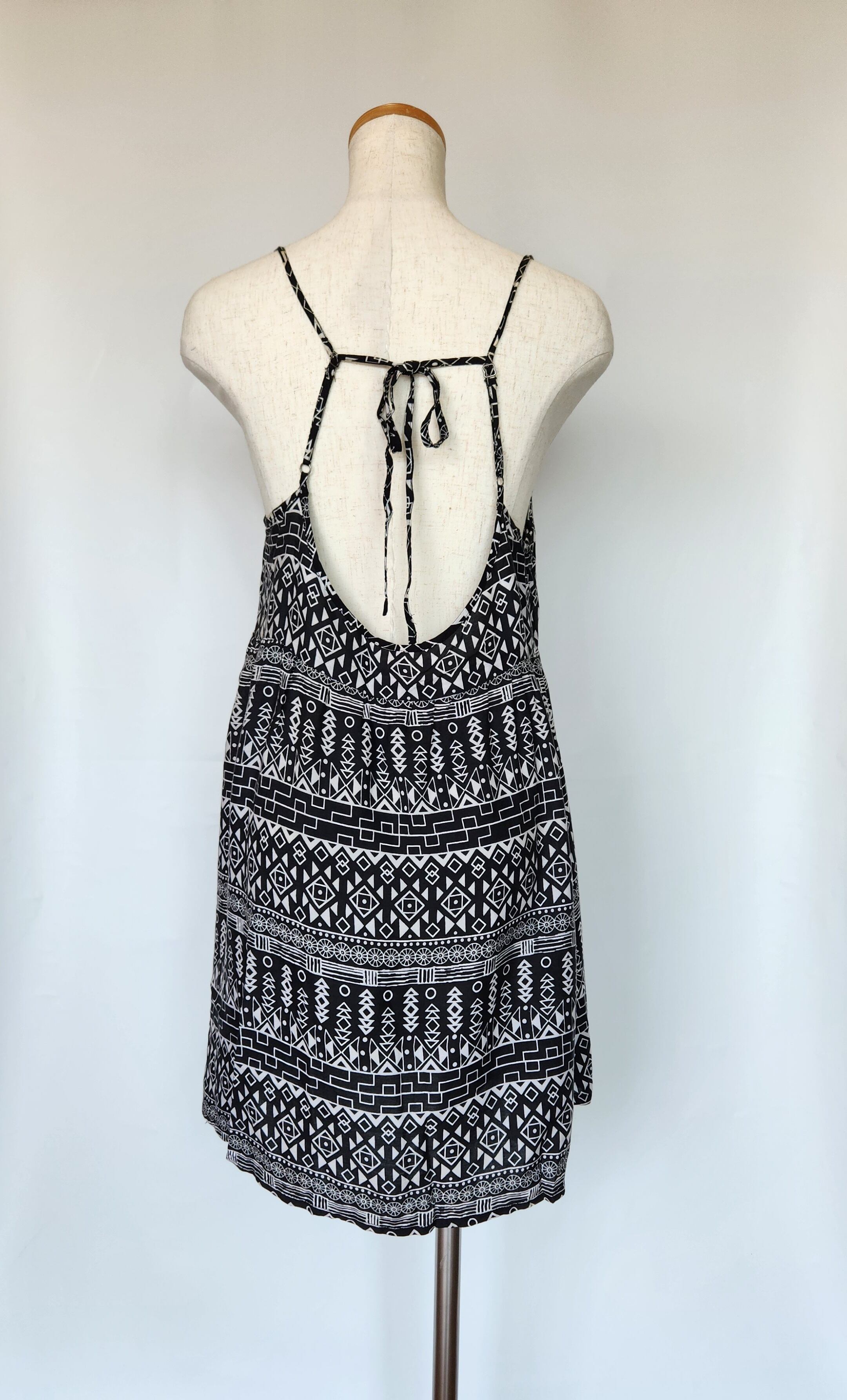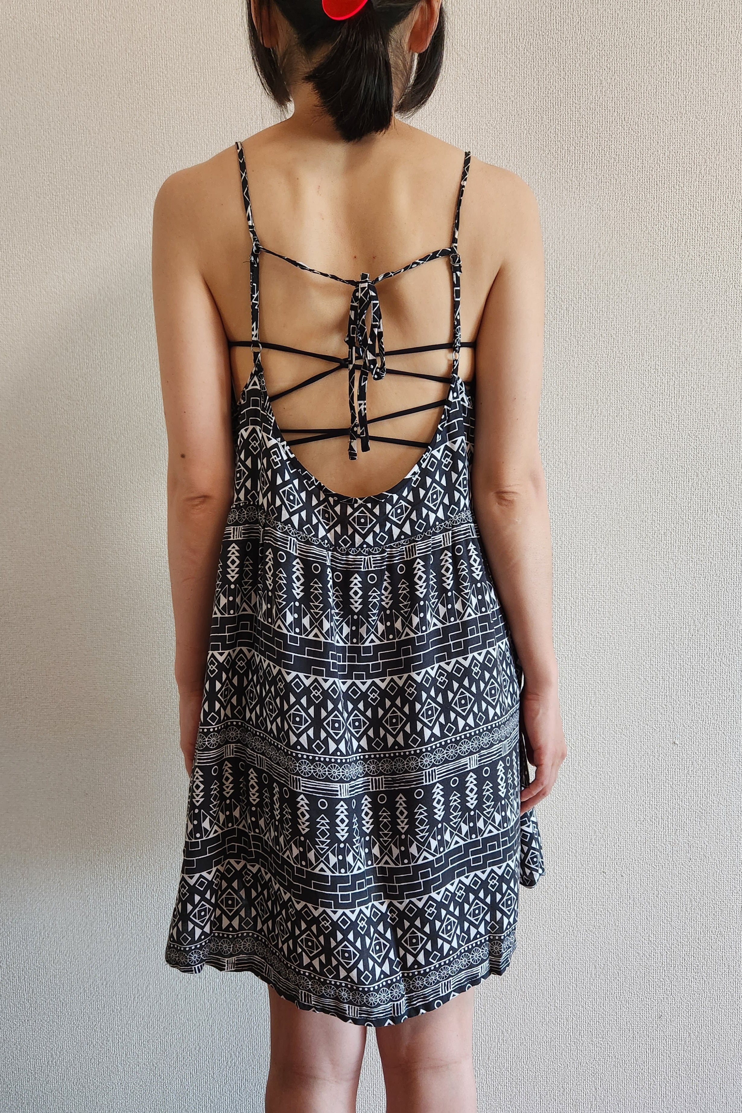 首後ろでリボンを結ぶタイプのキャミソールワンピースです。肩紐の長さを少し調節できます。