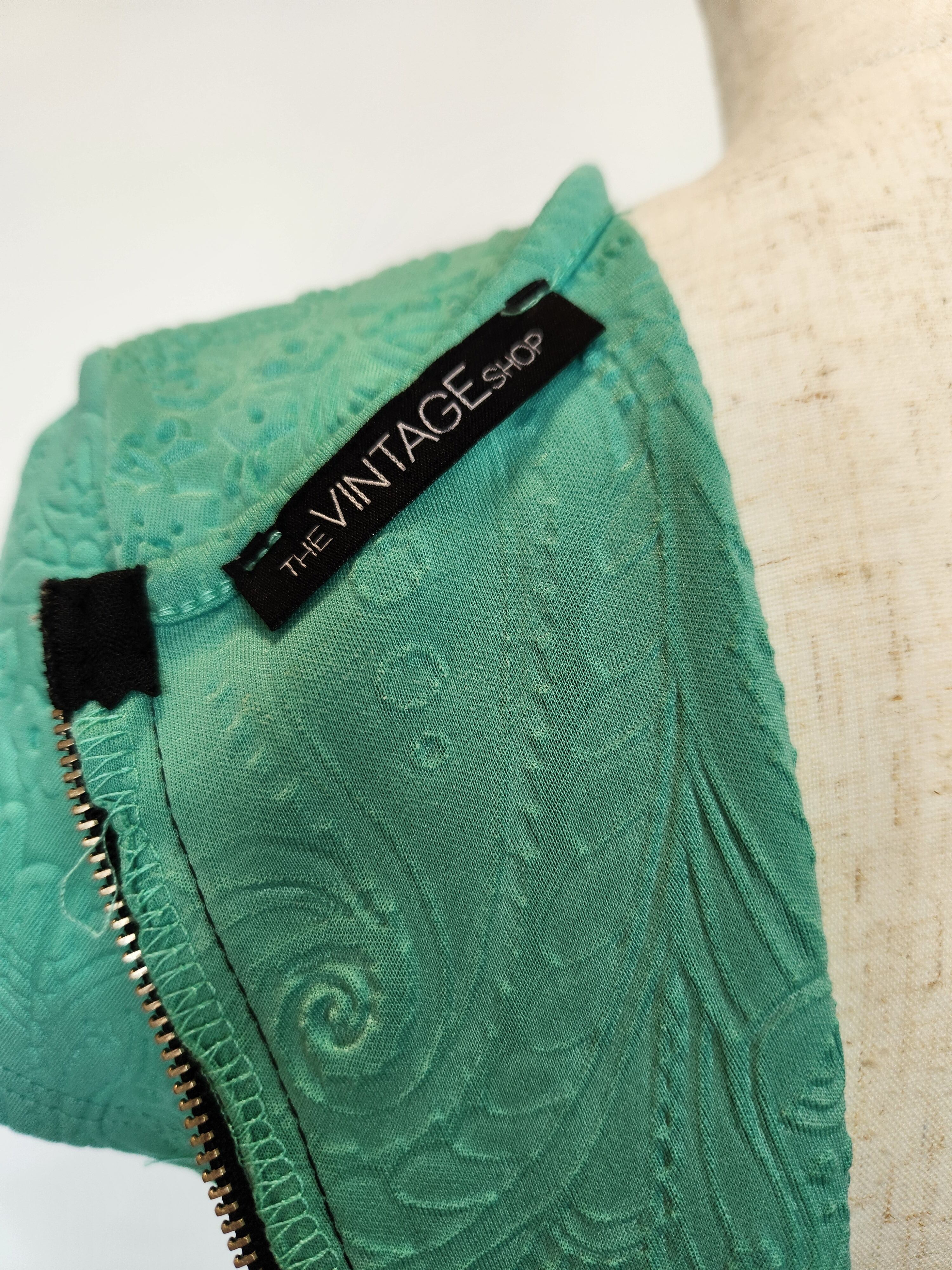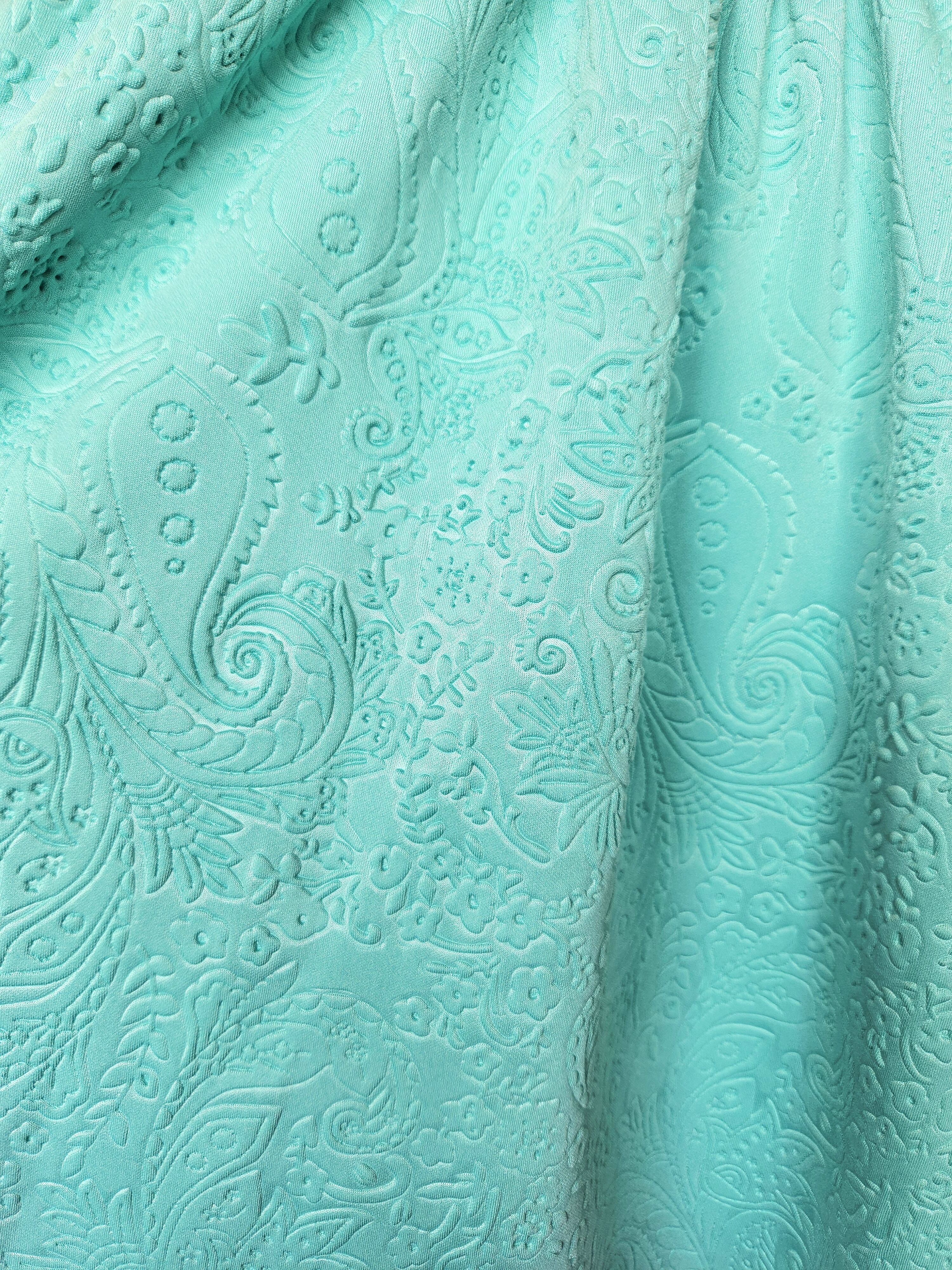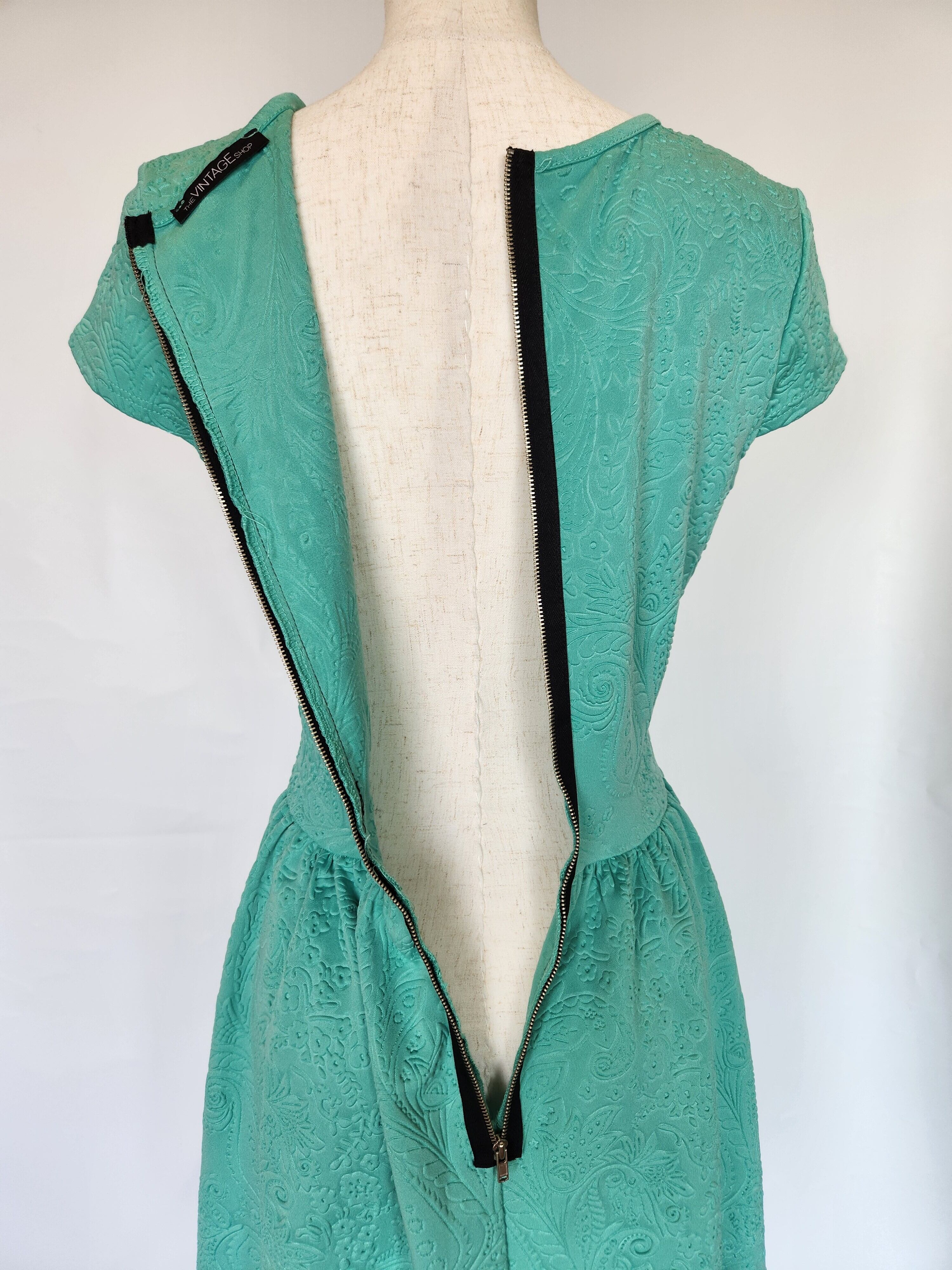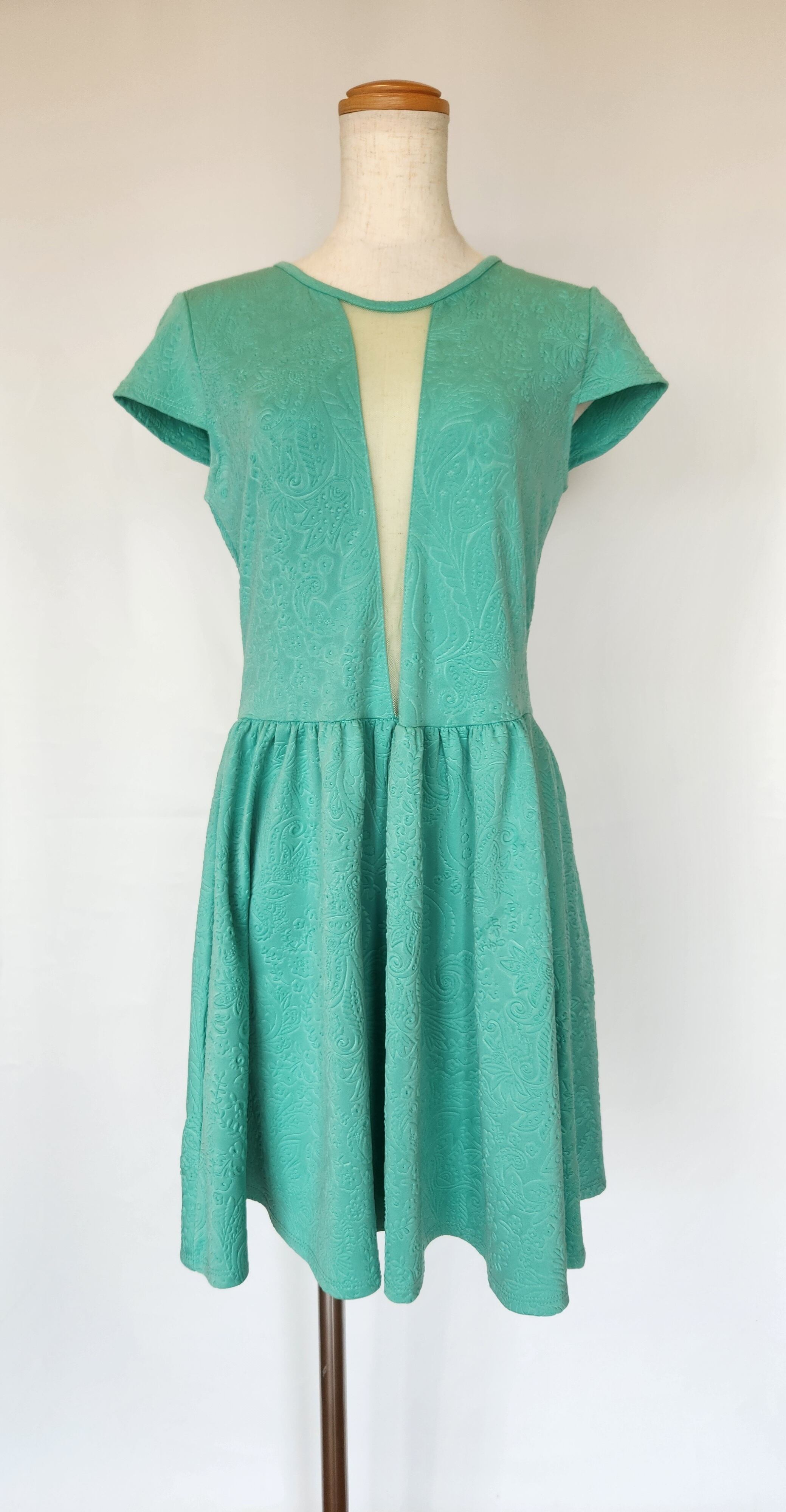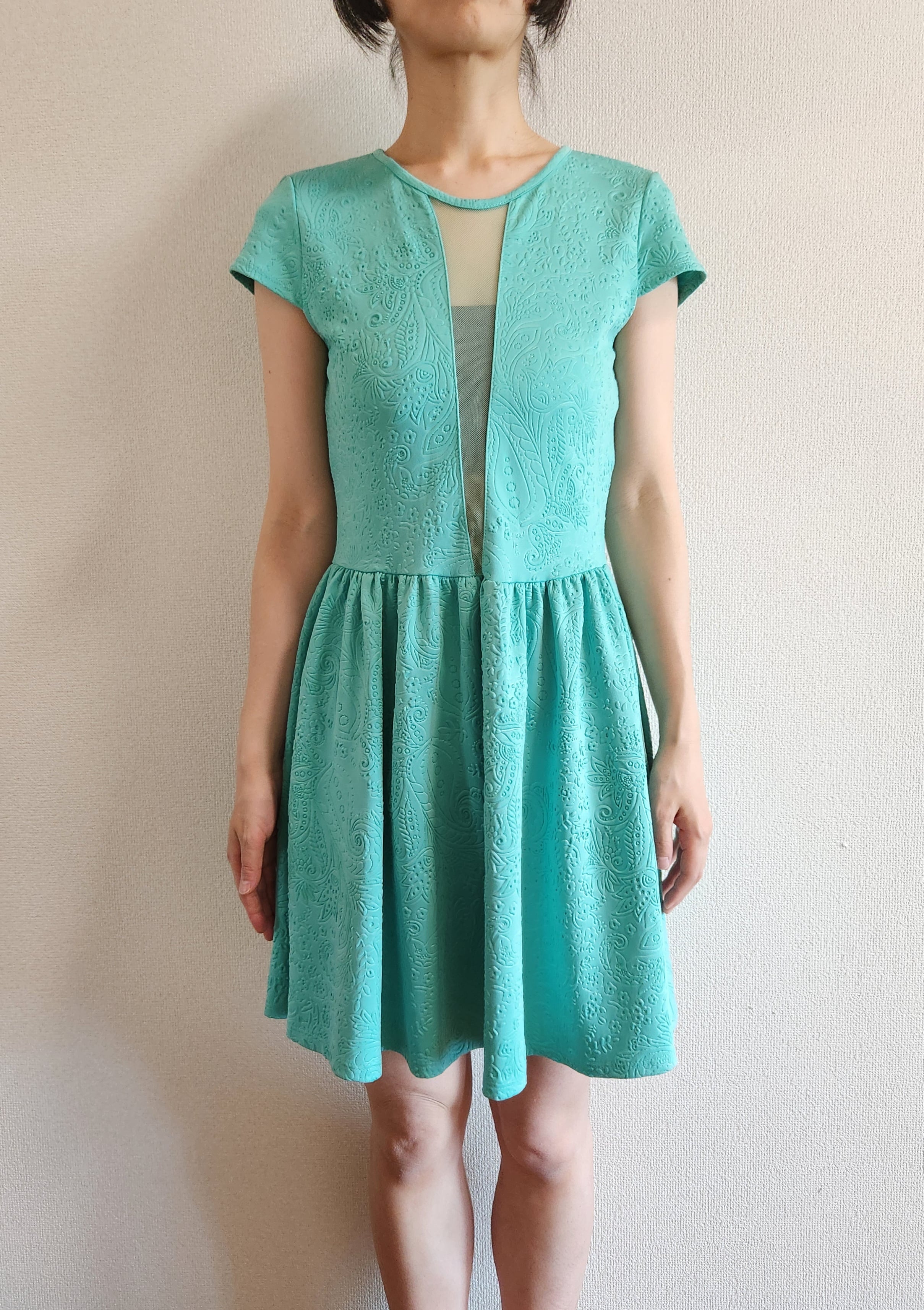 植物のデザインが凹凸感がある生地に描かれています。胸元あたりは網の生地です。透けます。背中中央にチャックがあります。ウエストはゴムが入っていて伸縮性があります。