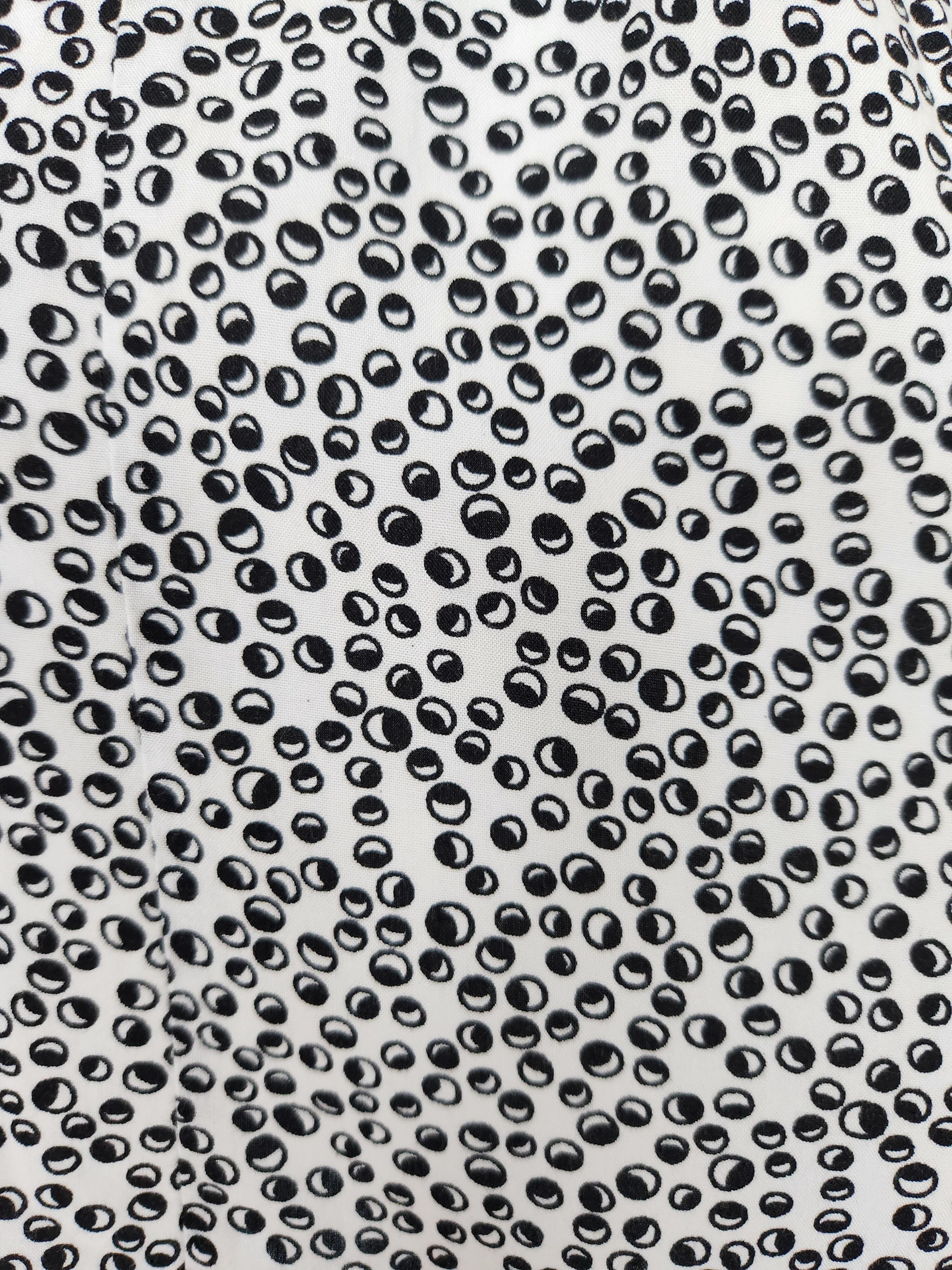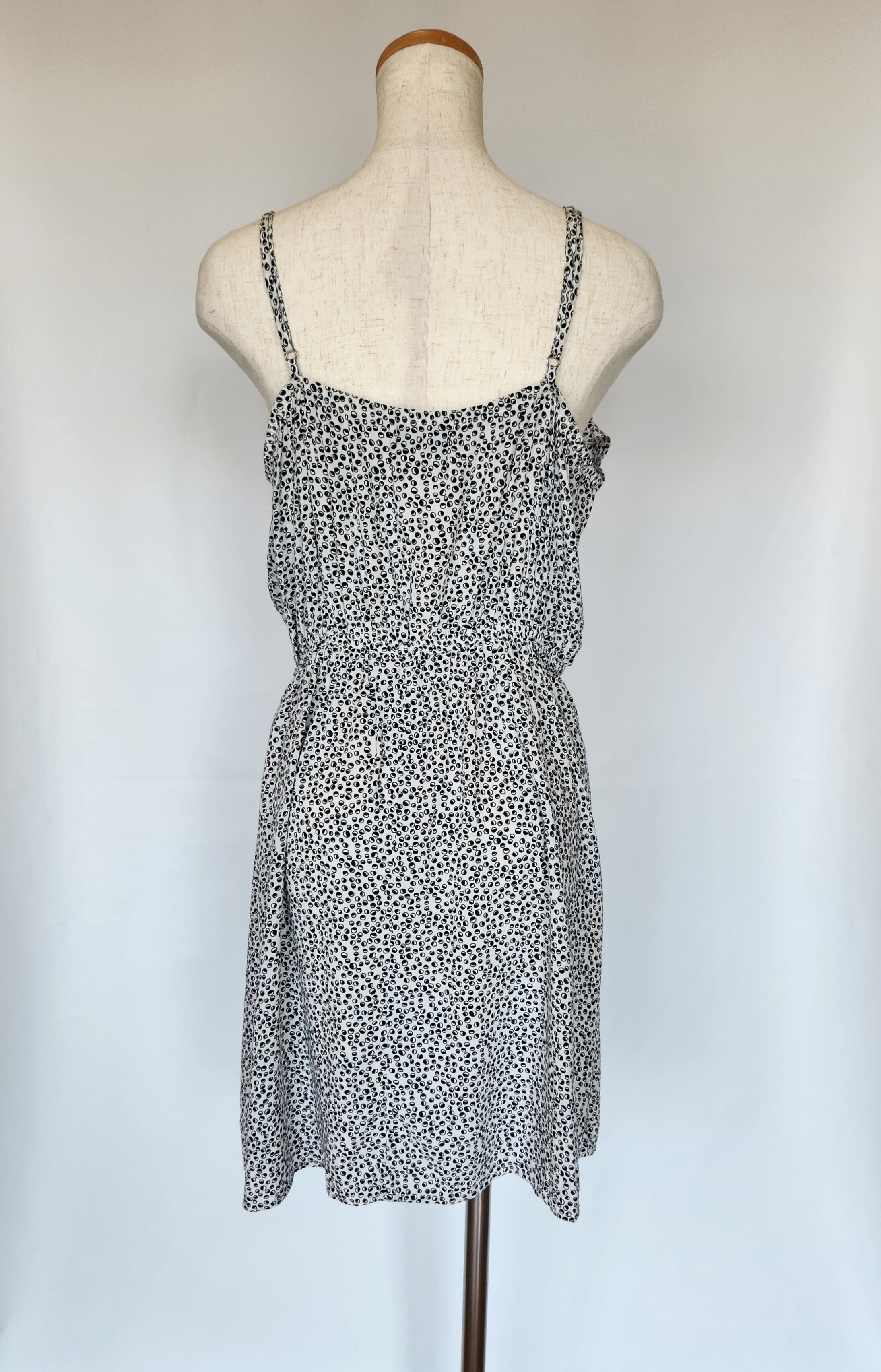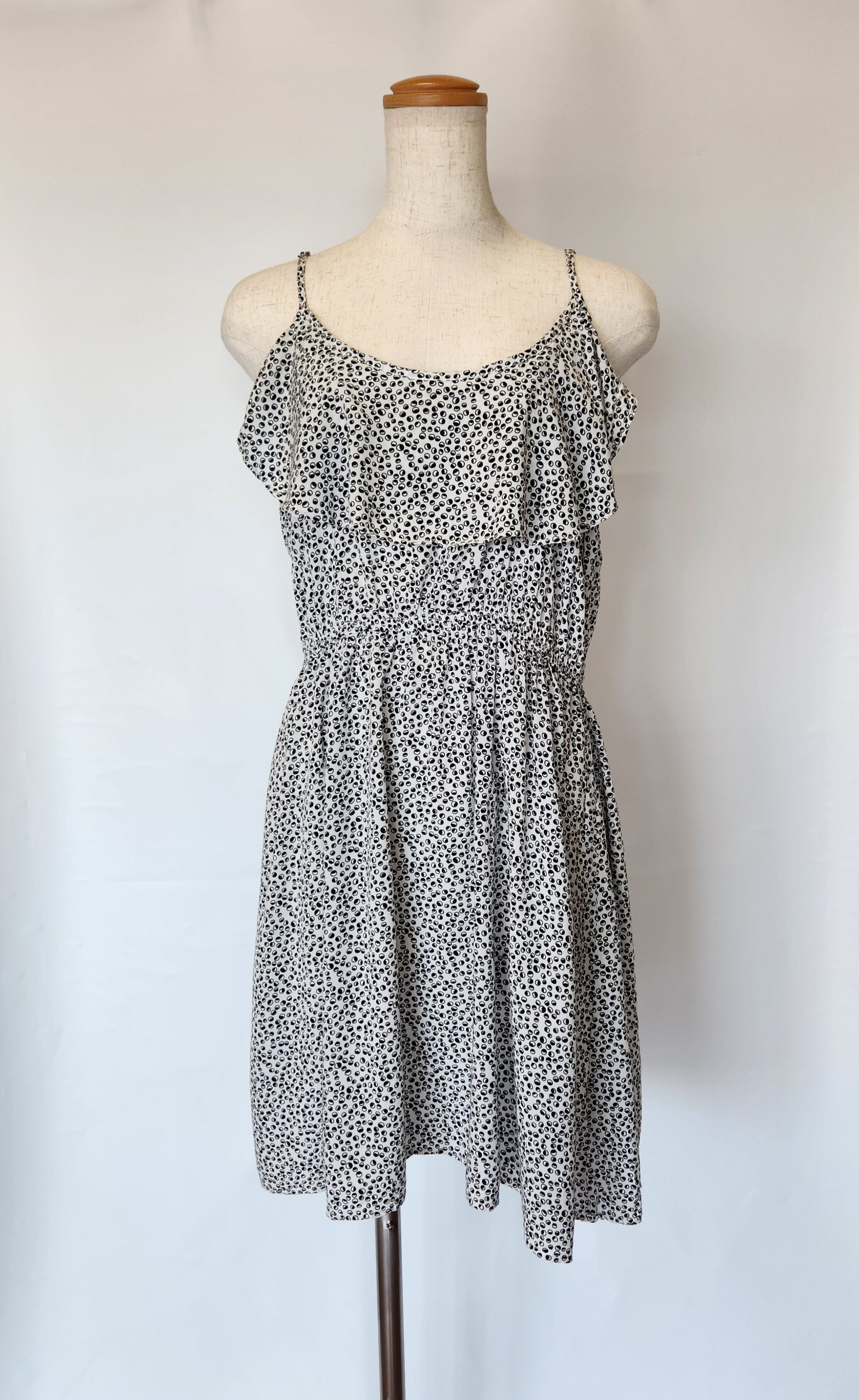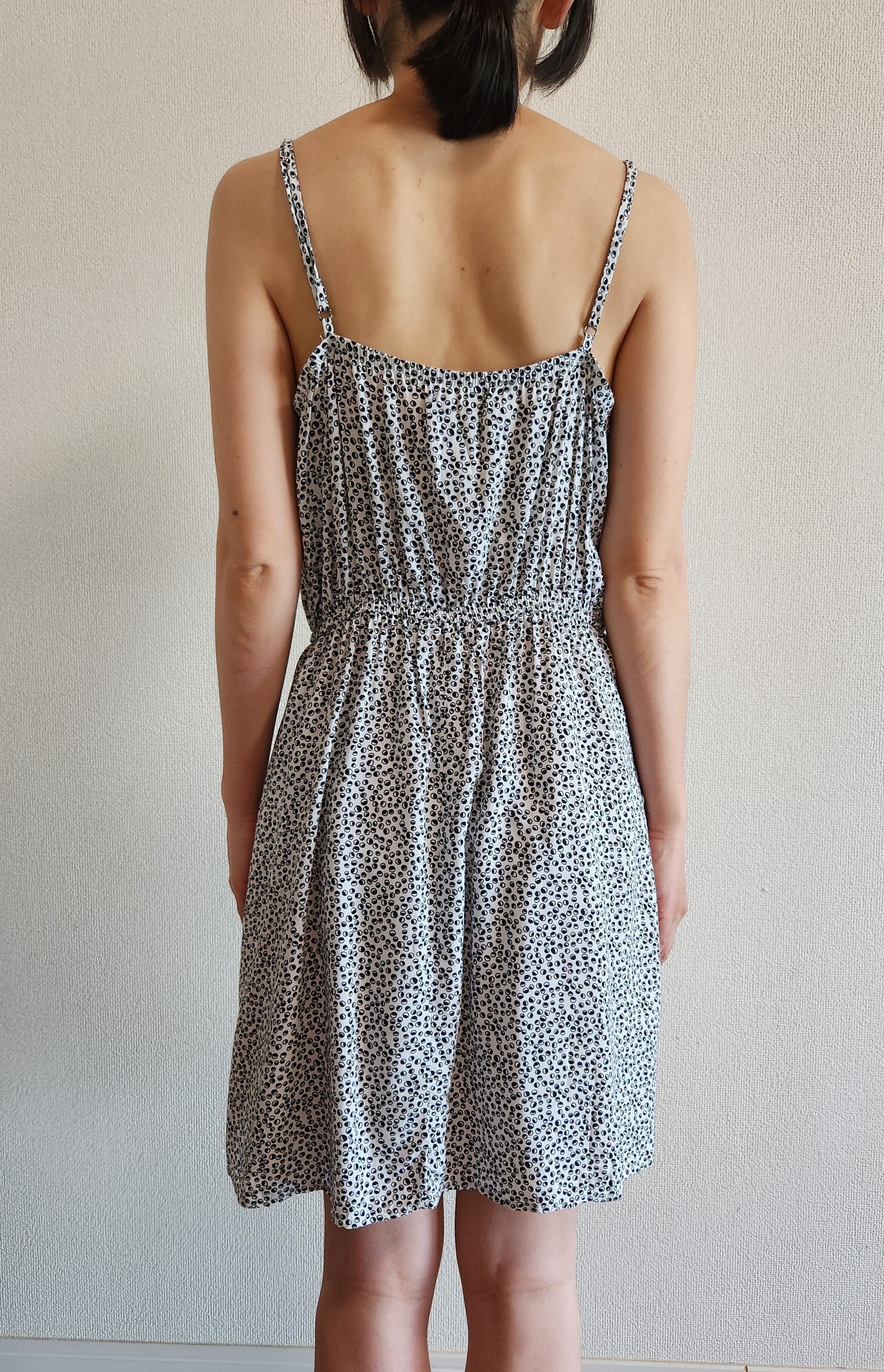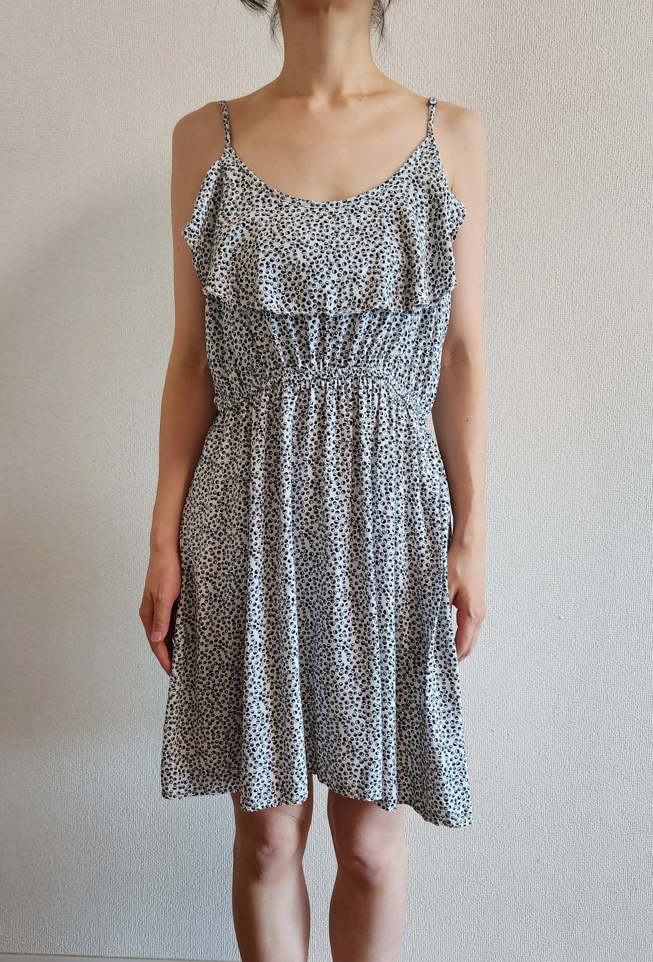 小さな白と黒の丸模様と胸元のフリルがかわいいワンピース。肩紐は長さ調節ができます。ウエストはゴムで伸縮します。ポケットはありません。
