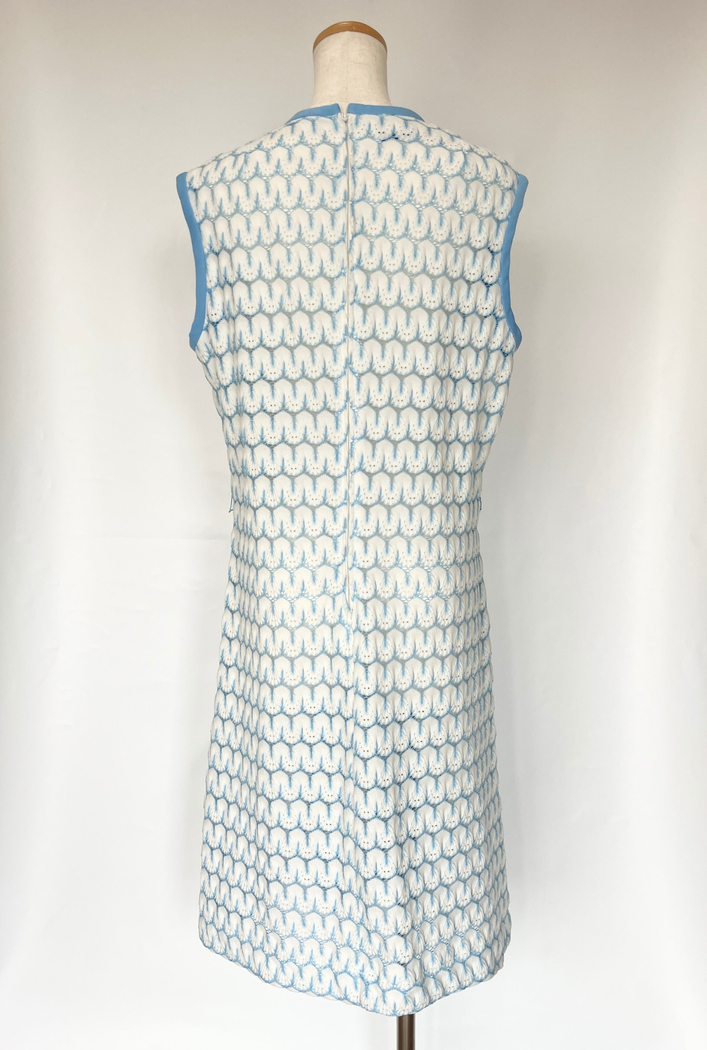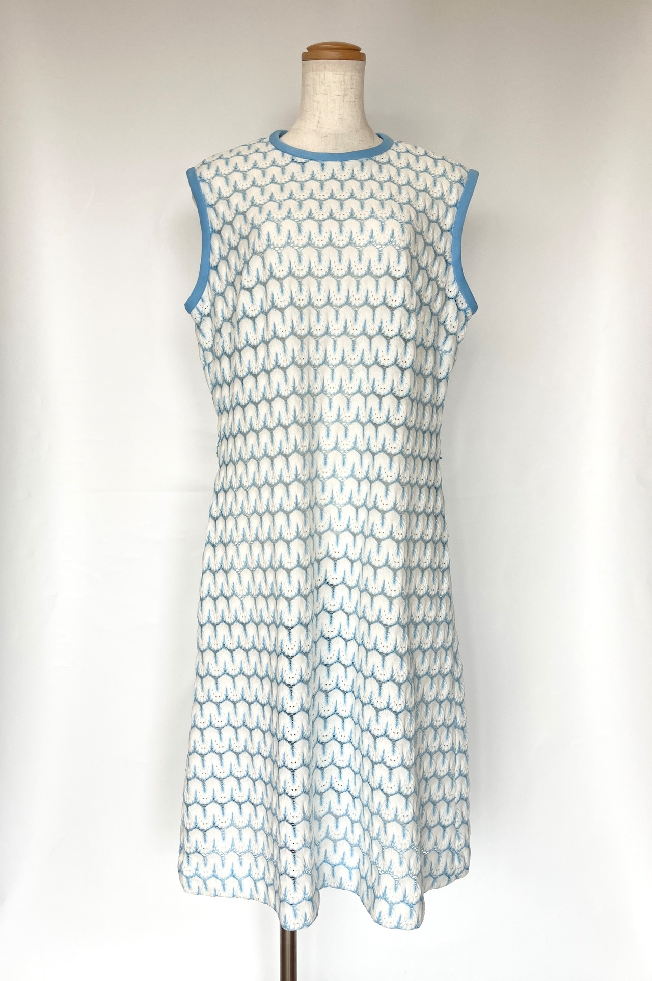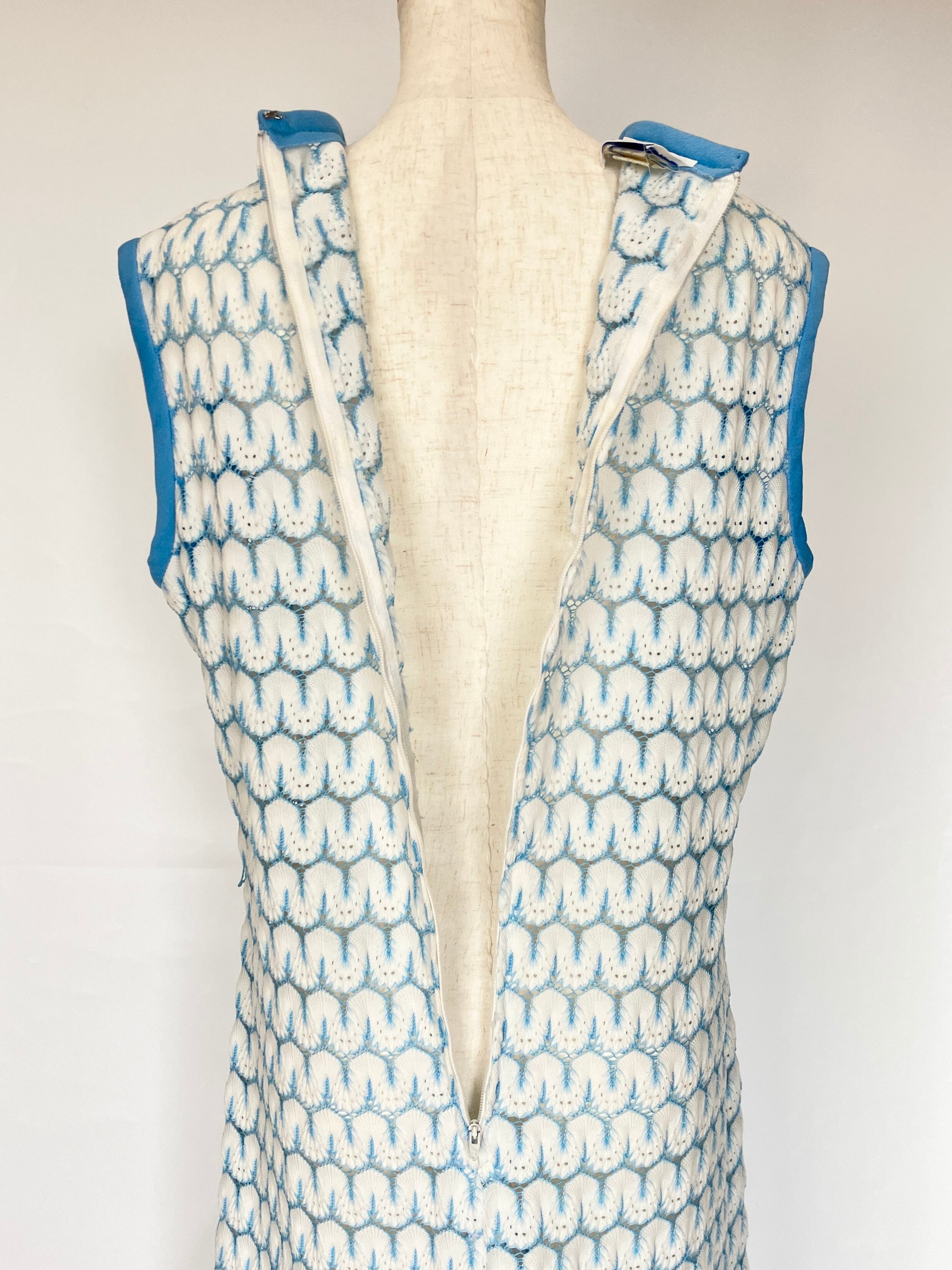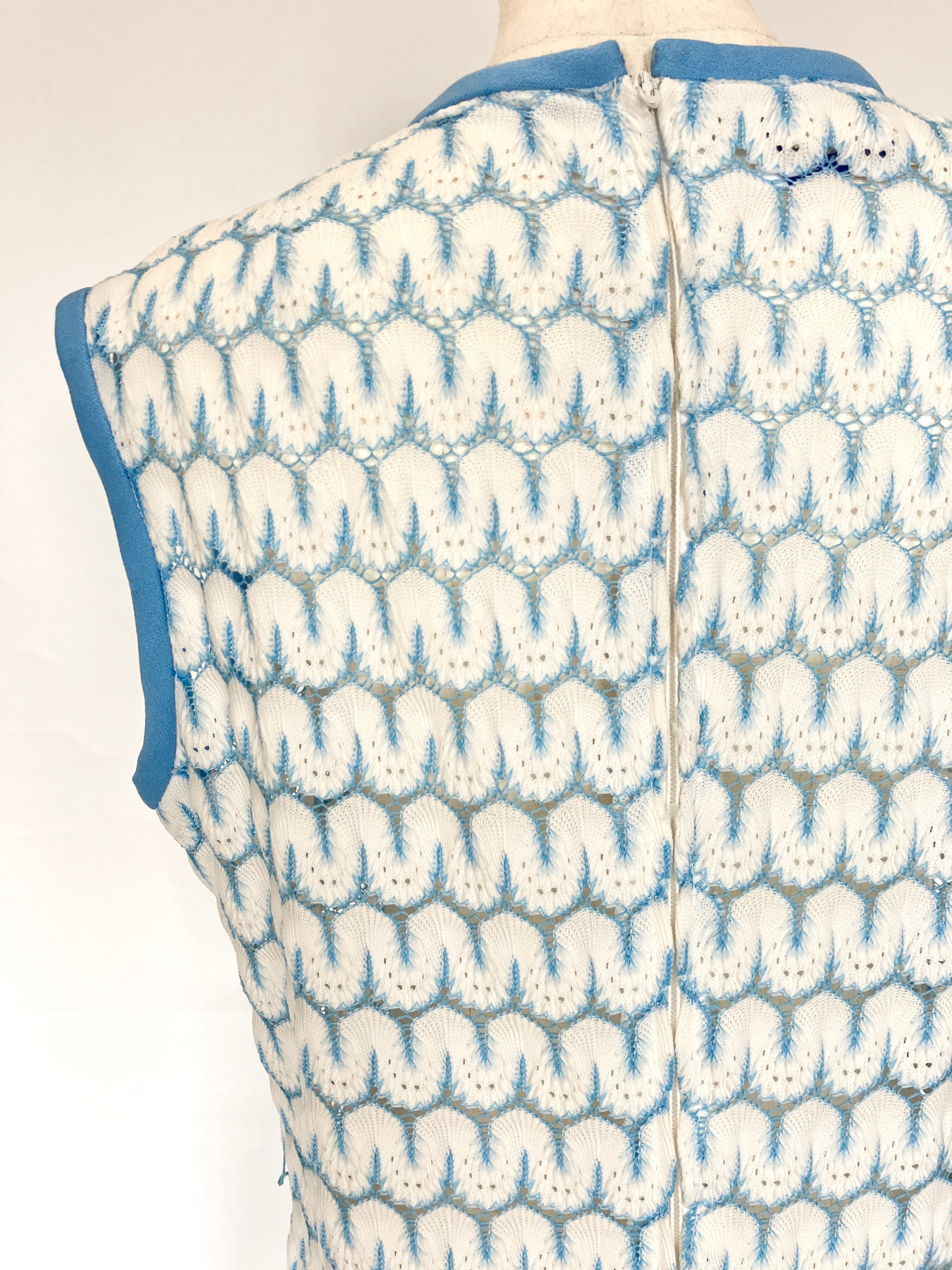 連続した波のような模様の凝った生地のヴィンテージワンピースです。きれいな白と水色です。袖と首元の生地はジャージのような生地で、対比が可愛いです。裏地はついていませんので、生地の模様の部分から透けます。後ろ中央にチャックがついています。