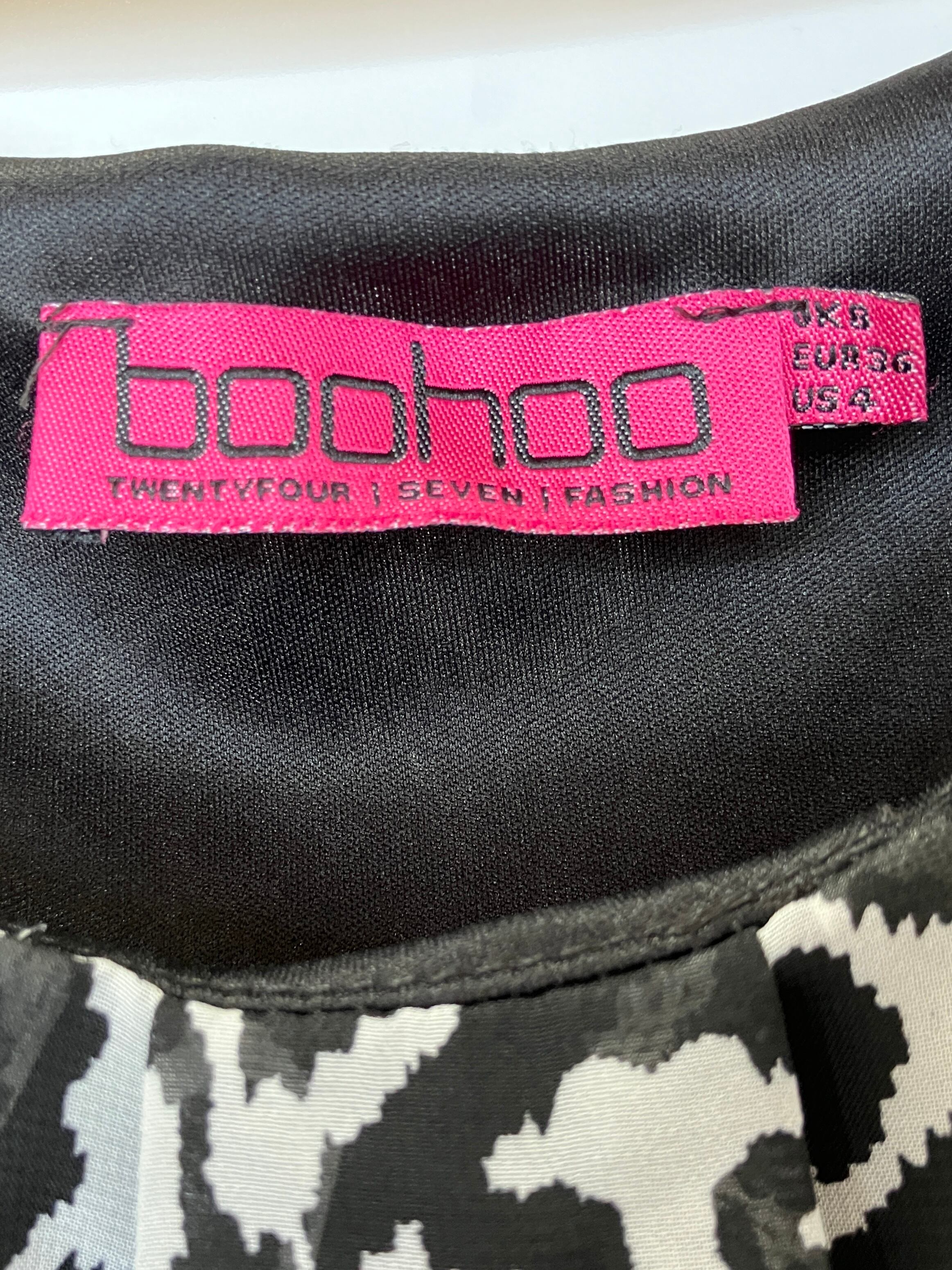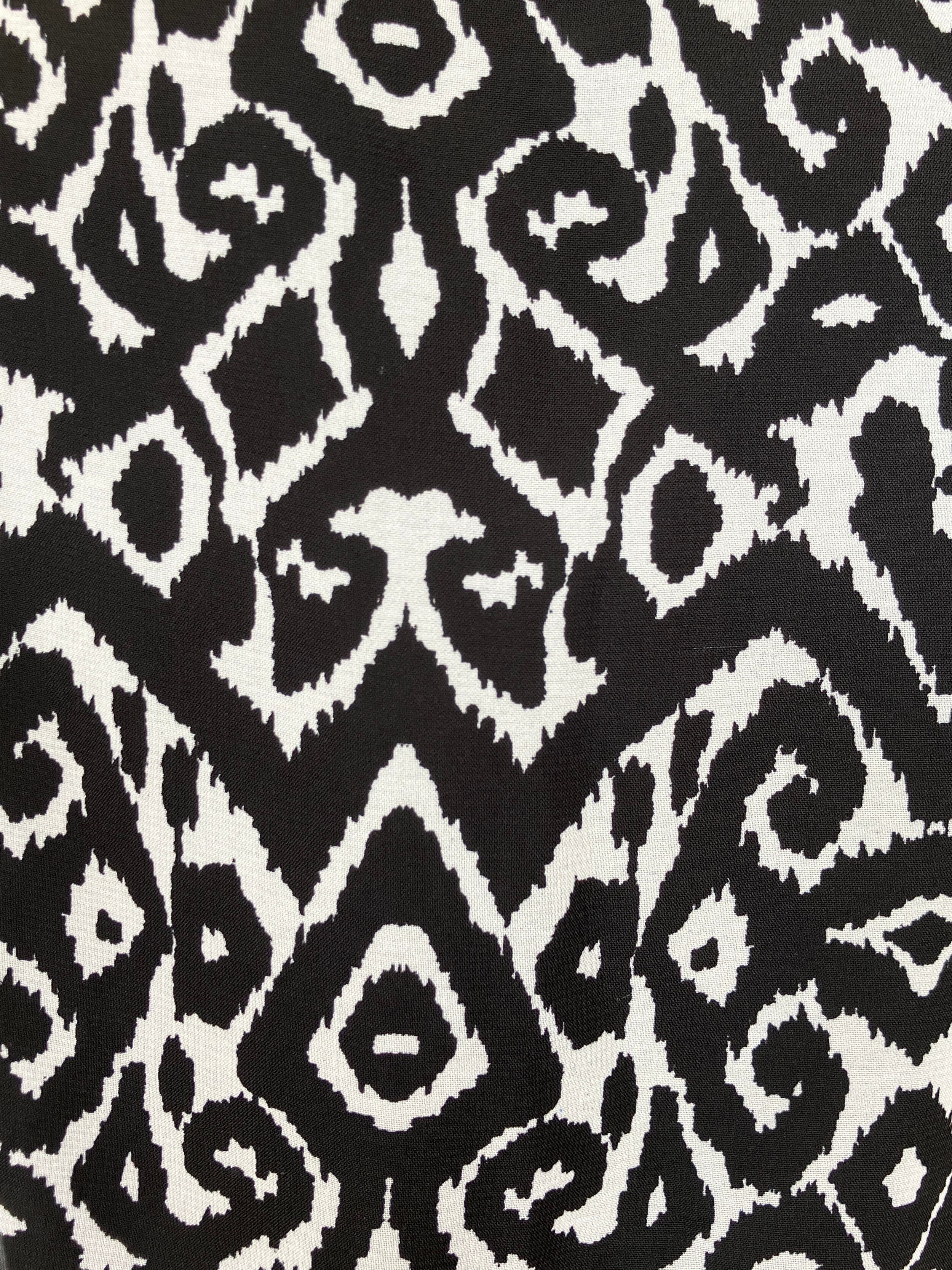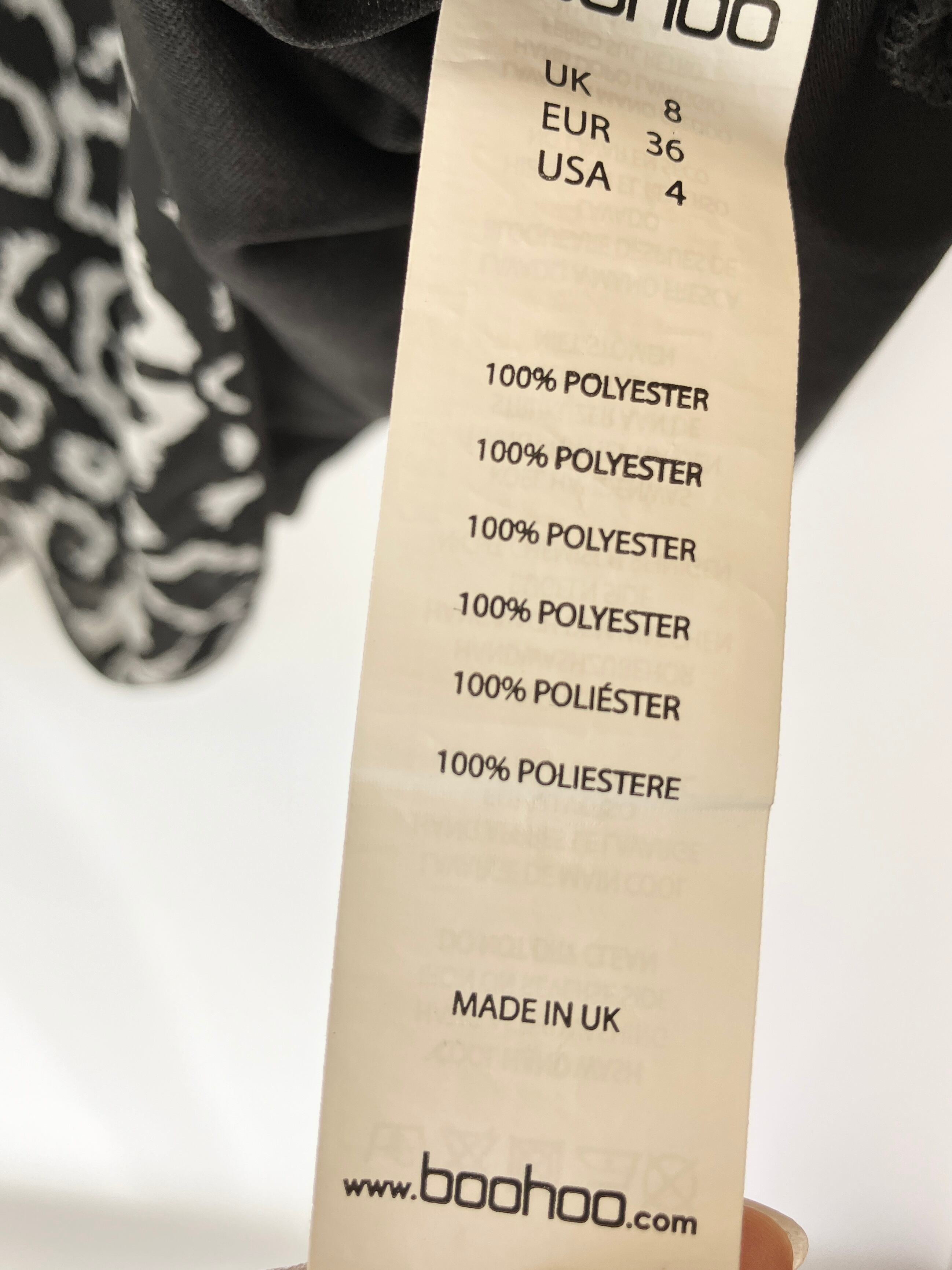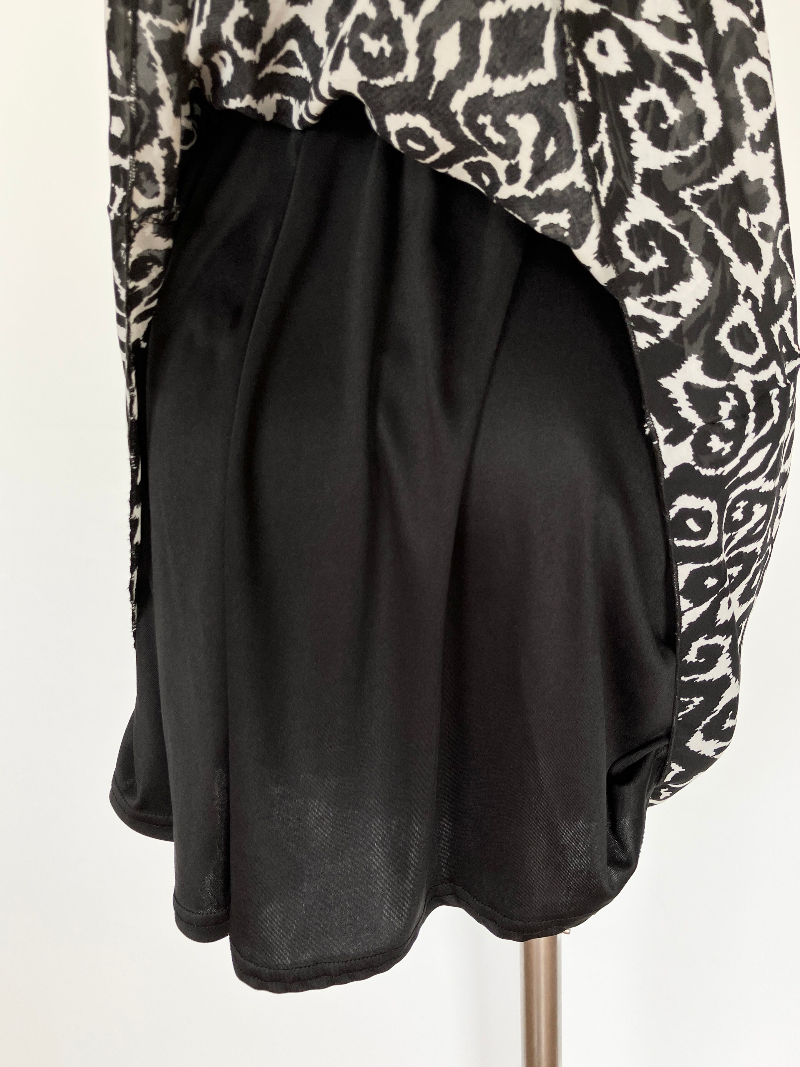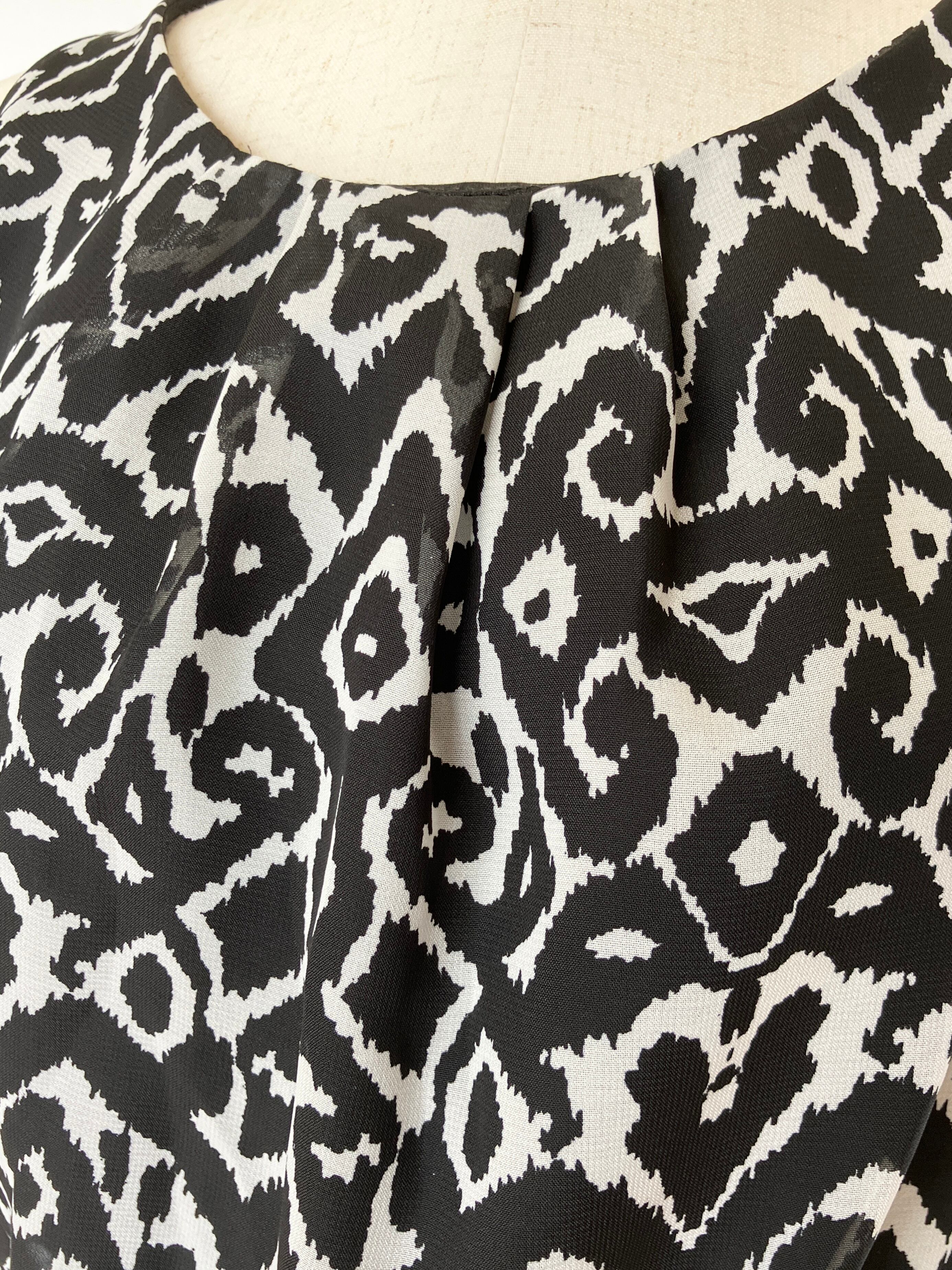表地は透け感のあるゼブラ柄のようなデザインの生地で、涼しく見え、夏にぴったりのワンピースです。裏地がついているので、透けません。ウエストはゴムで伸縮性があります。首元とスカートに少しタックが入っています。ポケットはありません。