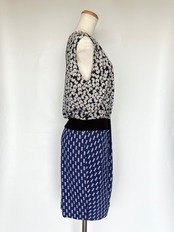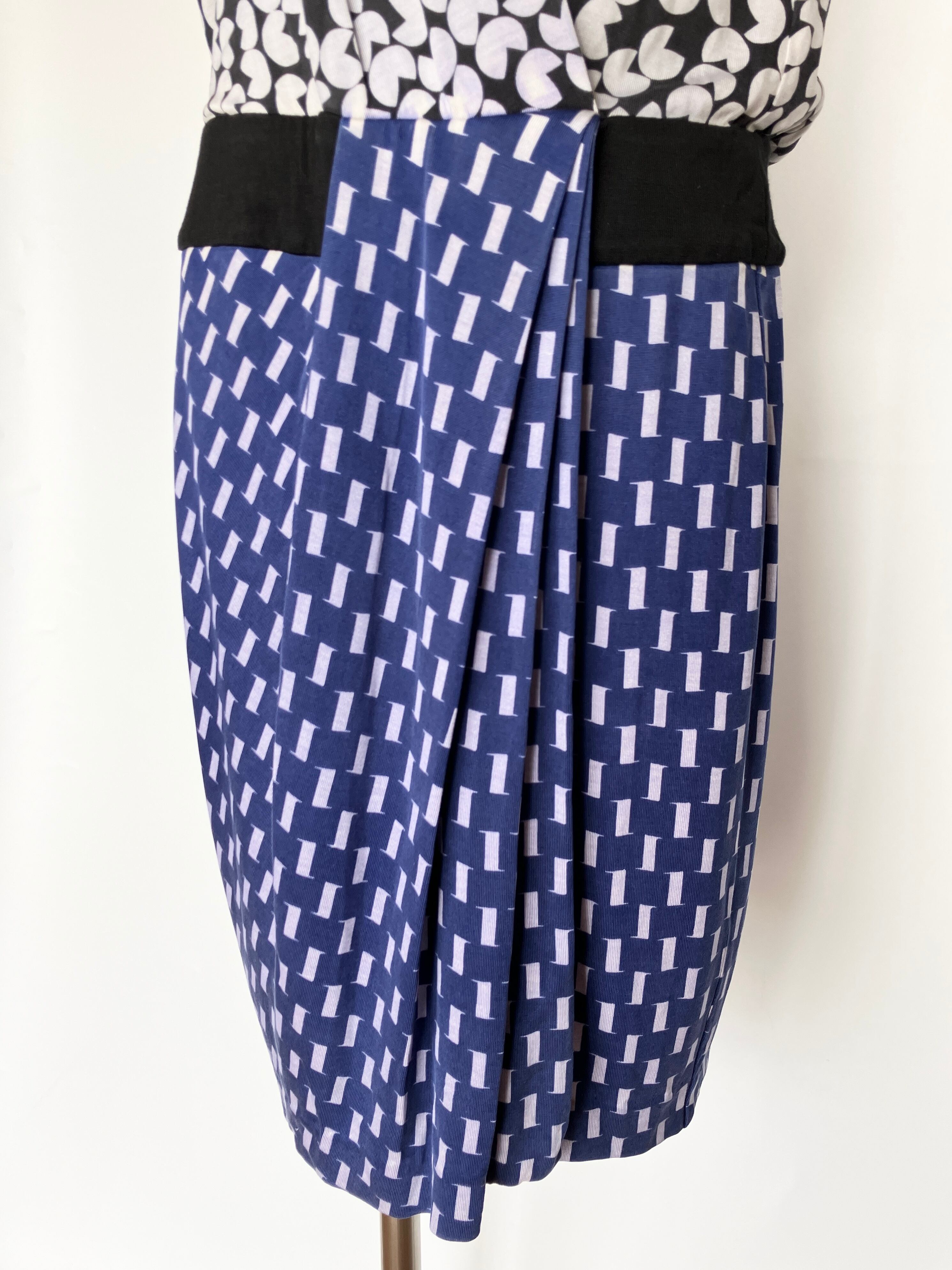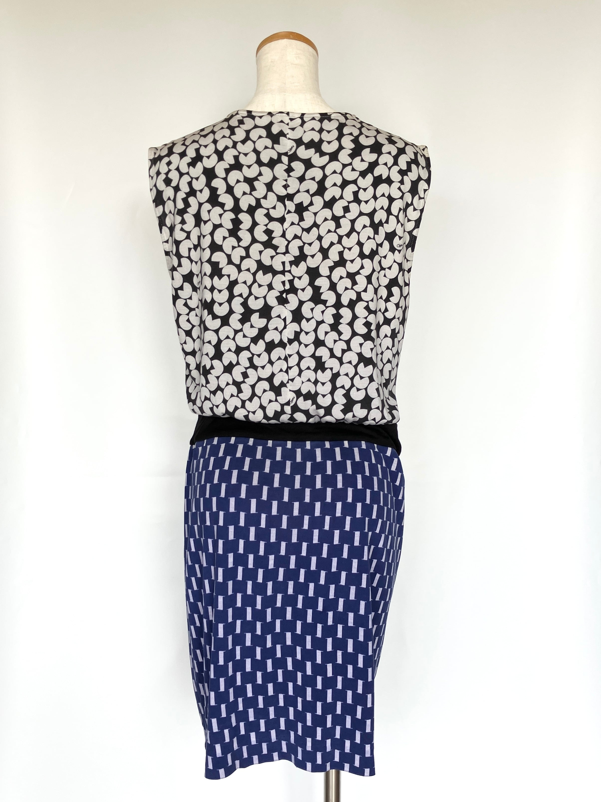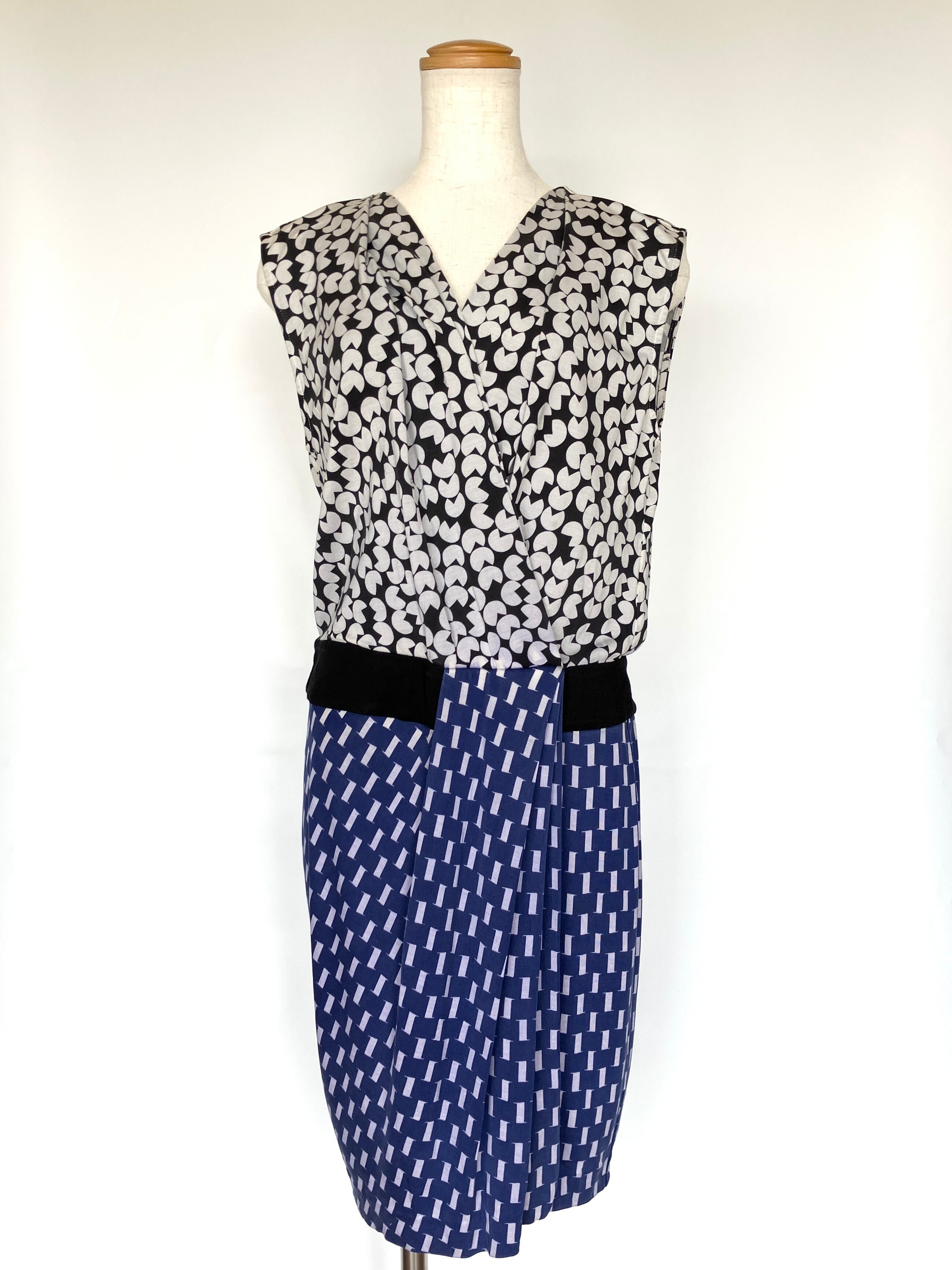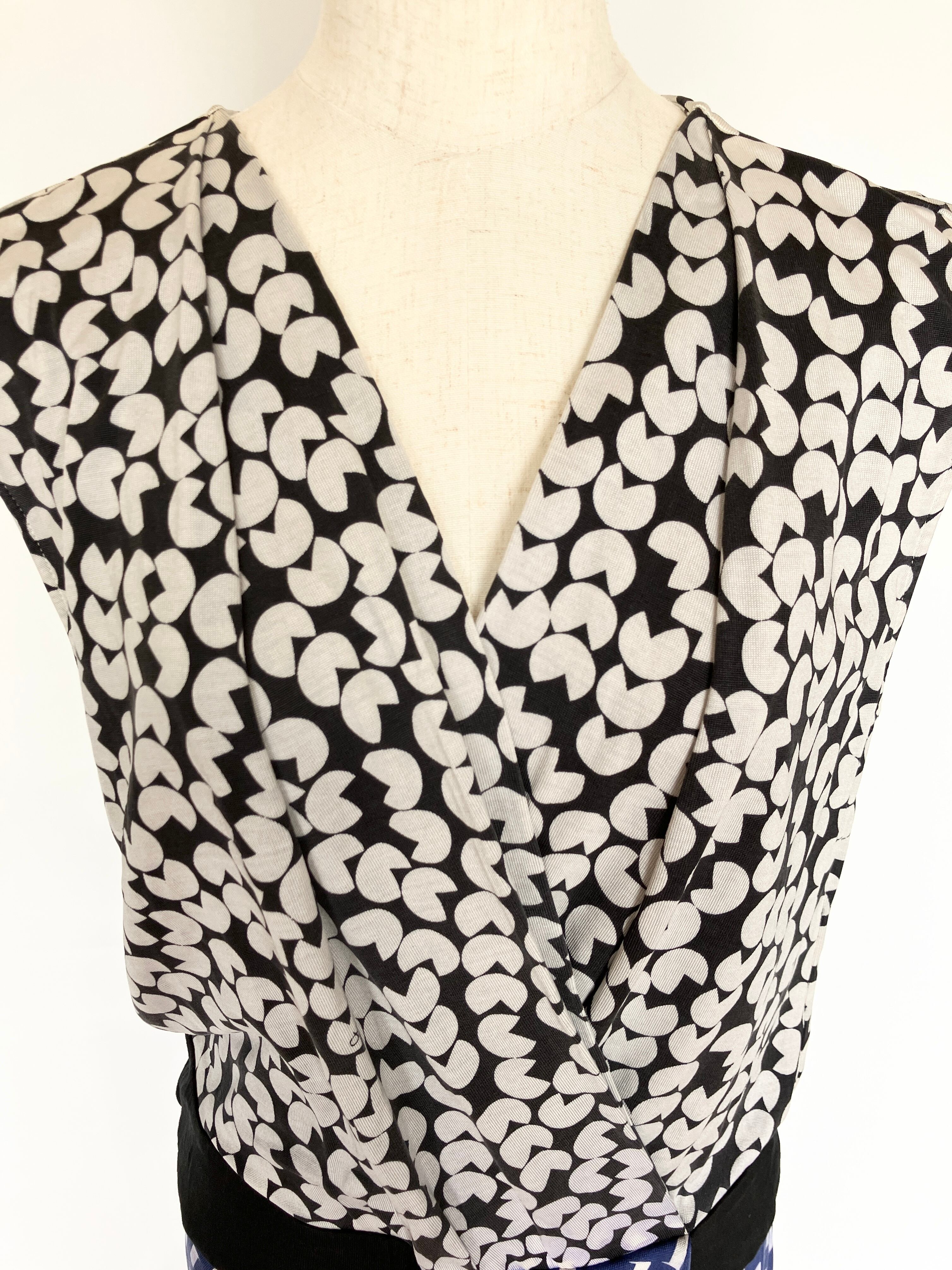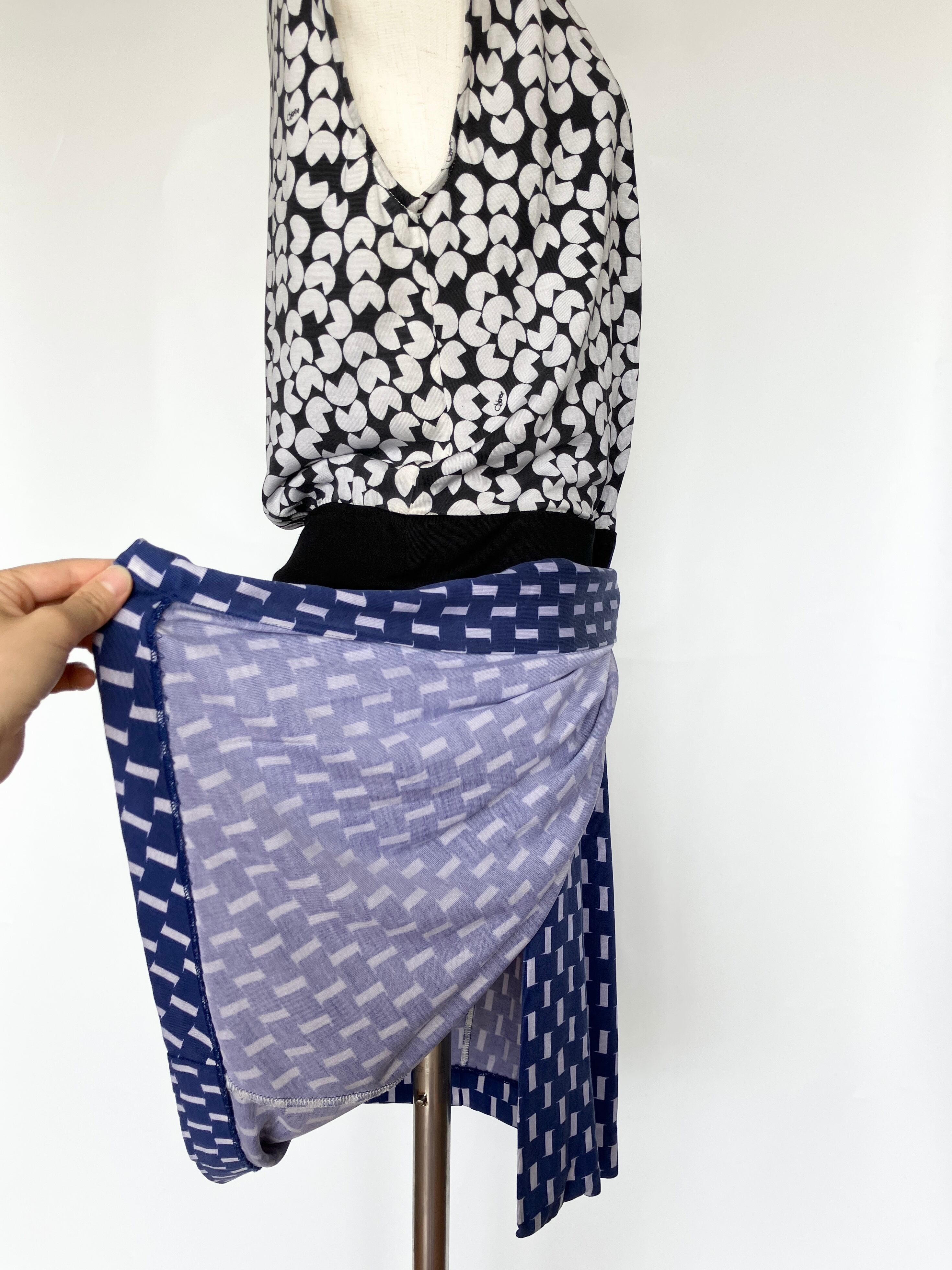 首元から胸元にかけて少しタックが入っています。スカート部分はラップドレスになっています。凝ったデザインです。生地はシルクとレーヨンの混合です。透け感はありません。ウエストは伸縮性があります。ポケットはありません。無数のパックマンのようなデザインと1のようなデザインにセンスを感じます。