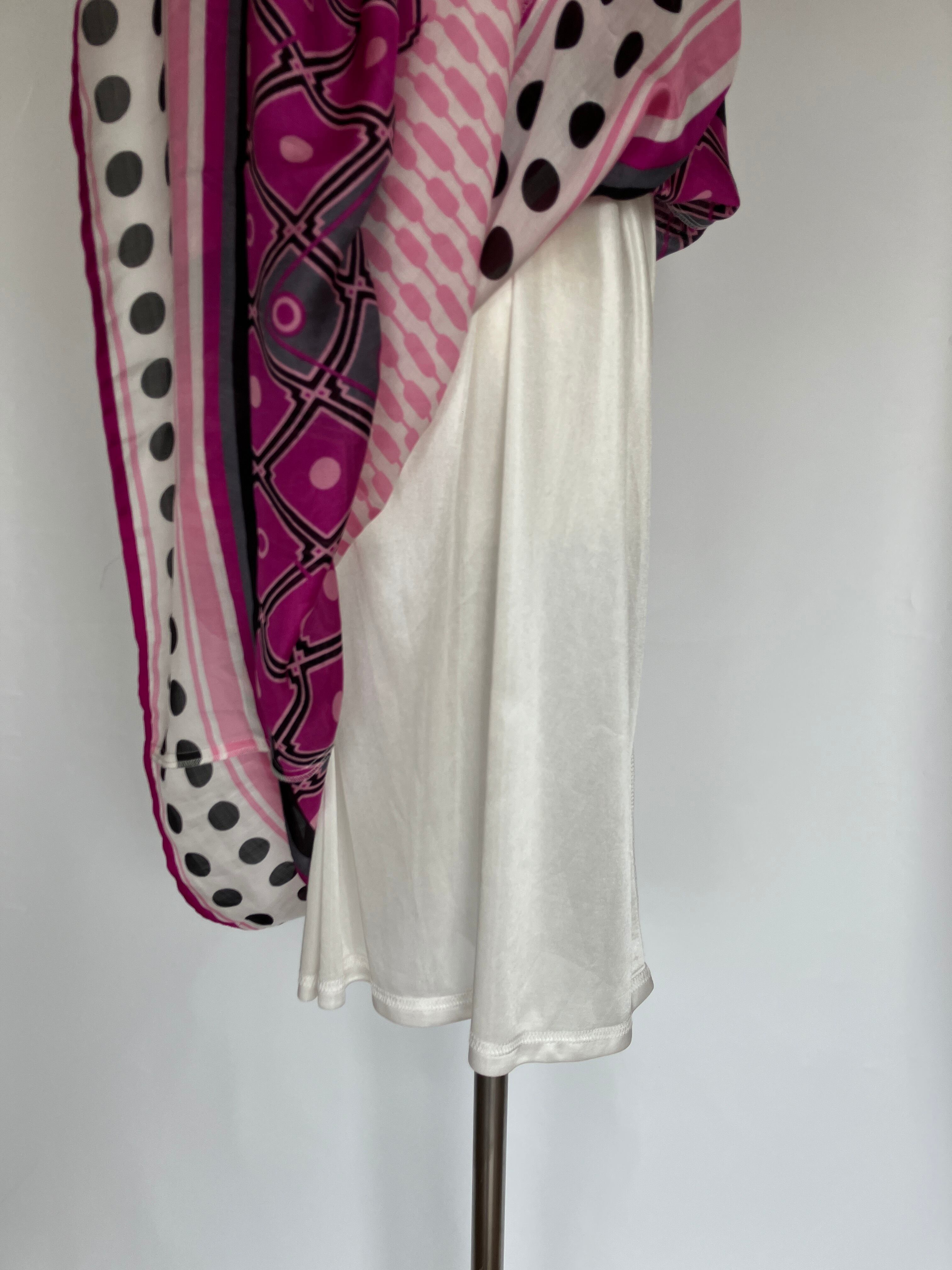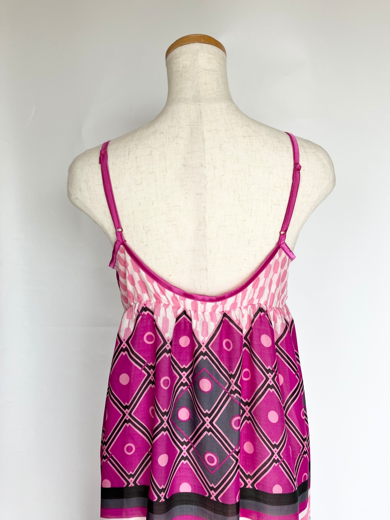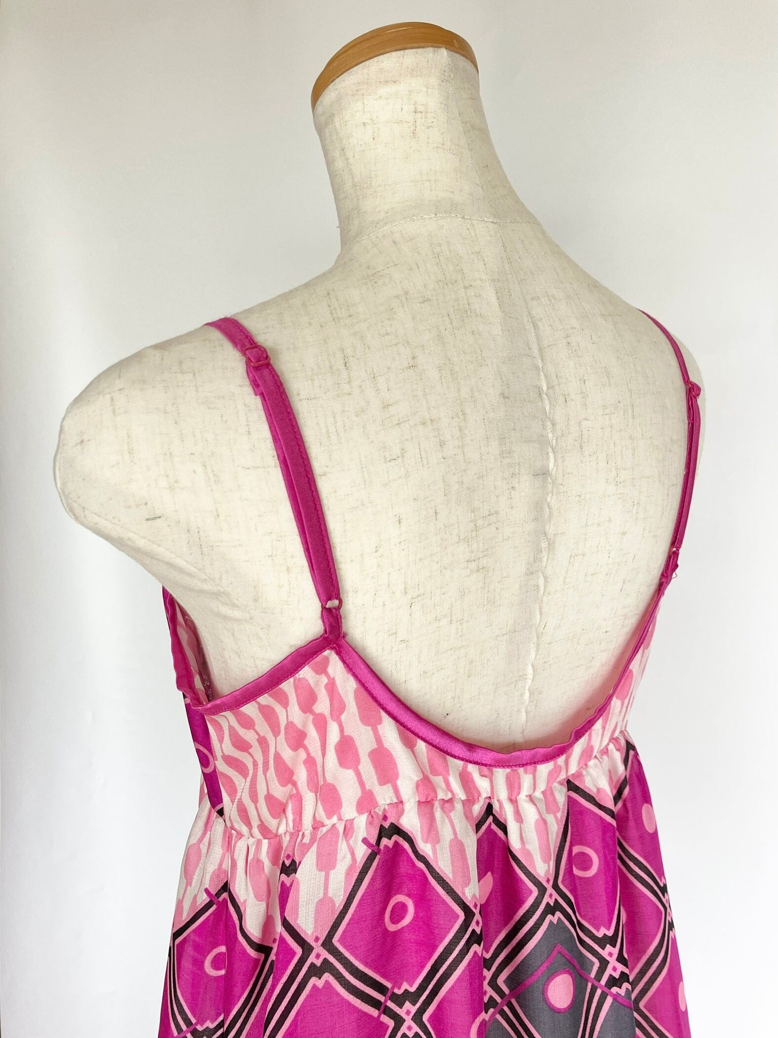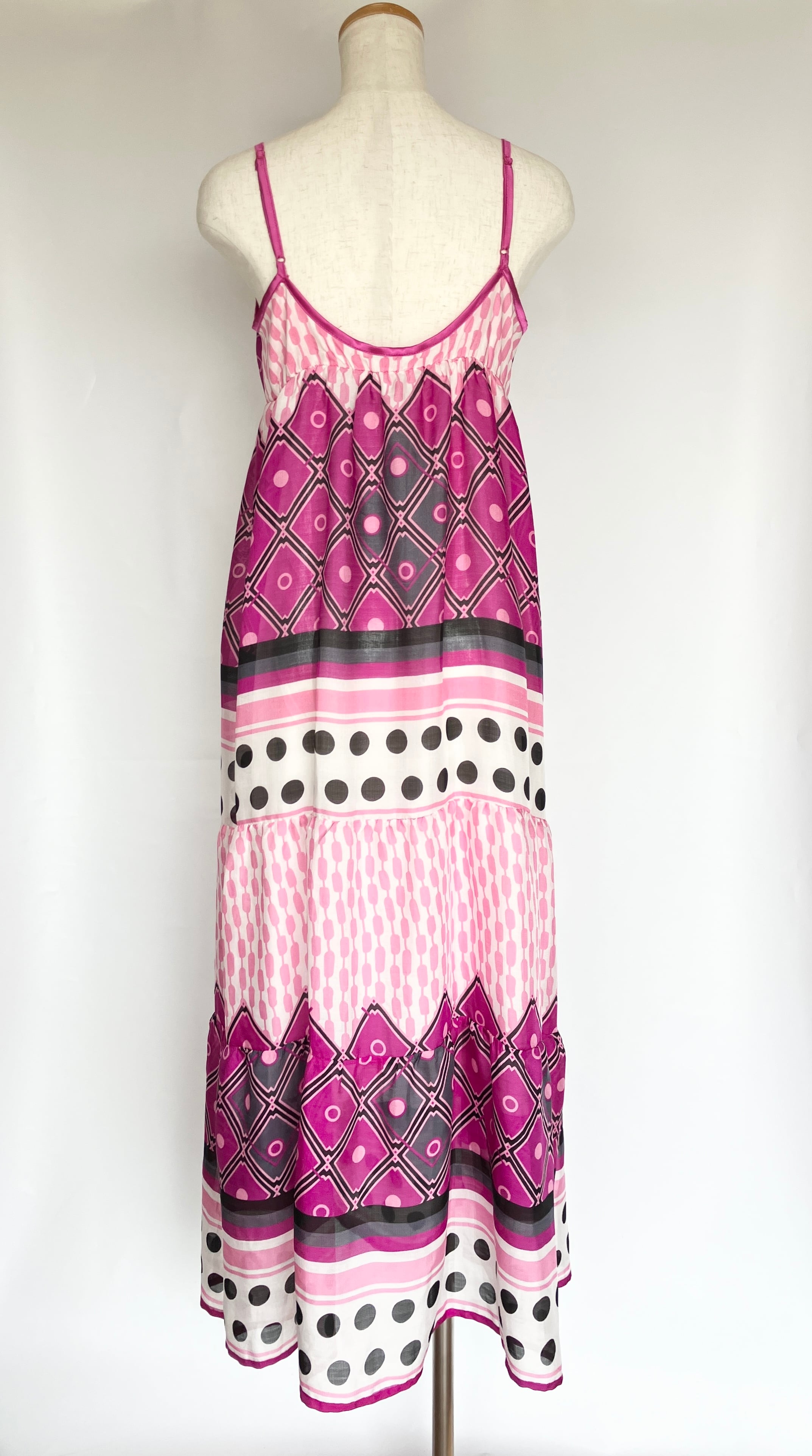 パッと目を引くマキシ丈ワンピースです。胸元のみ小さくフリルがついています。