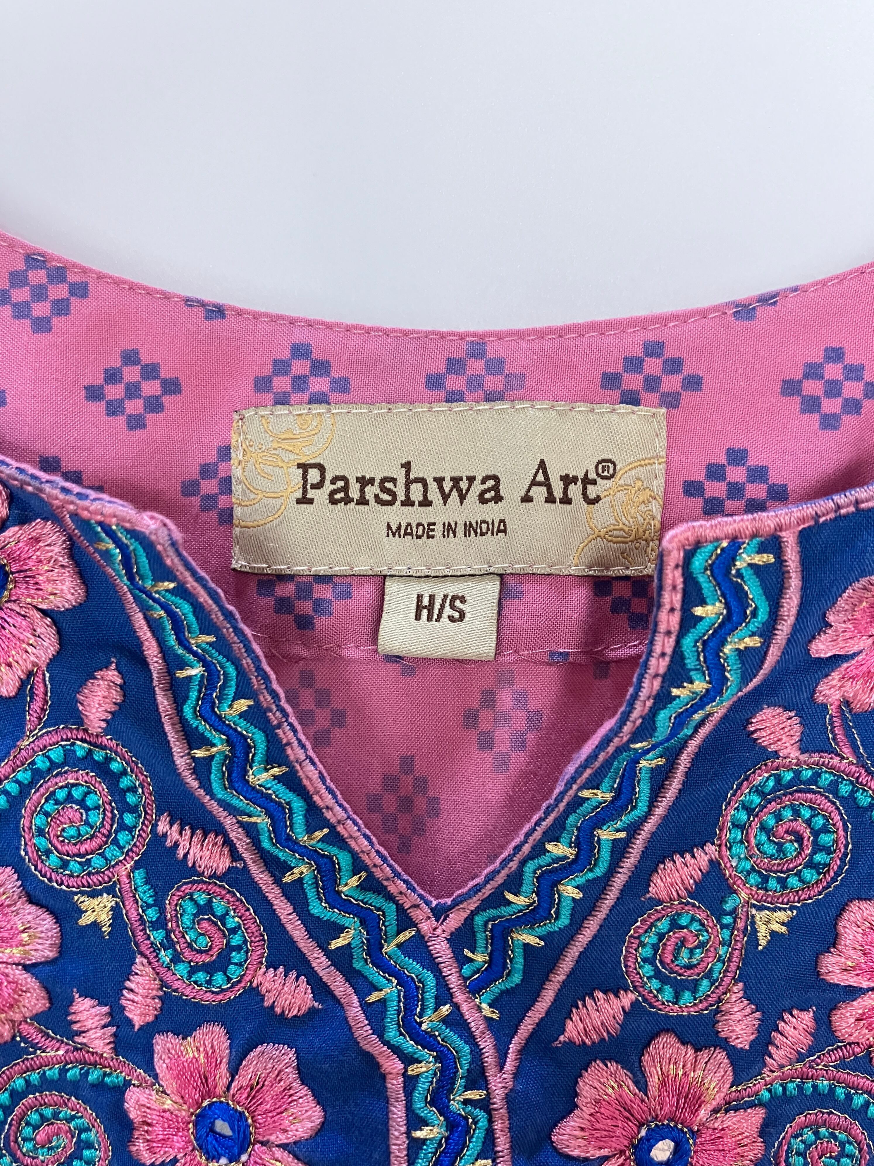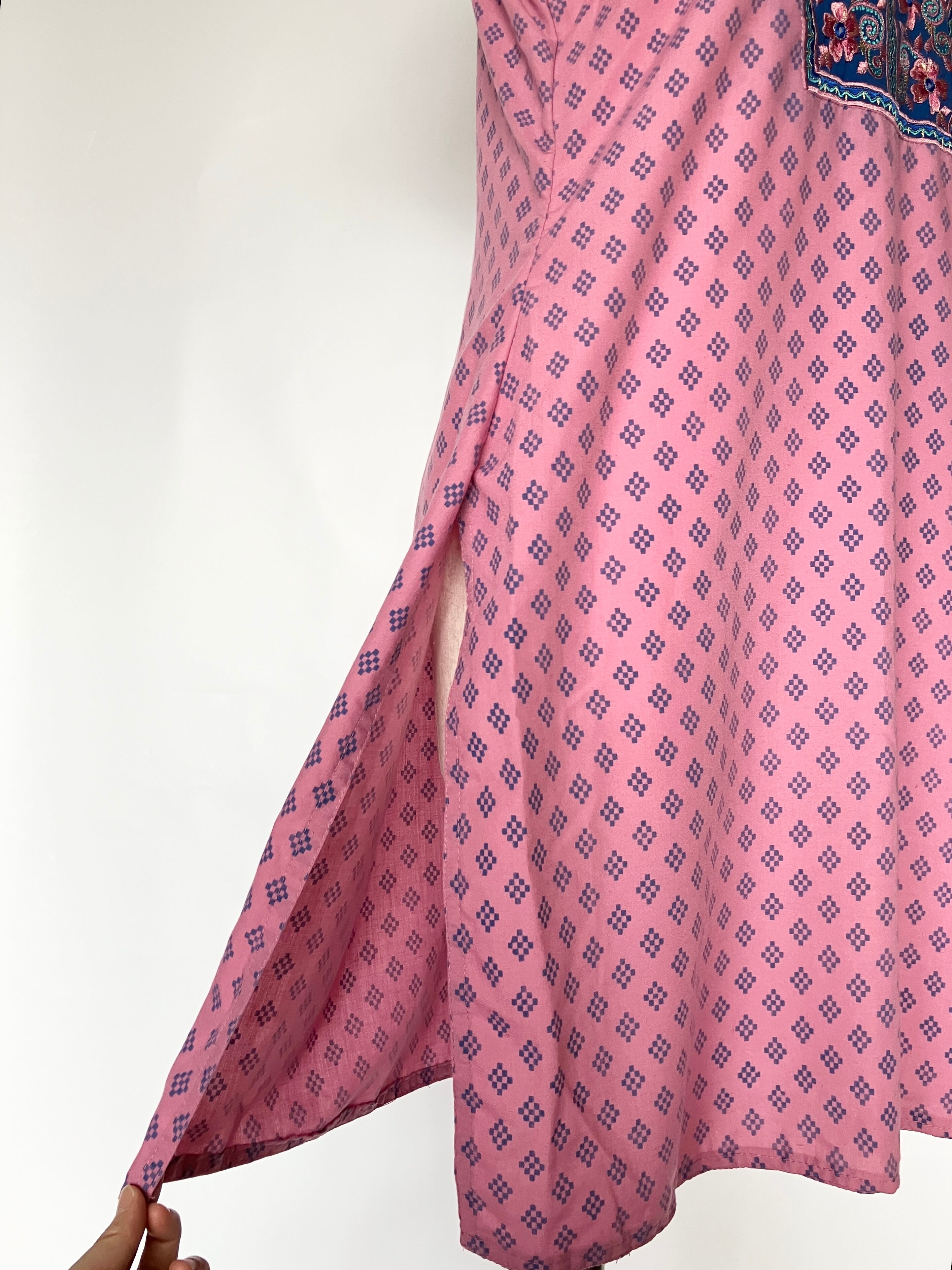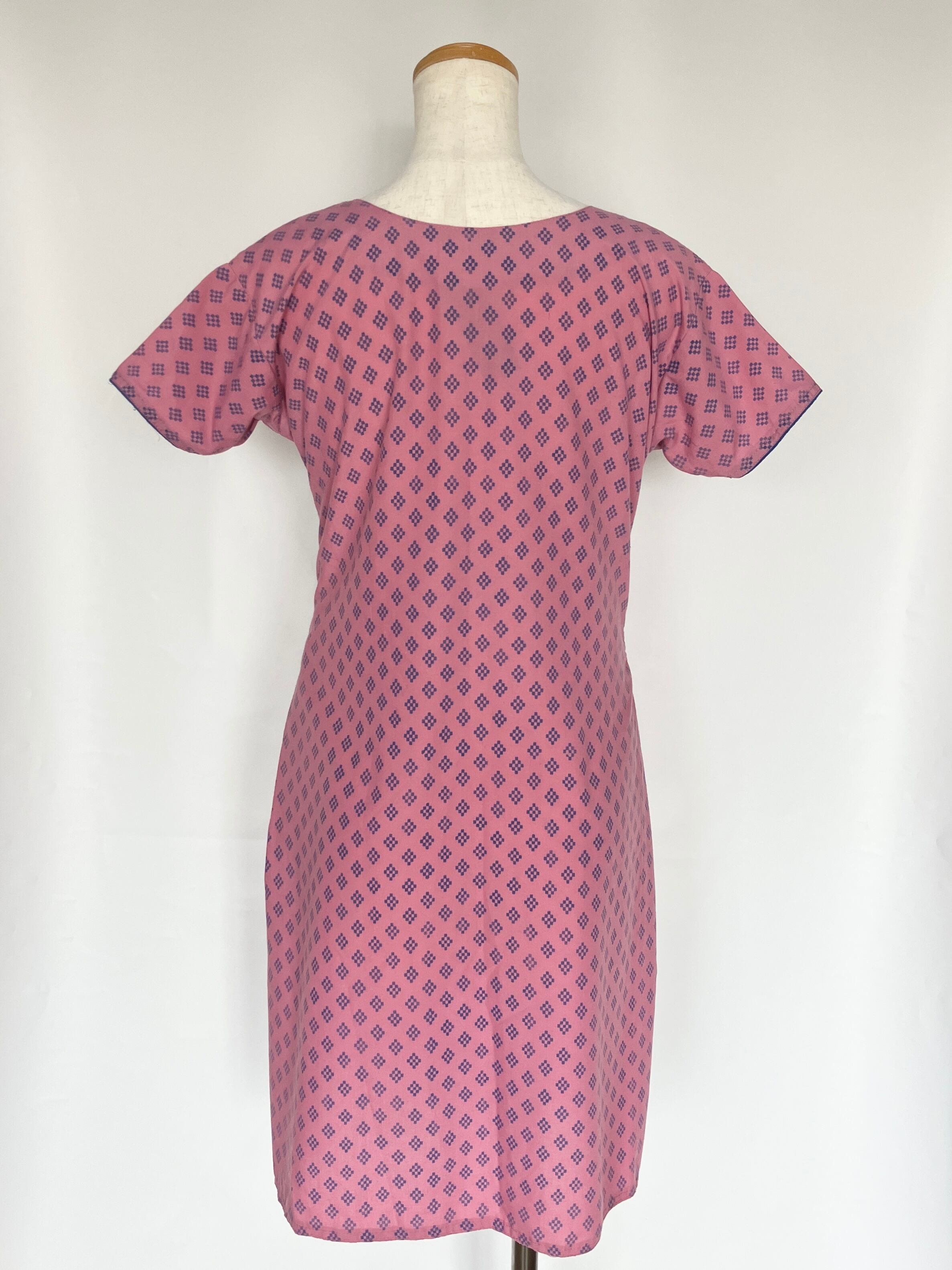 胸元のミラーワークの刺繍がキレイなワンピース。左右の裾に大きめのスリットが入っていて可愛いです。ポケットはありません。