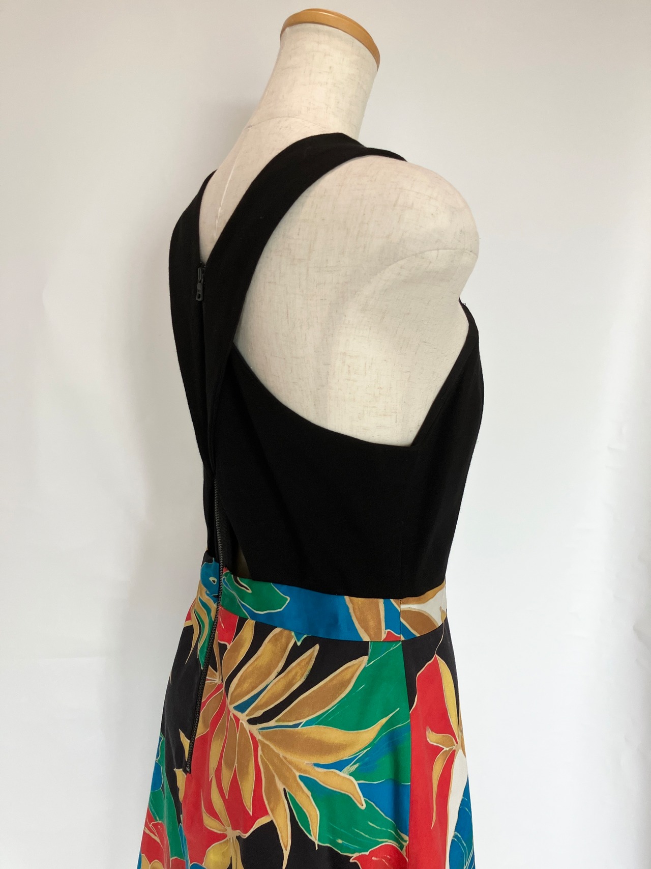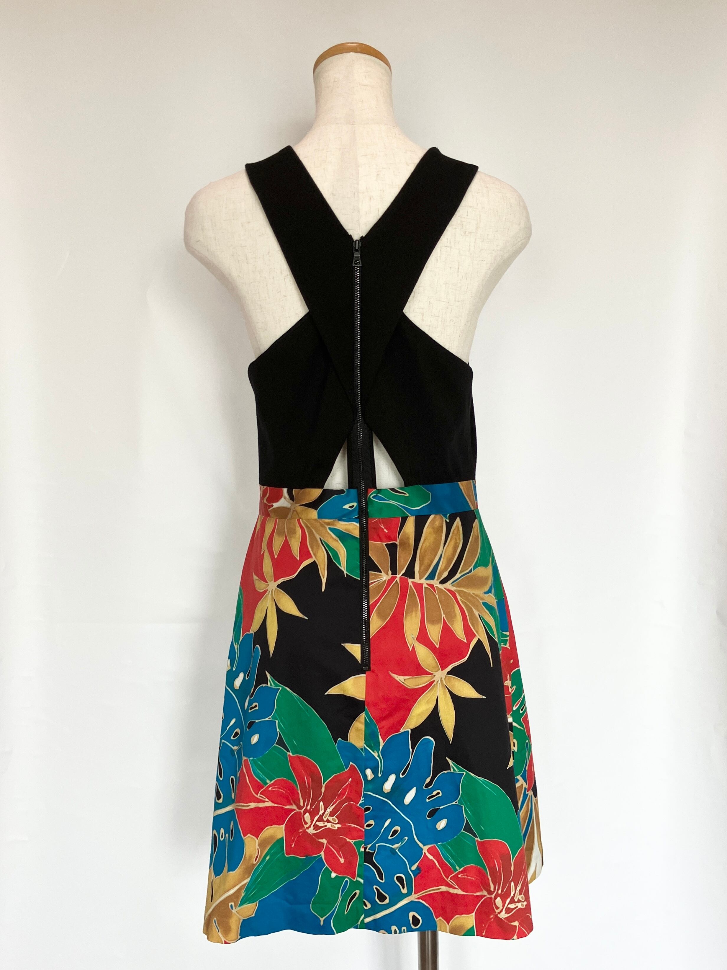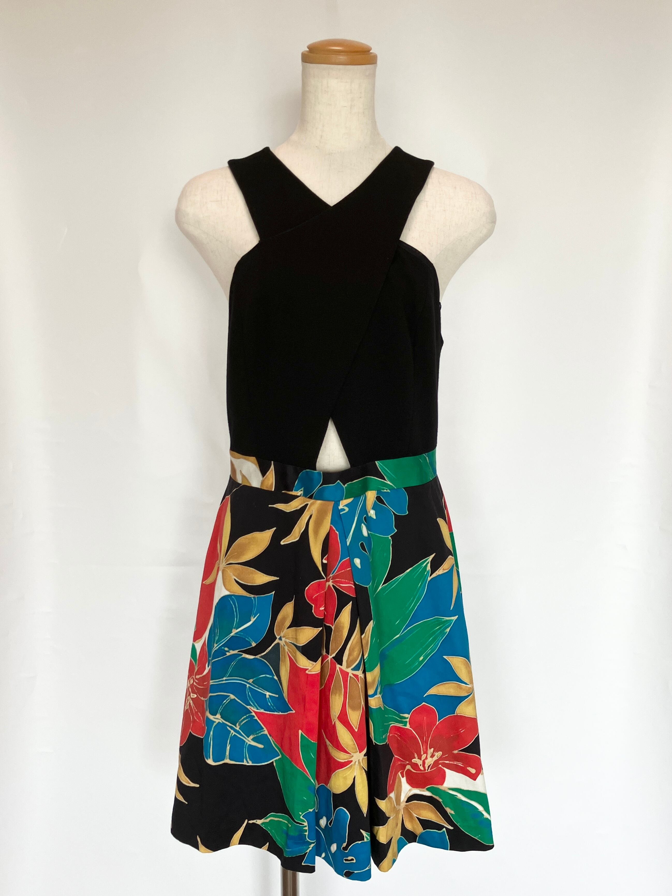 首から胸にかけてクロスした形に加え、胸下部分が開いているデザインが大胆なワンピース。着脱は後ろ身頃にチャックがあります。ポケットはありません。