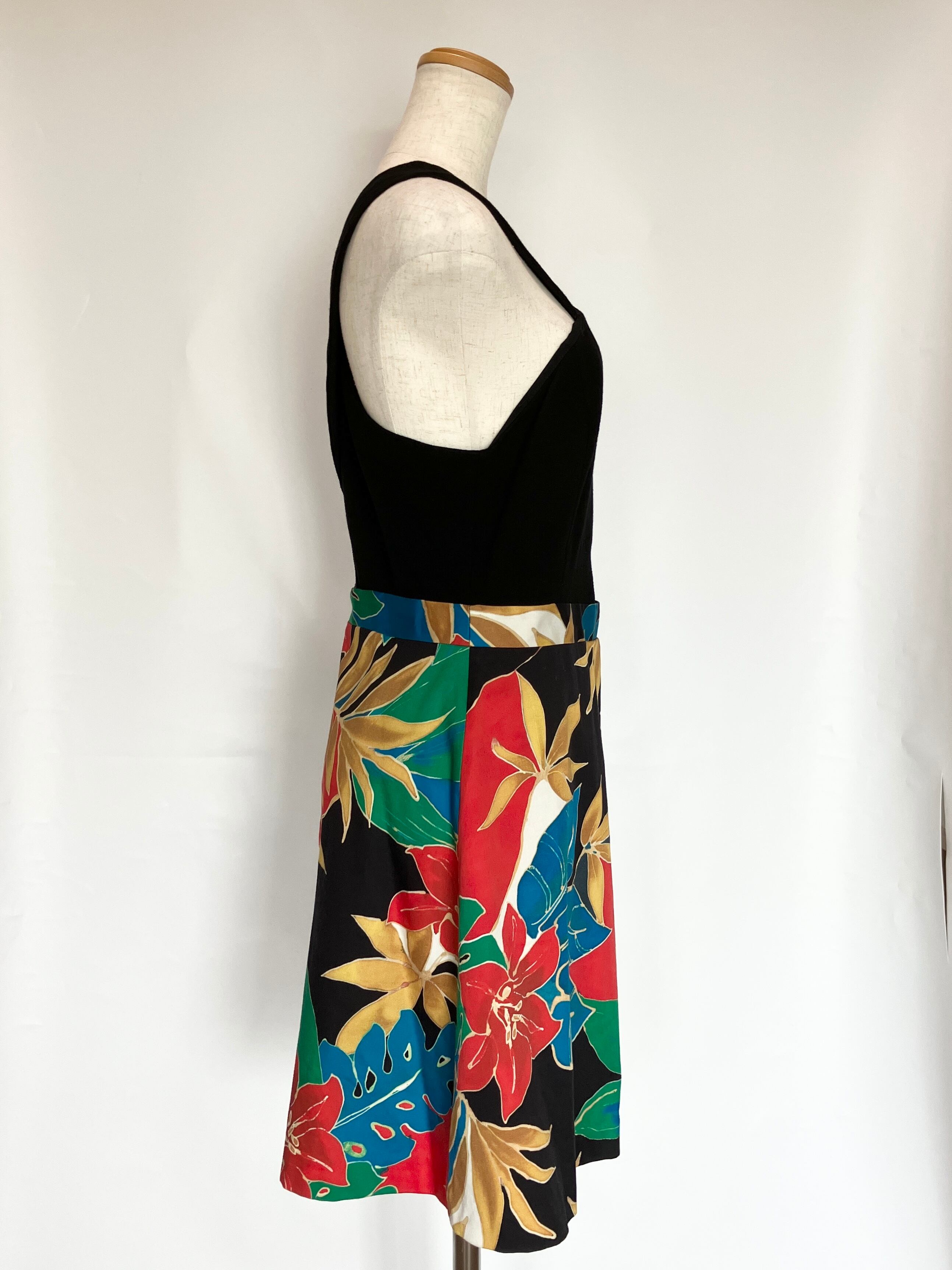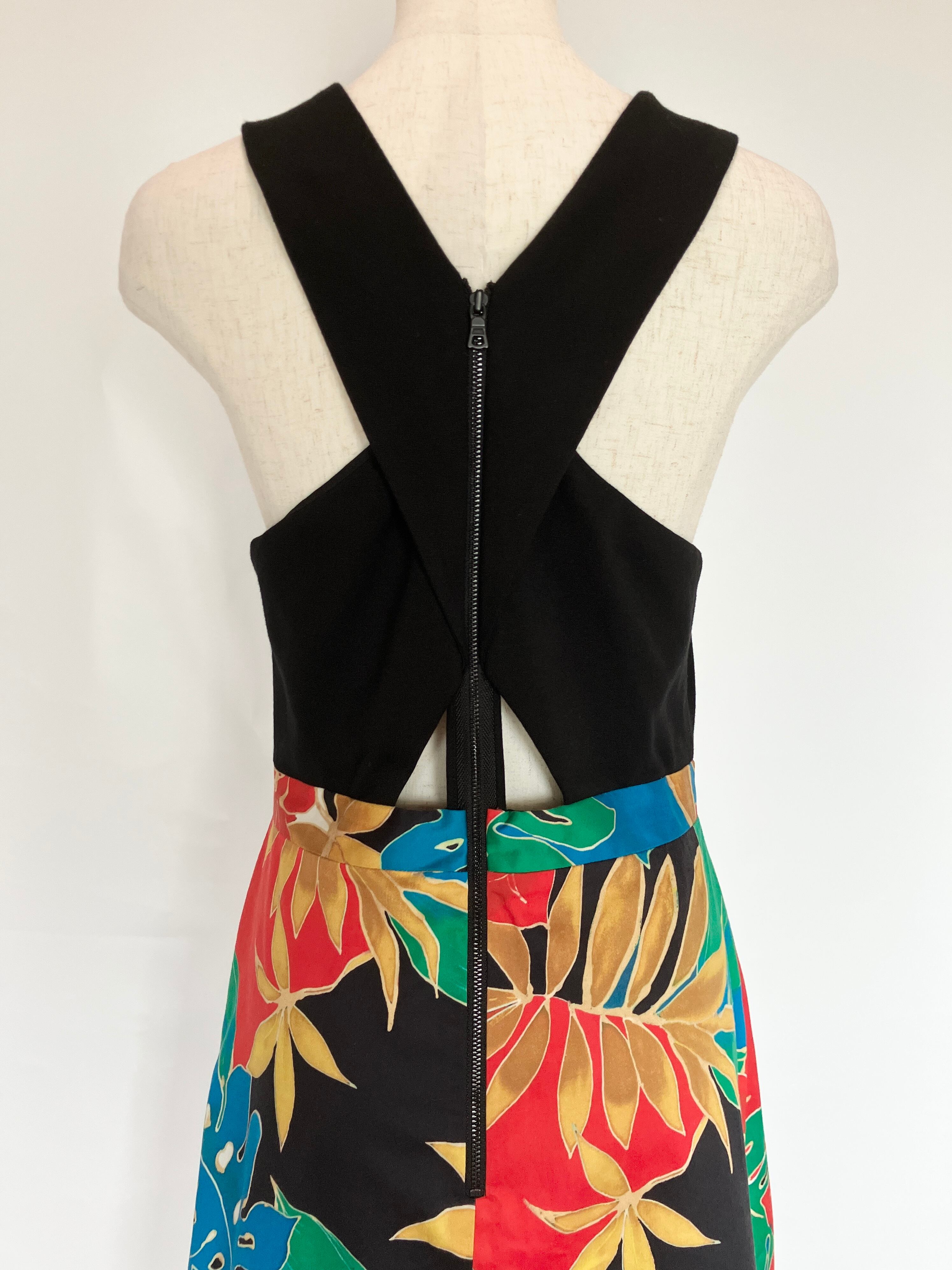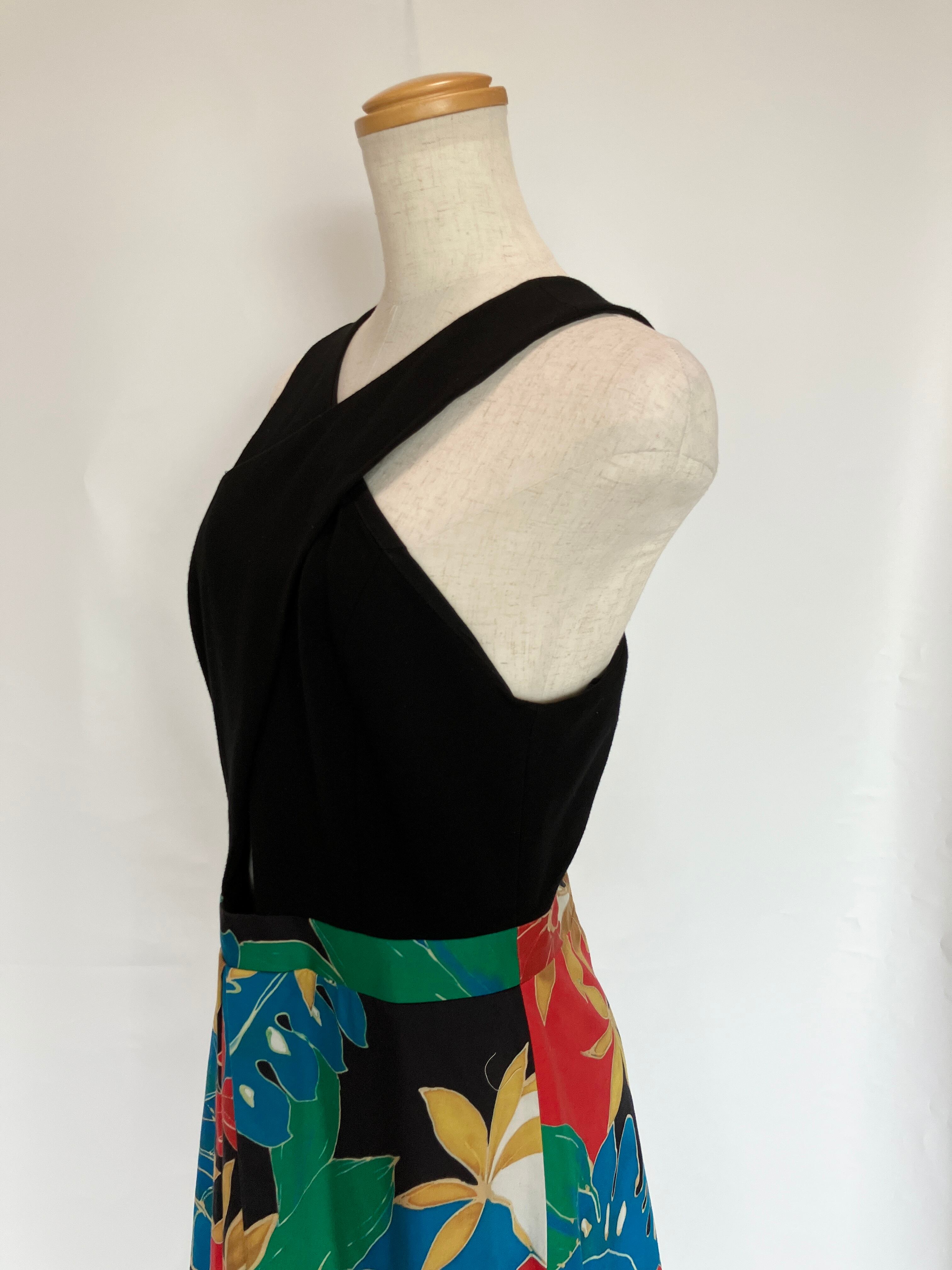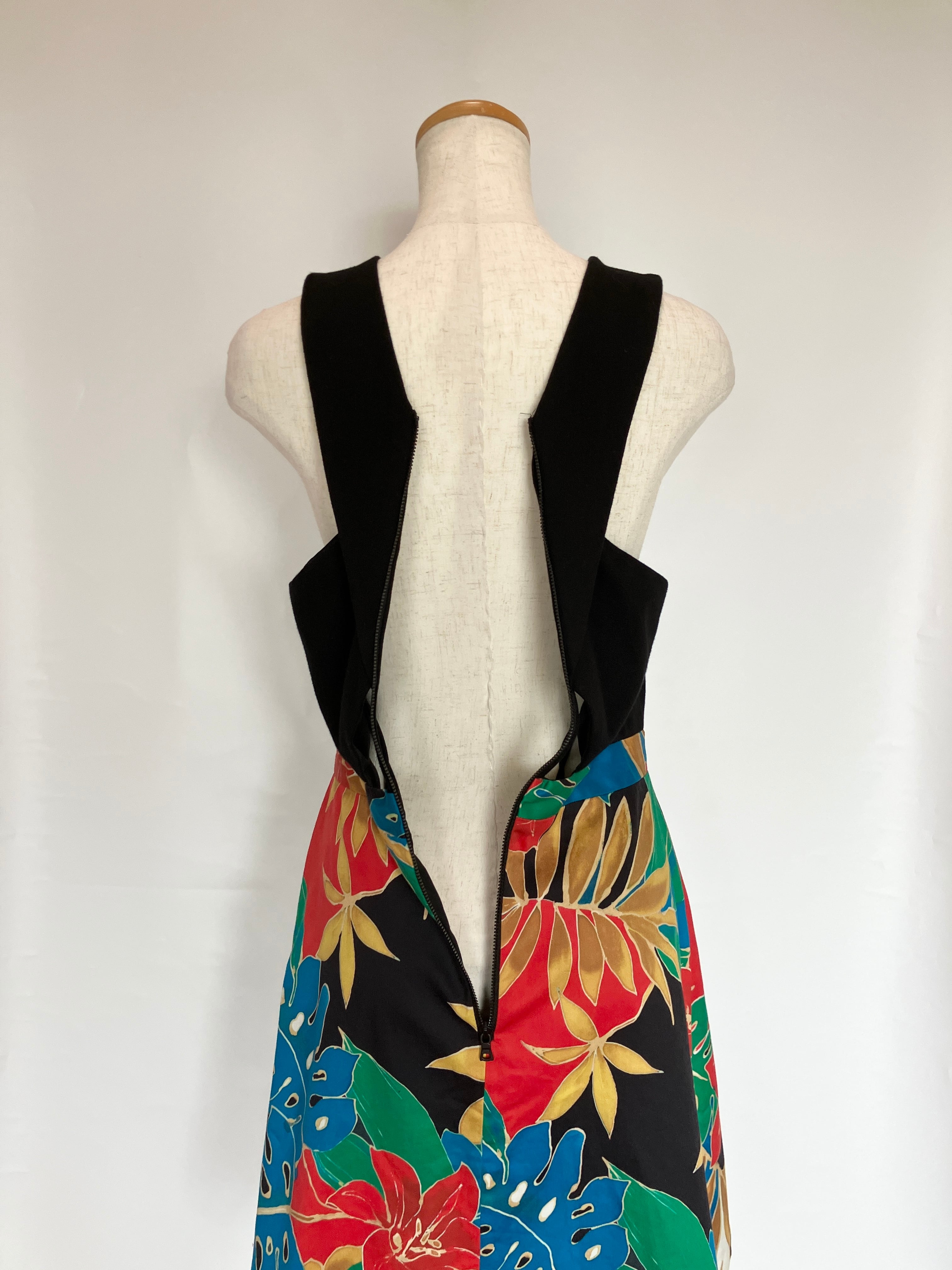 首から胸にかけてクロスした形に加え、胸下部分が開いているデザインが大胆なワンピース。着脱は後ろ身頃にチャックがあります。ポケットはありません。